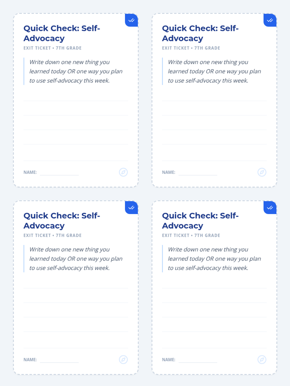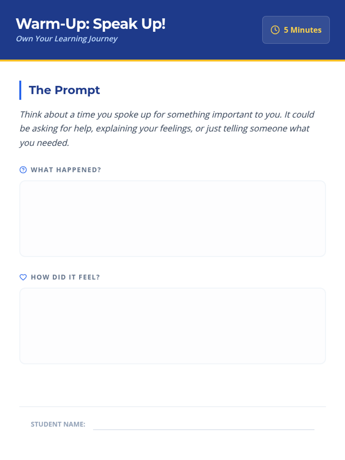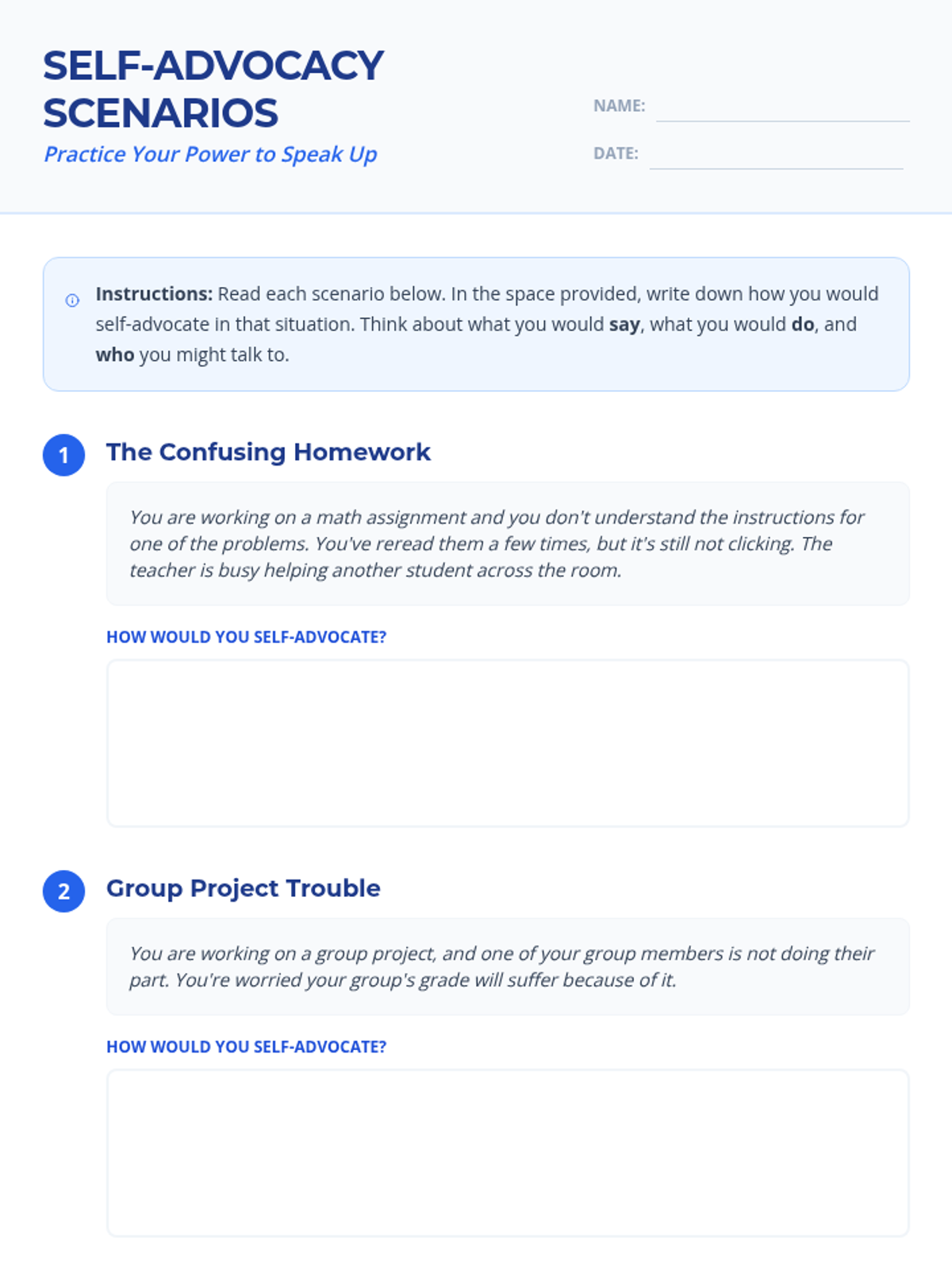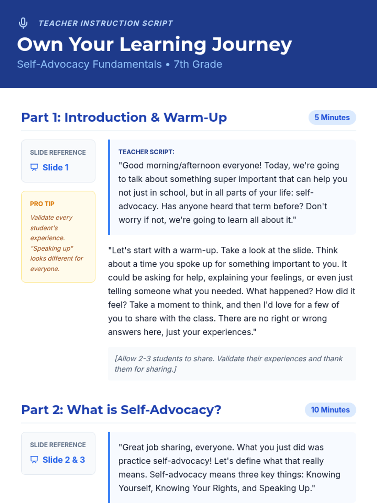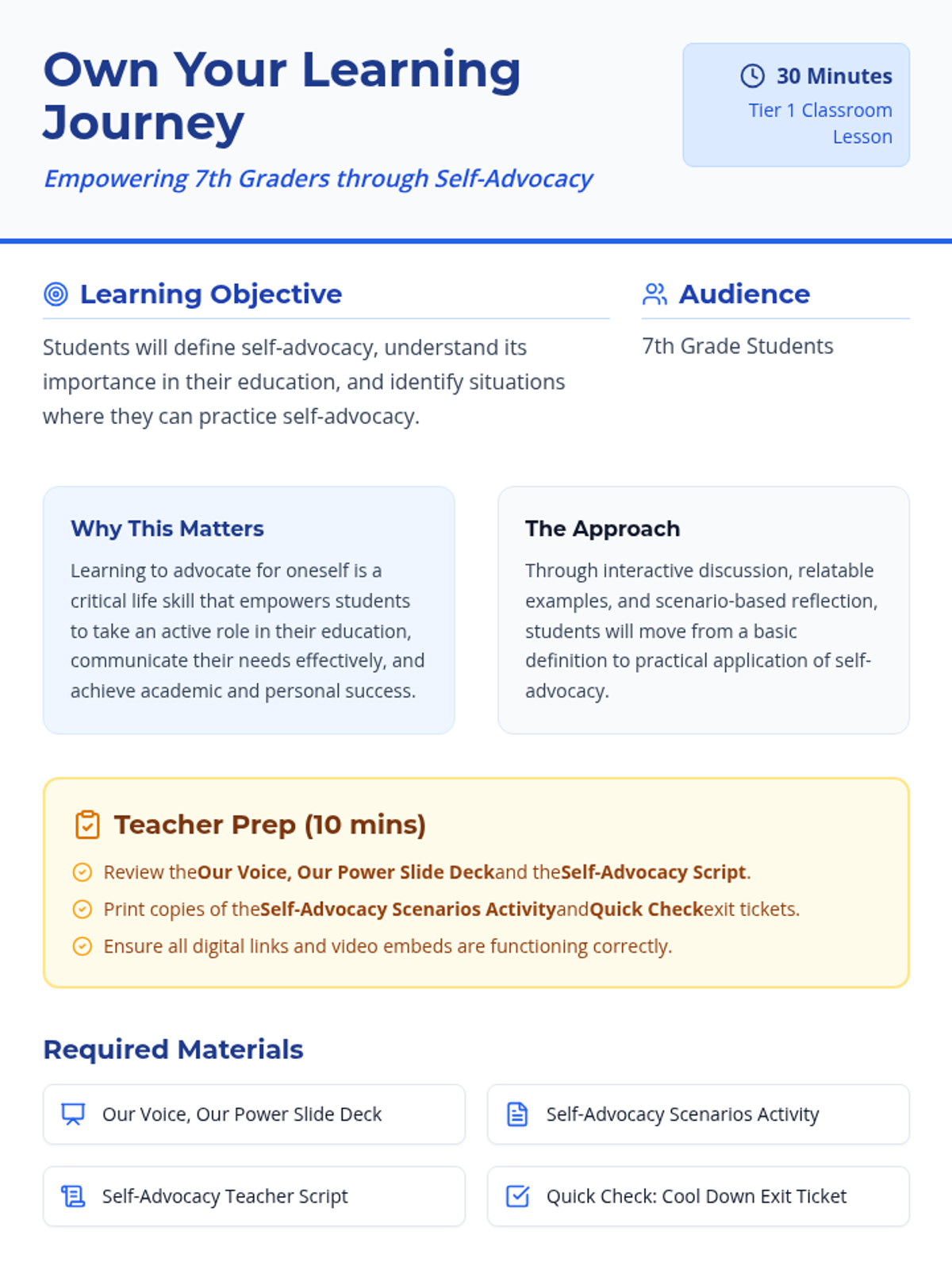 A 30-minute lesson for 7th graders that introduces self-advocacy as a key skill for taking charge of their education. Students learn to define the concept, identify its importance, and practice speaking up for their needs in common school scenarios.