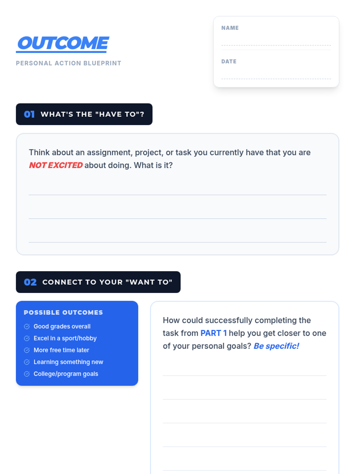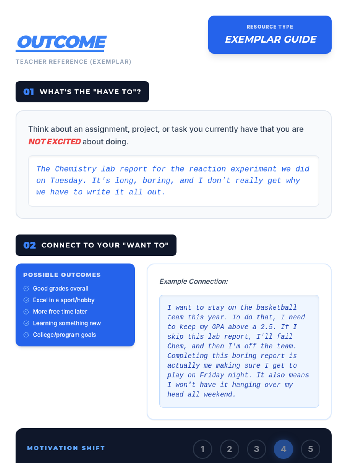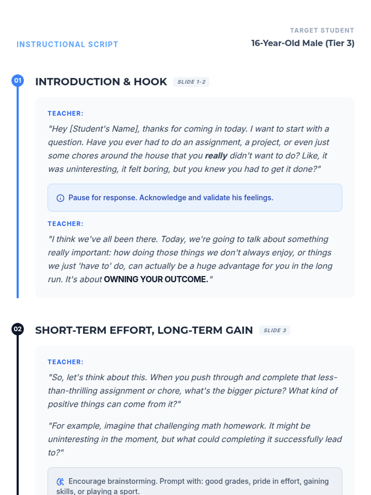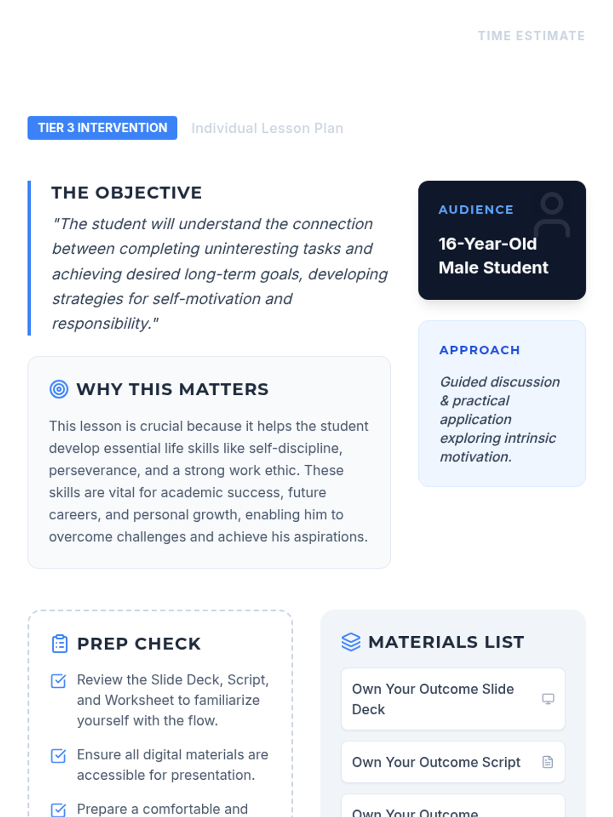 A 15-minute Tier 3 individual lesson designed for a 16-year-old male student to bridge the gap between uninteresting daily tasks and long-term personal goals through self-discipline and internal motivation.