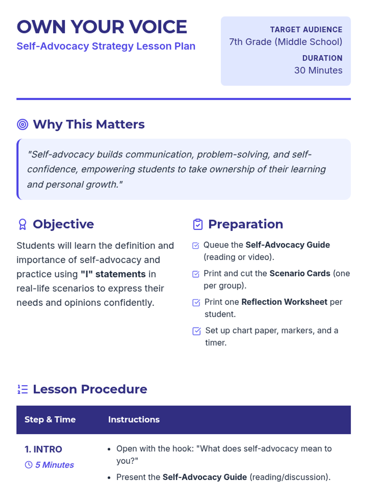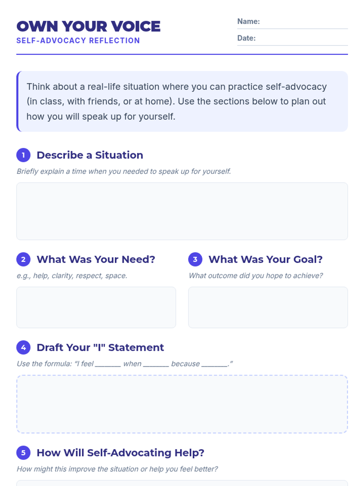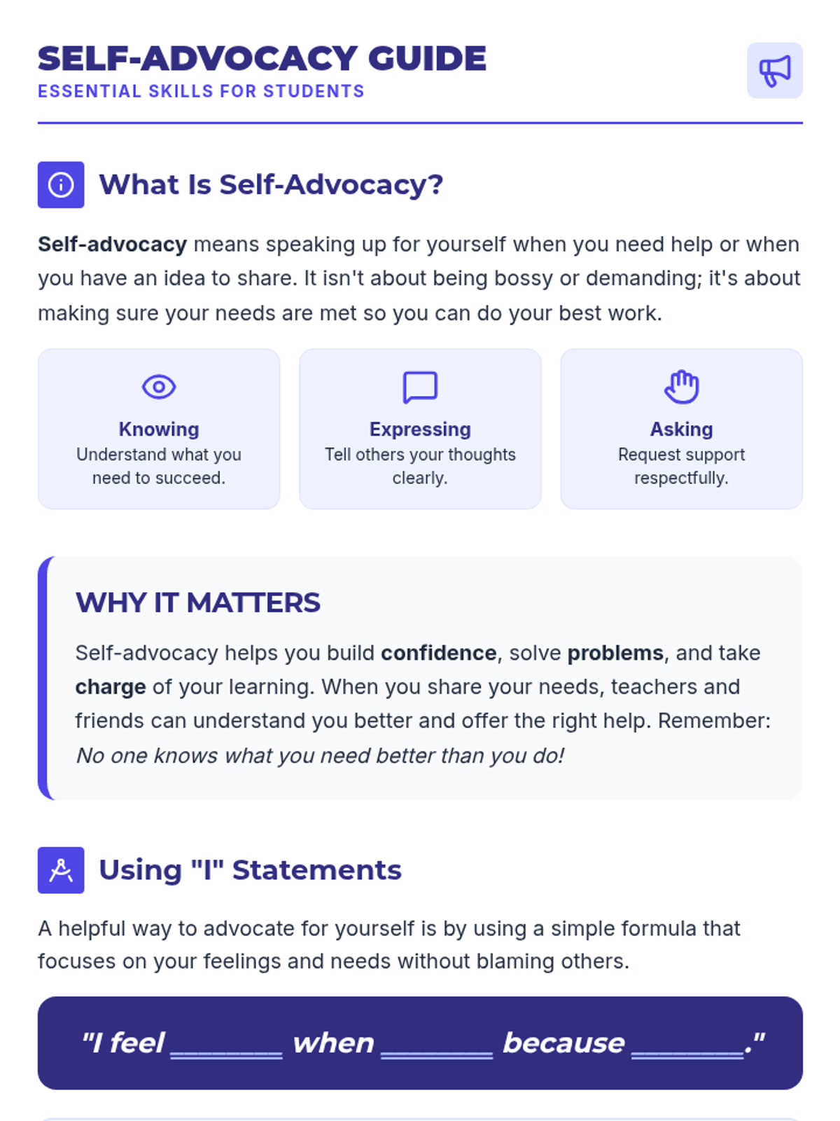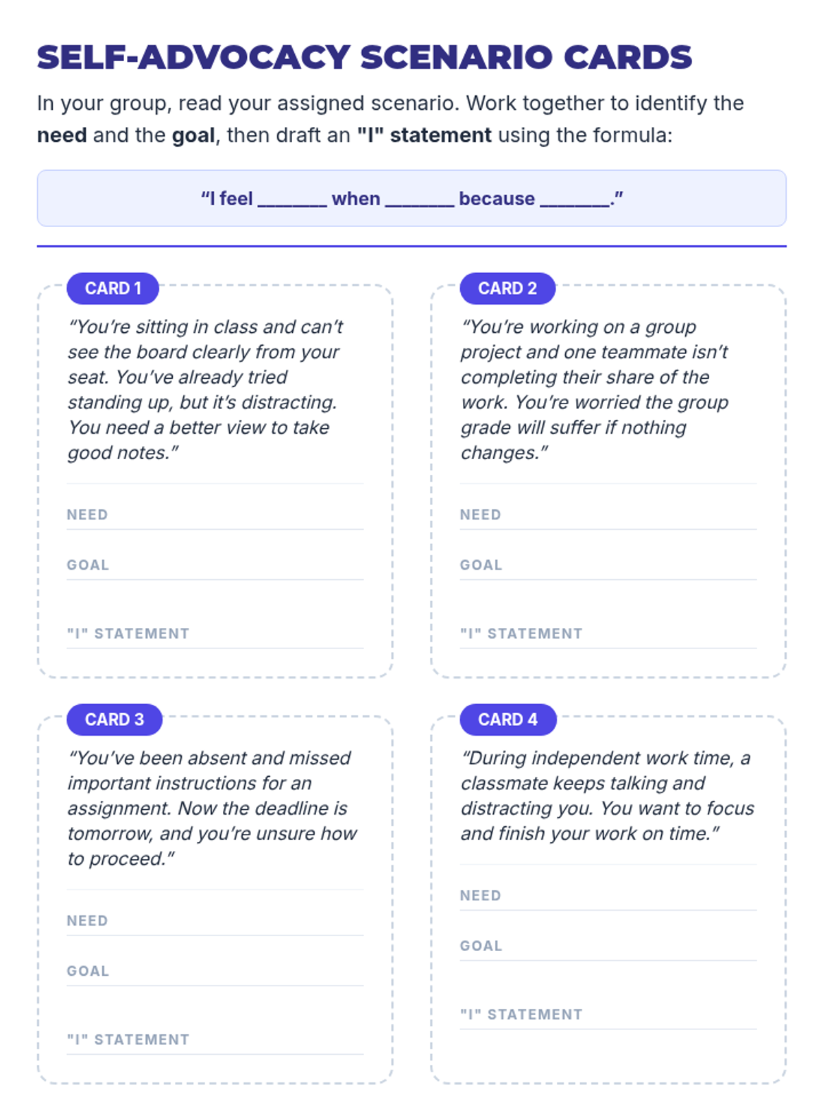 A 30-minute Tier 1 lesson for 7th-grade students to learn and practice self-advocacy skills using "I" statements to confidently express their needs.