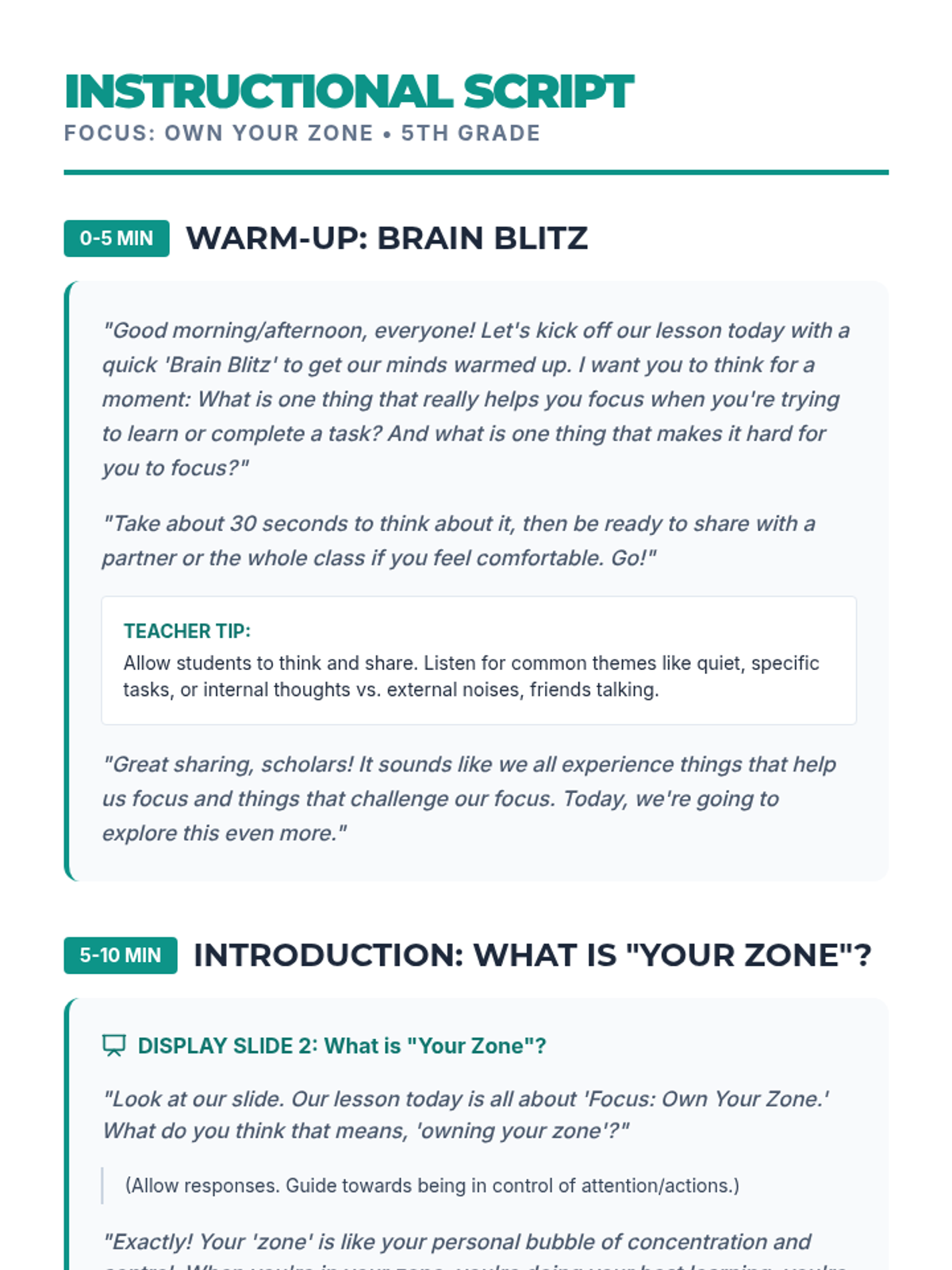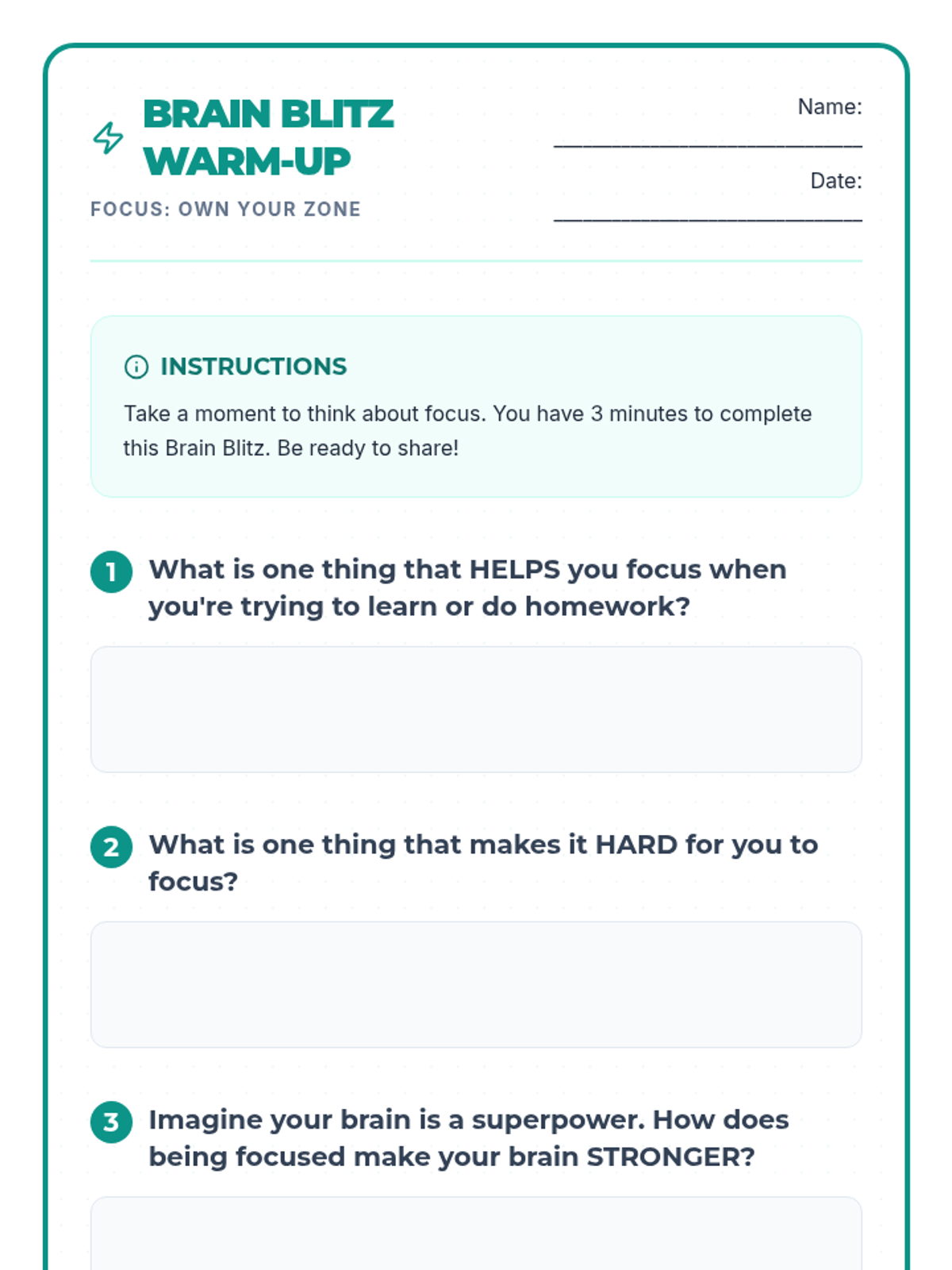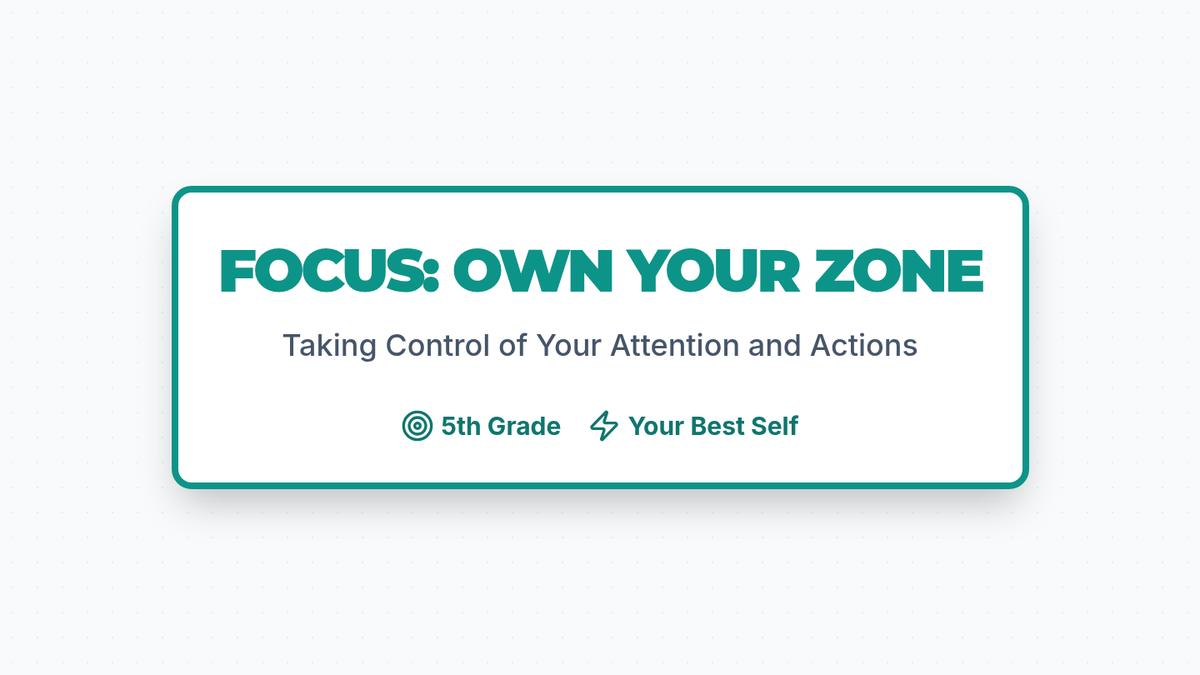 A 30-minute social-emotional learning lesson for 5th-grade students to develop self-control and focus strategies. Students explore the concept of 'owning their zone' through reflection and blueprint-style planning.