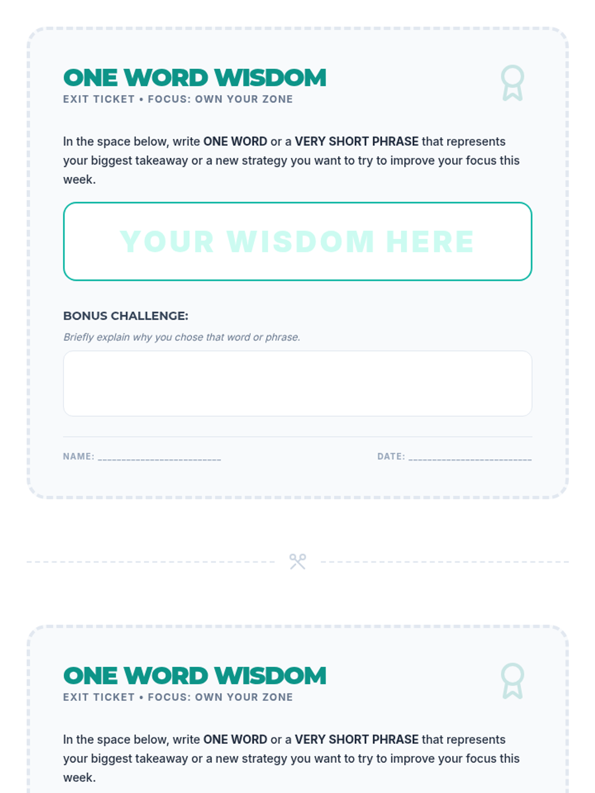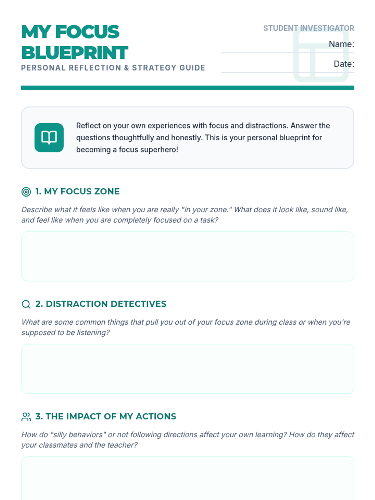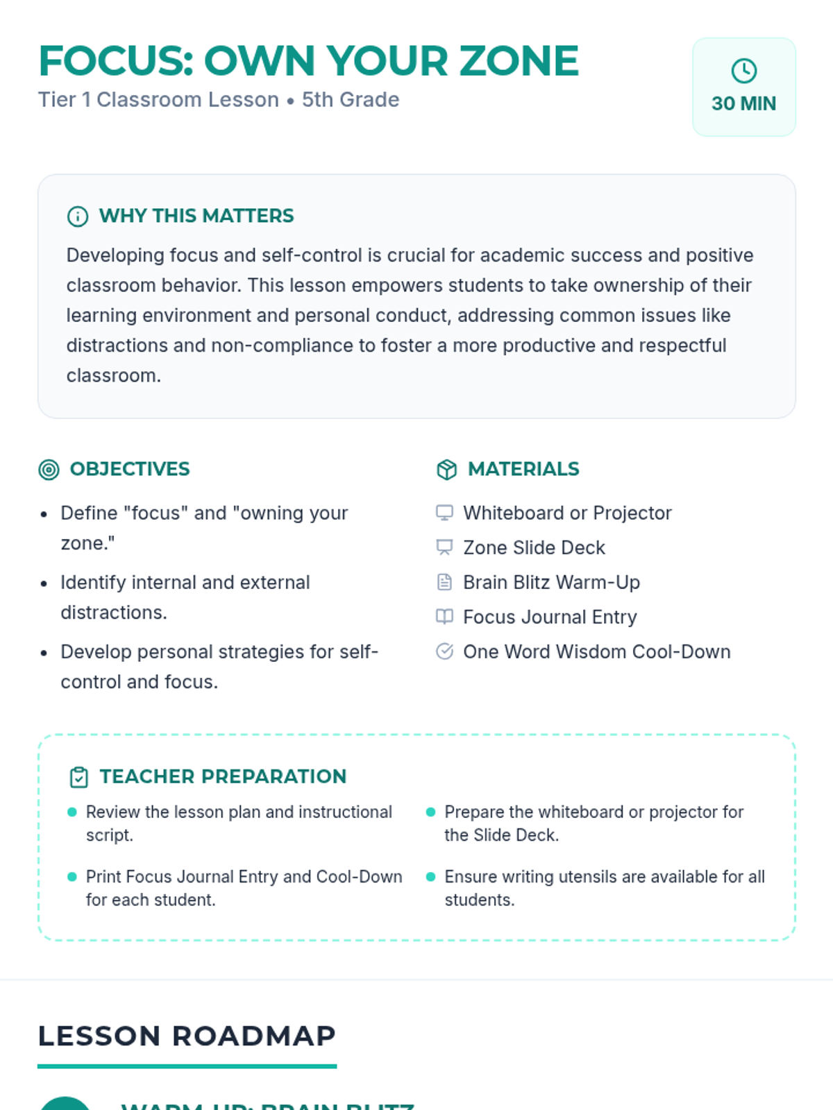A 30-minute social-emotional learning lesson for 5th-grade students to develop self-control and focus strategies. Students explore the concept of 'owning their zone' through reflection and blueprint-style planning.
