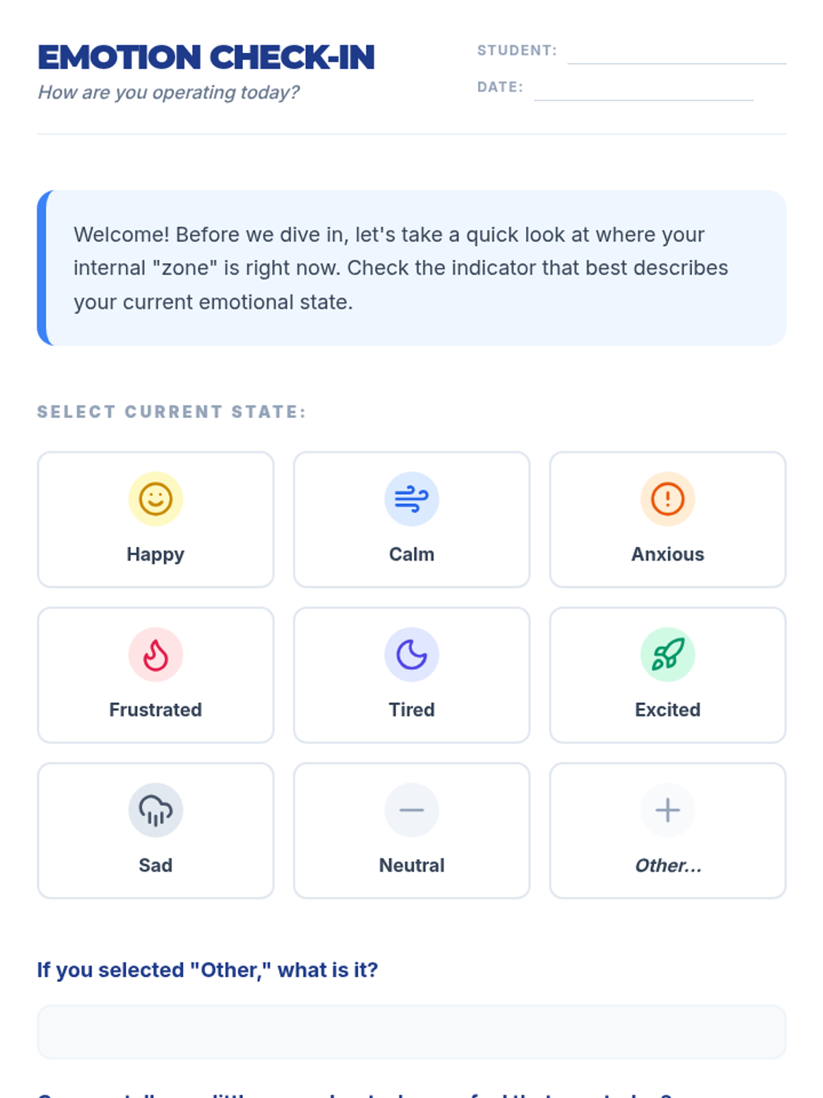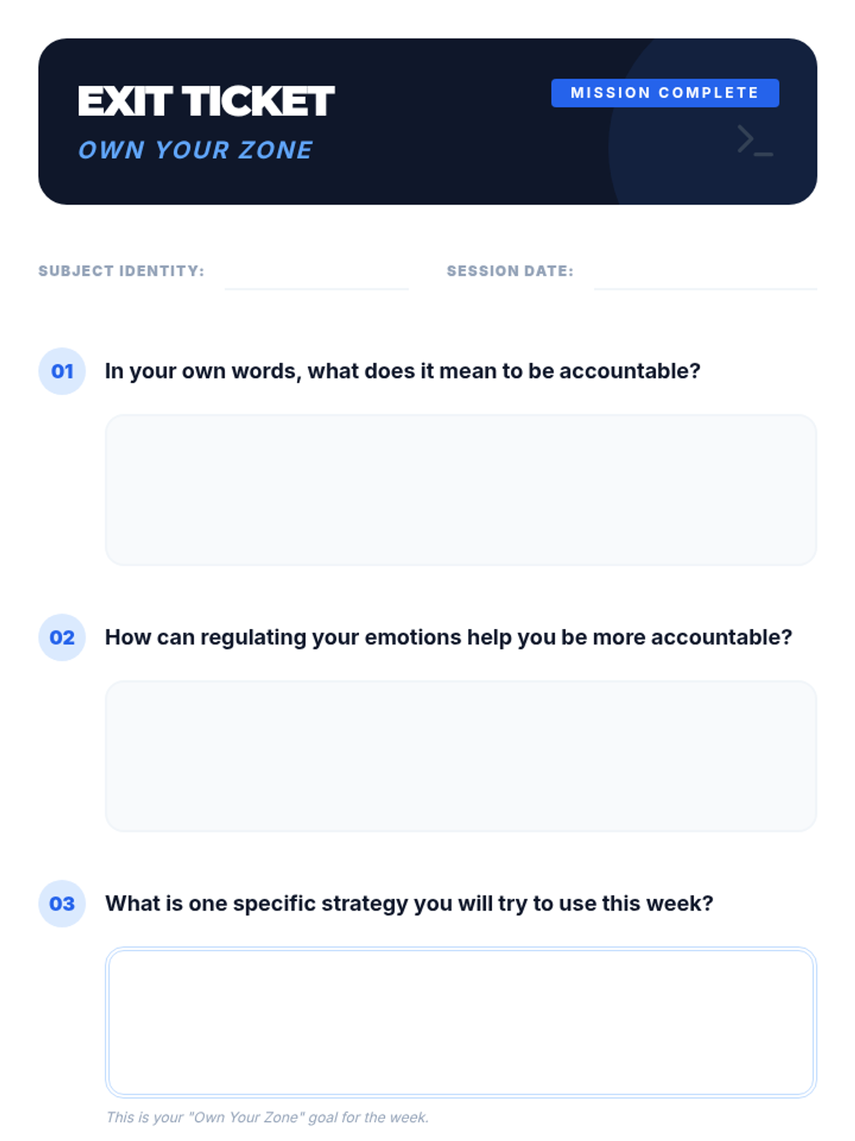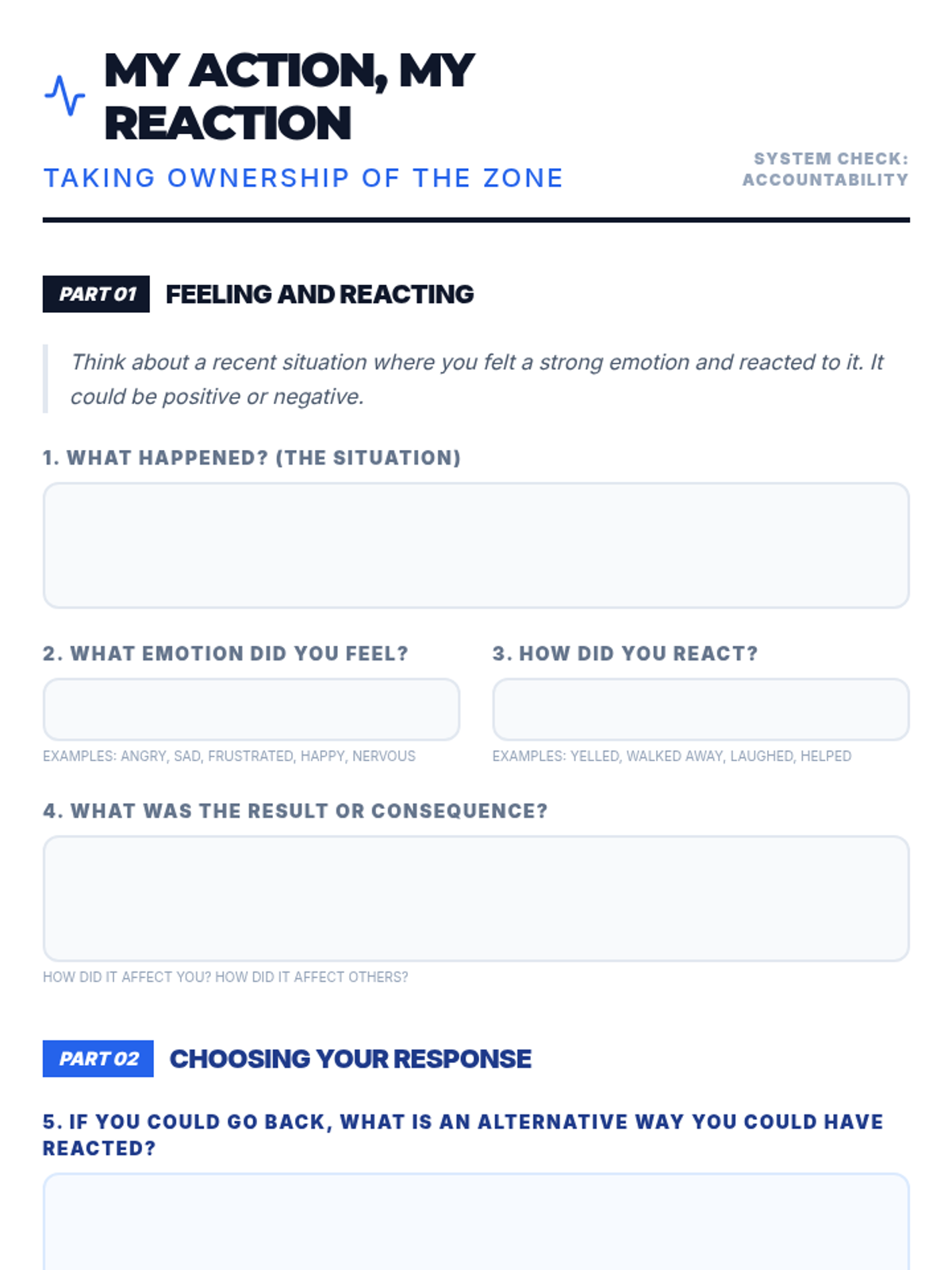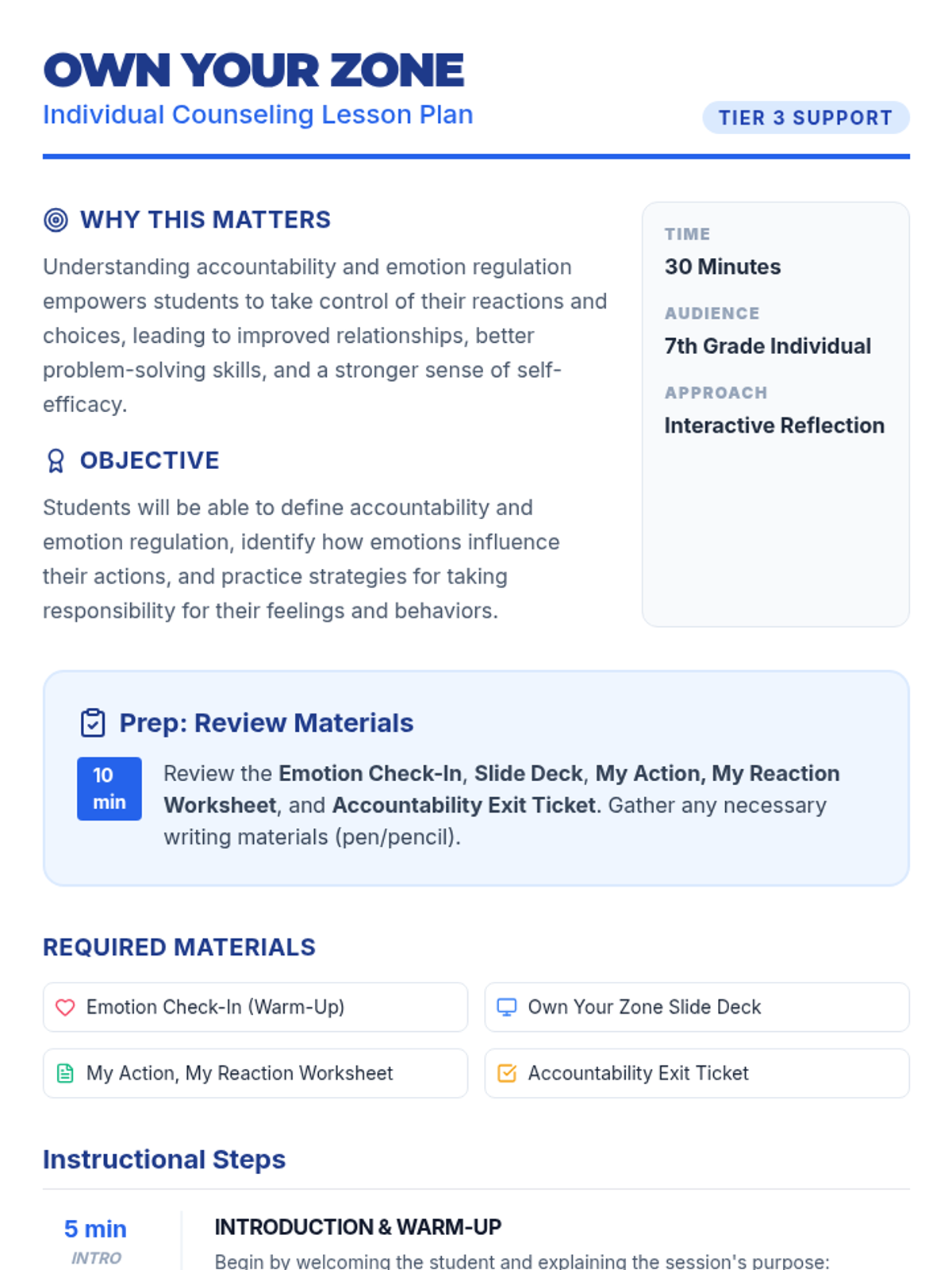 A 30-minute individual counseling session for 7th-grade students focusing on accountability and emotion regulation. Students learn to connect their feelings to their actions and develop strategies for responsible responding.