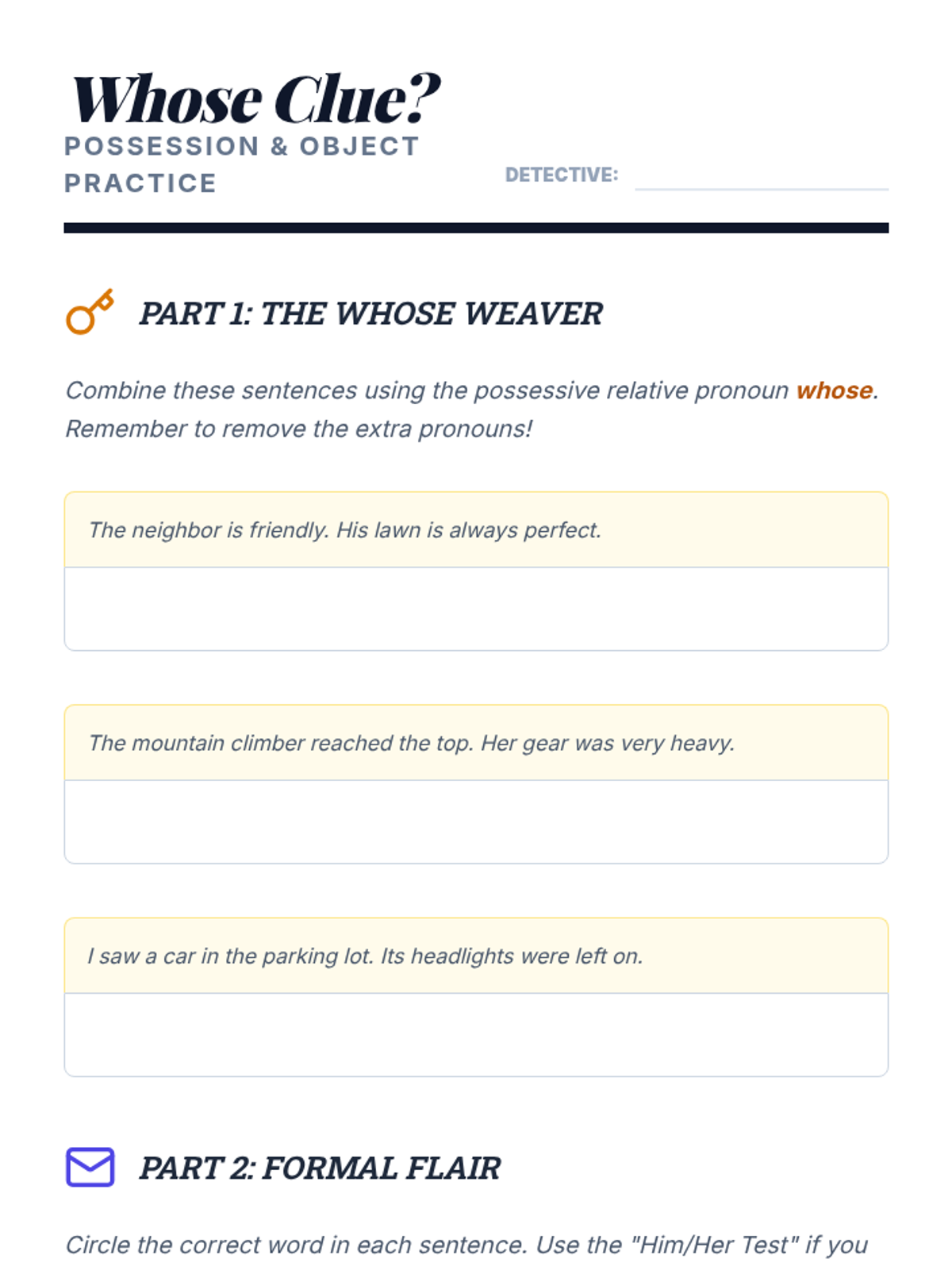 An exploration of more advanced relative pronouns, focusing on the possessive 'whose' and the formal 'whom' within specific context-rich sentences.
