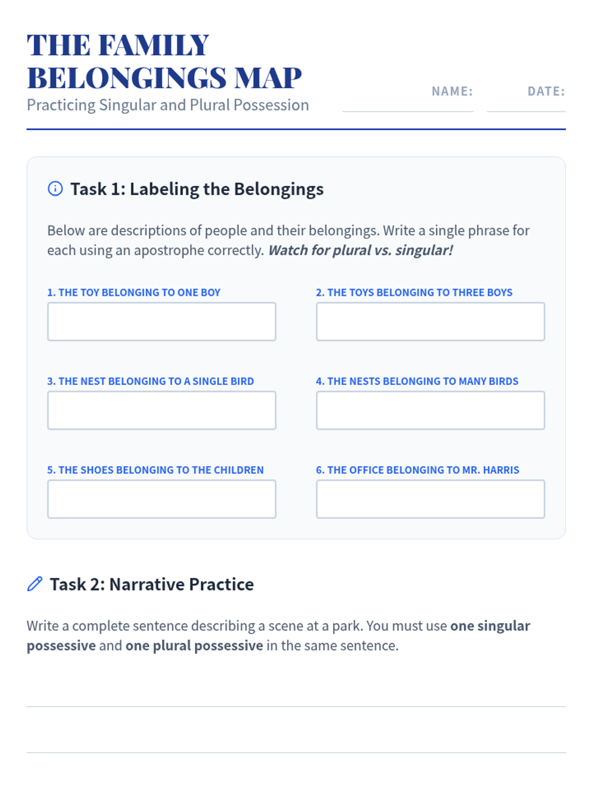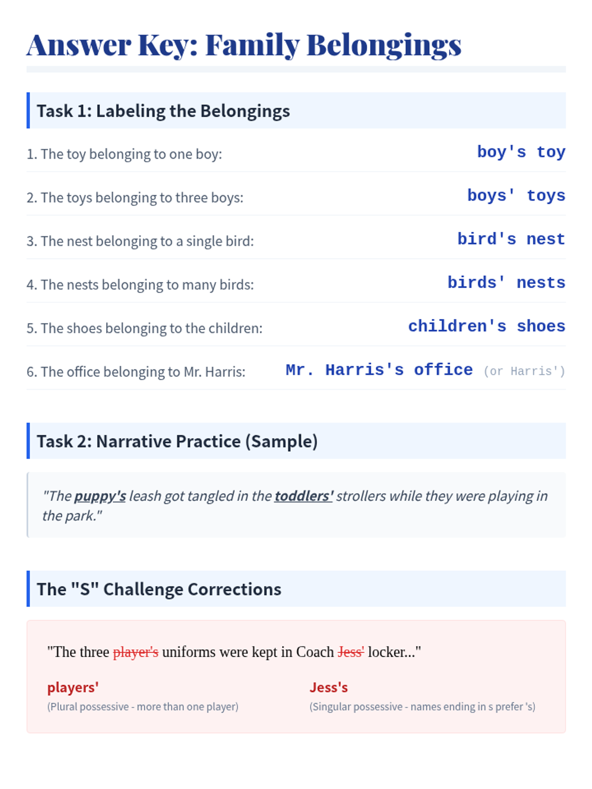 Focuses on the distinct rules for making singular and plural nouns possessive, including names ending in 's'.