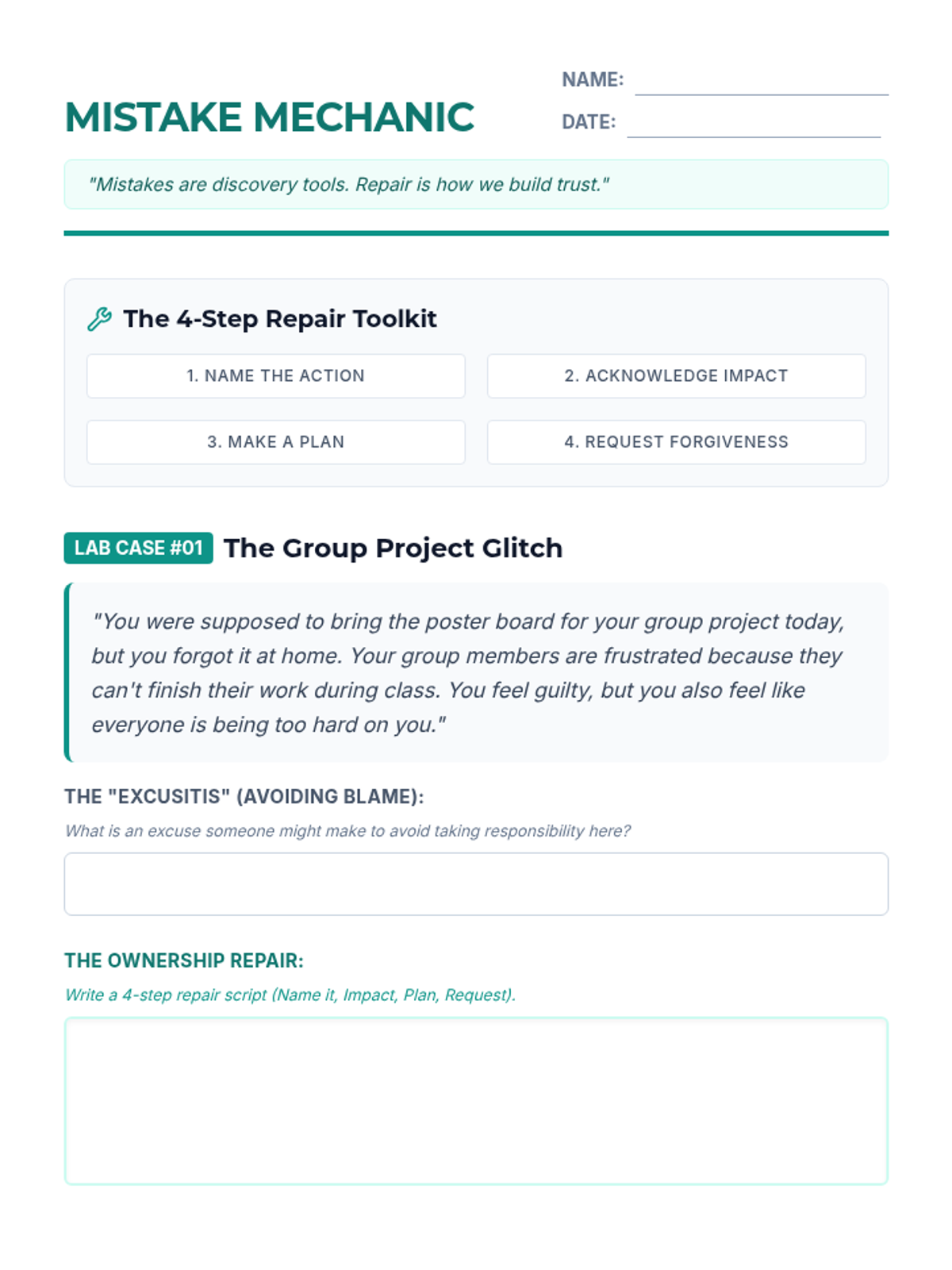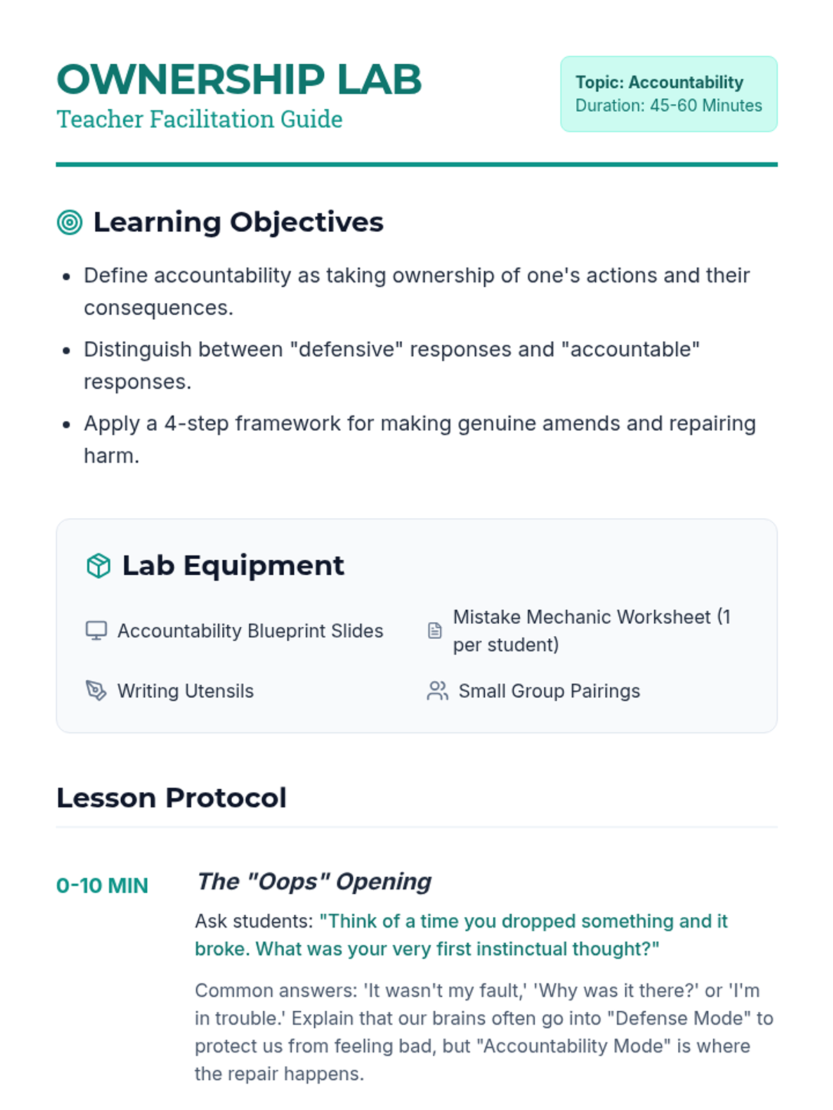 A social-emotional learning lesson focused on identifying personal responsibility and practicing restorative strategies to repair harm after mistakes.