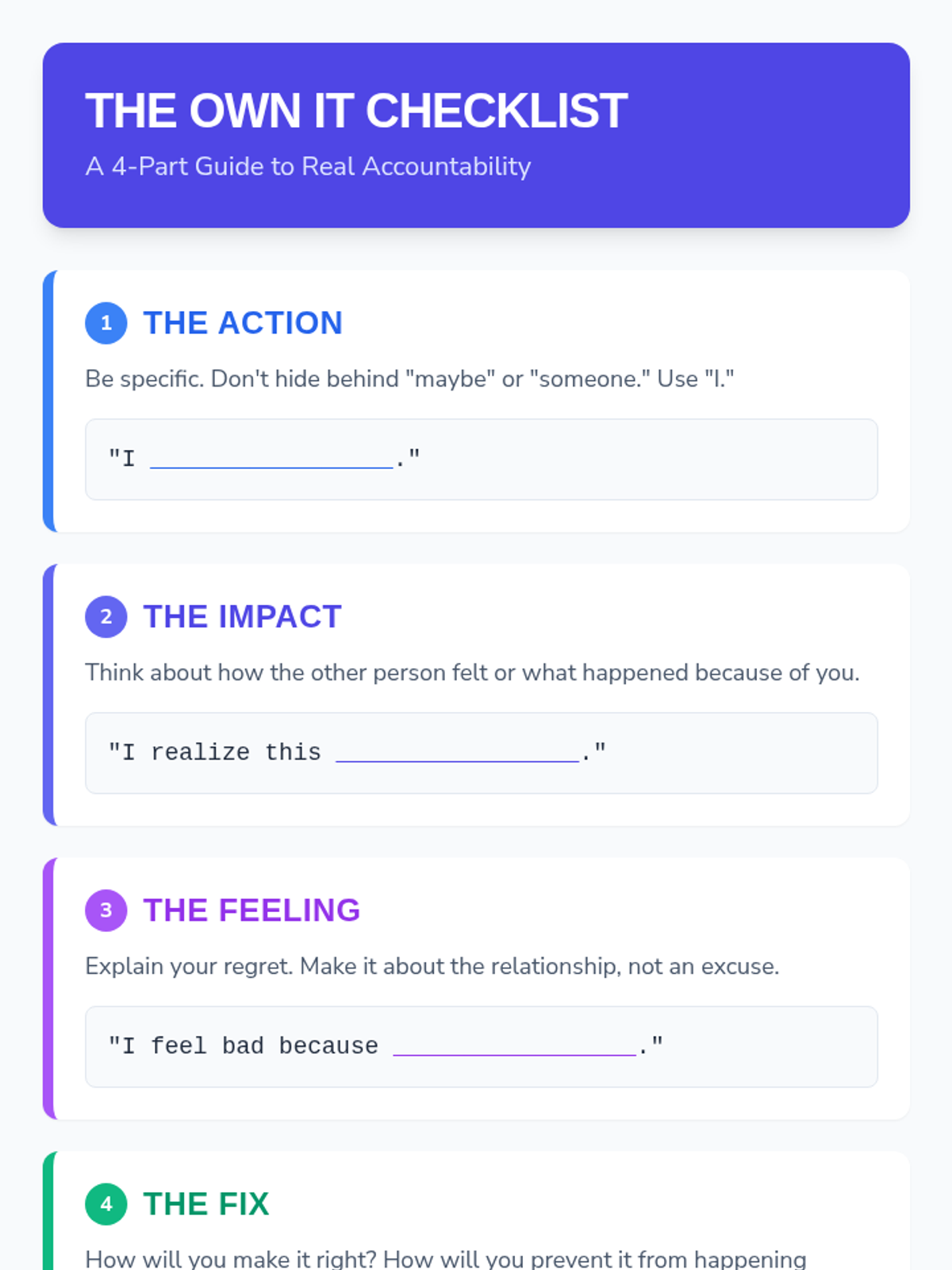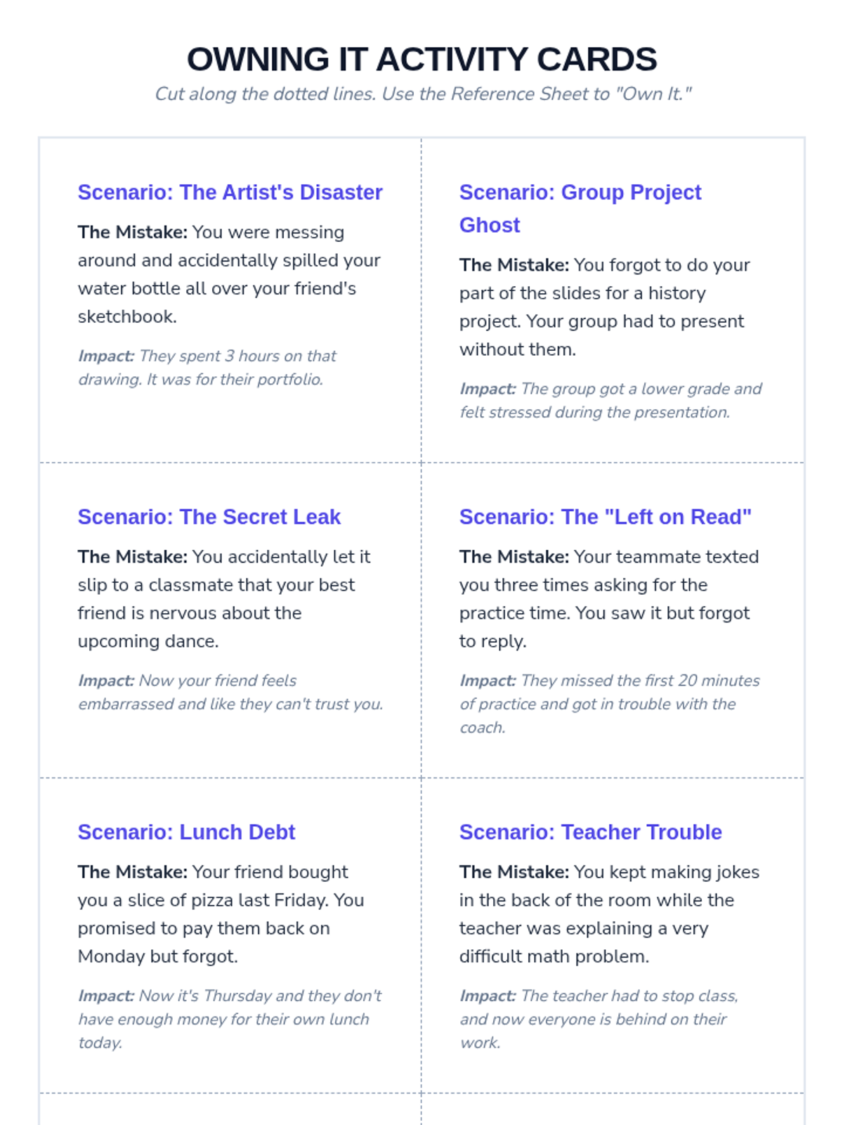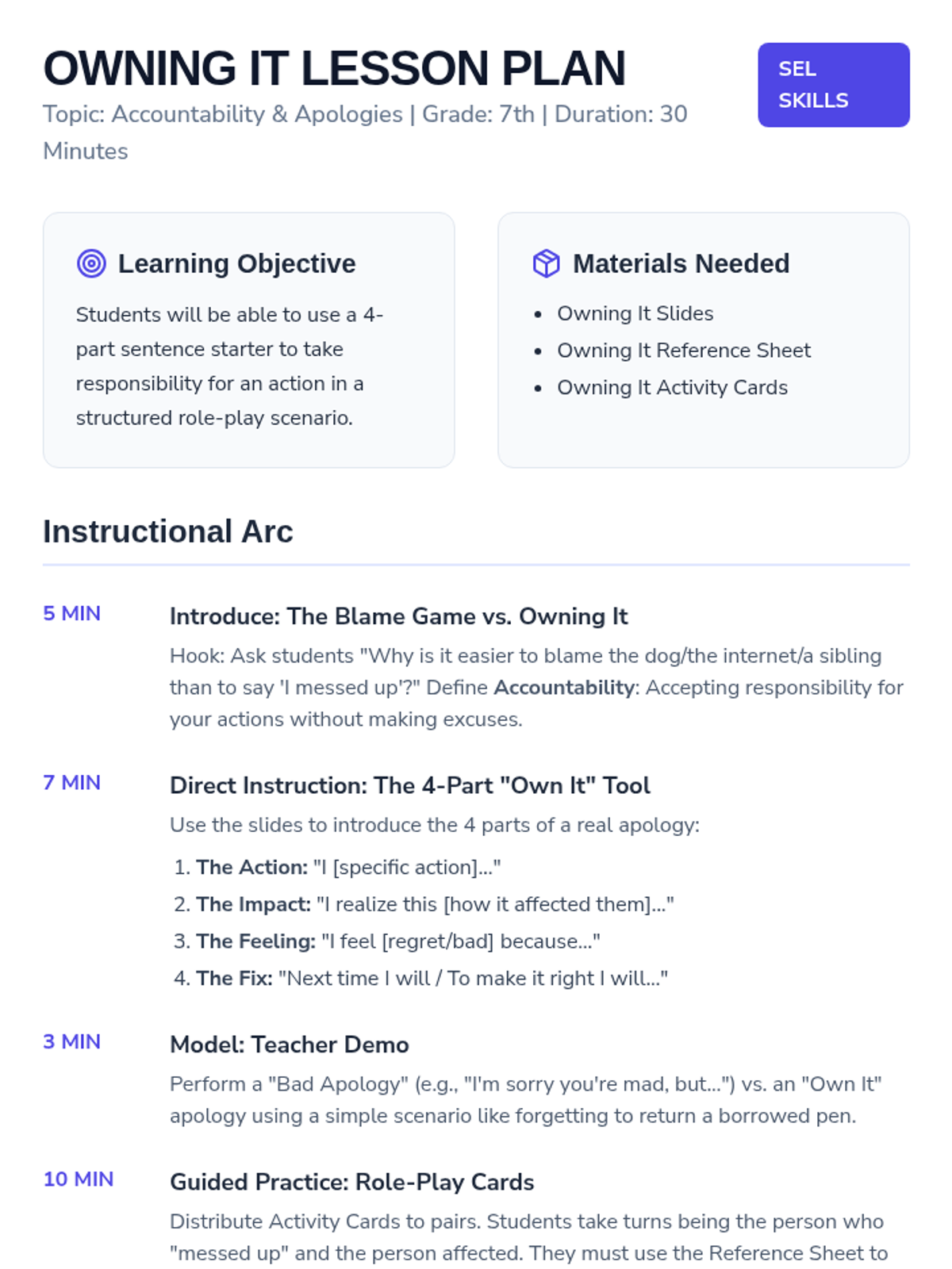 A 30-minute social-emotional learning lesson for 7th graders on taking accountability. Students learn a four-part structure for apologizing and practice through relatable role-play scenarios.