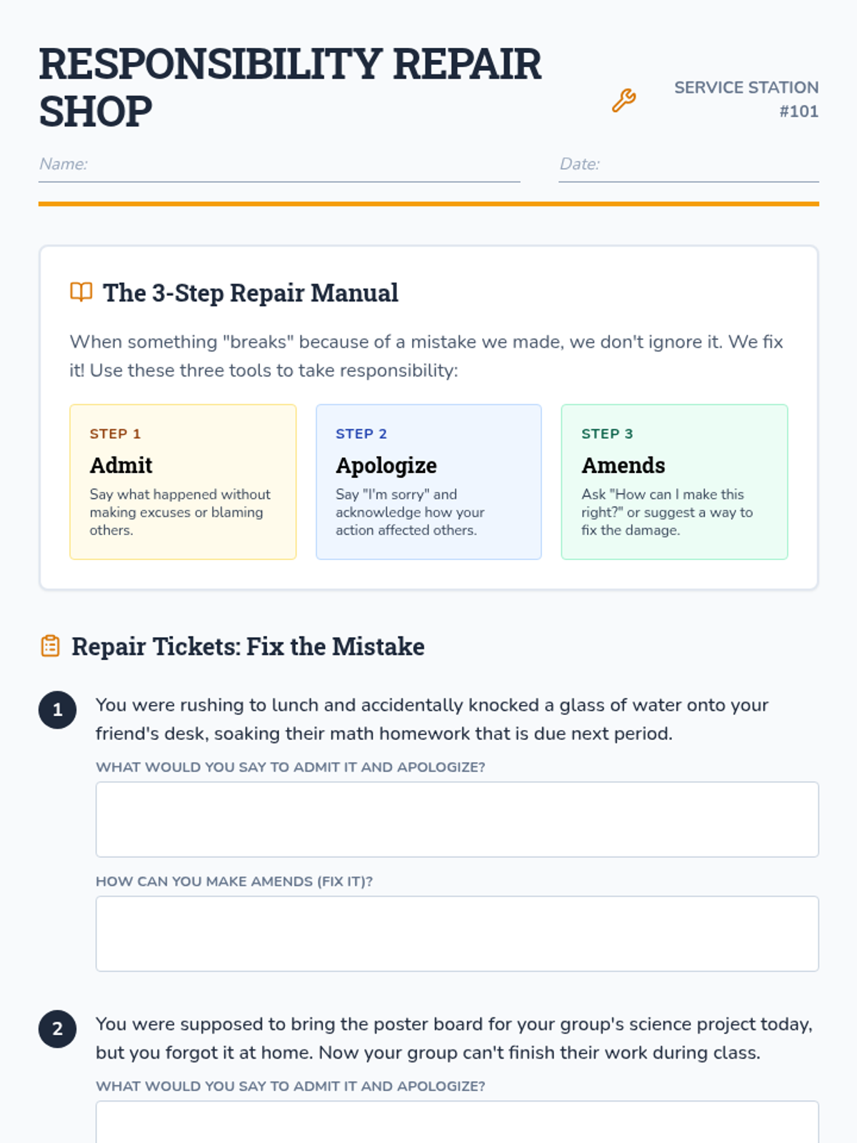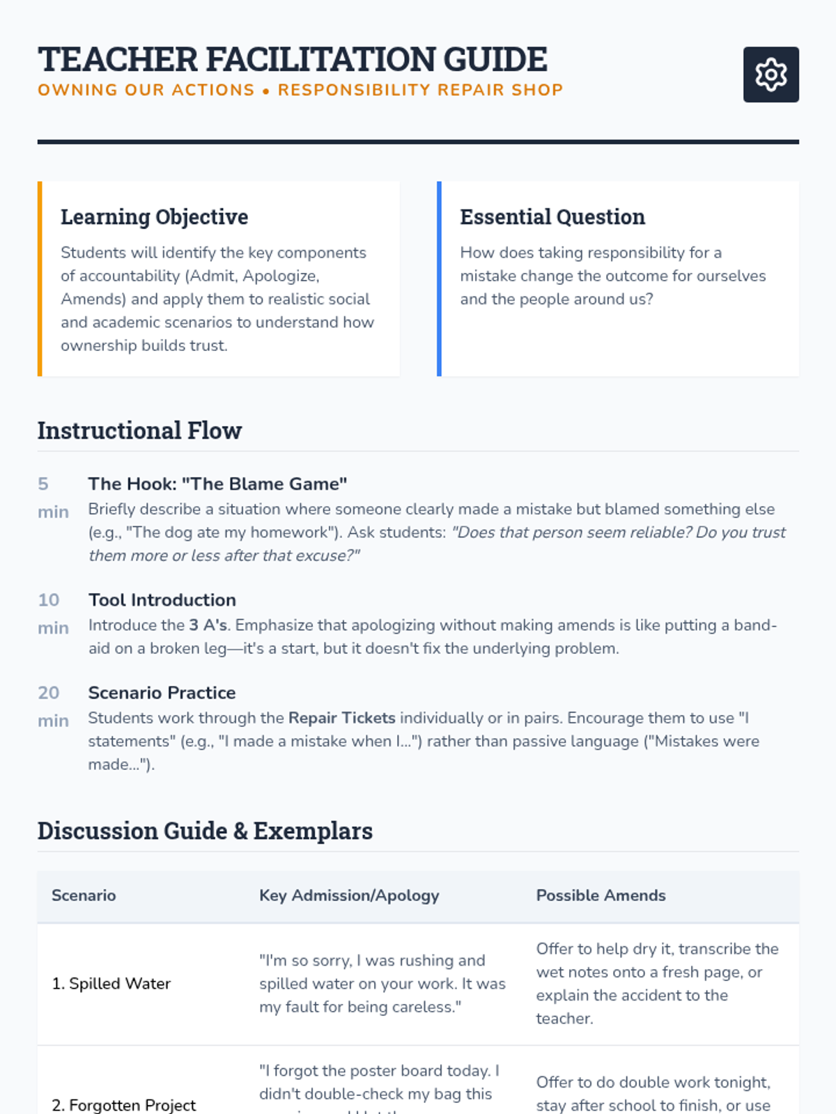 A lesson focused on developing accountability by teaching students how to own their mistakes and make amends through realistic scenarios and reflection.