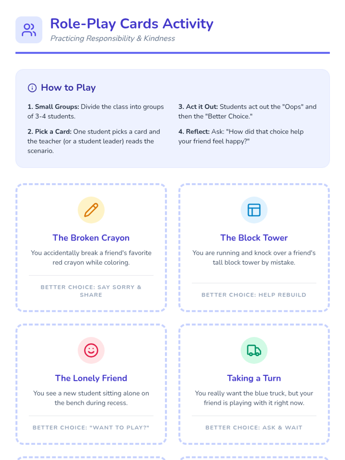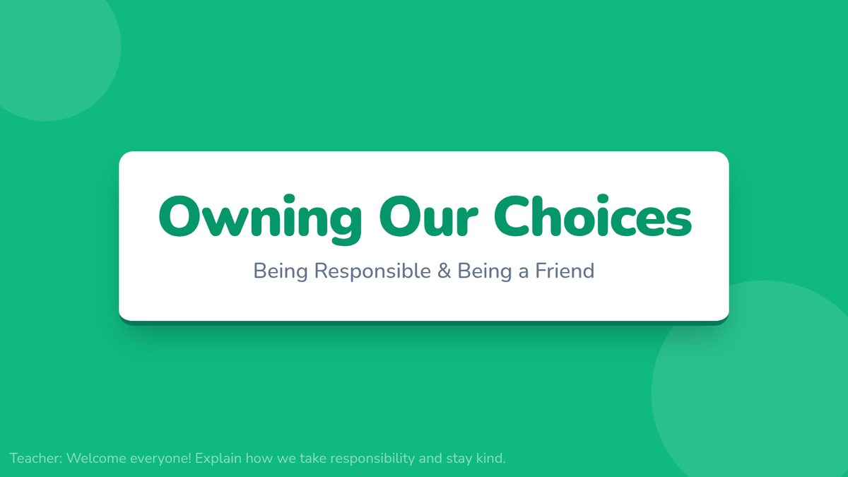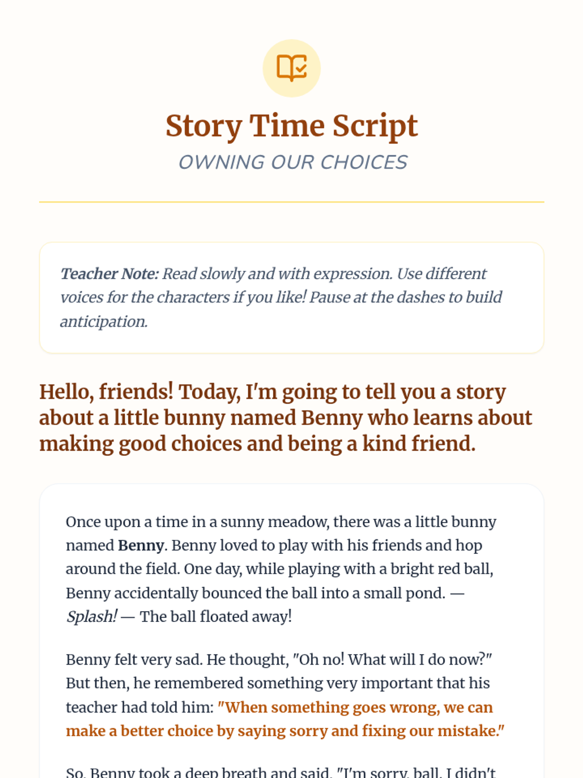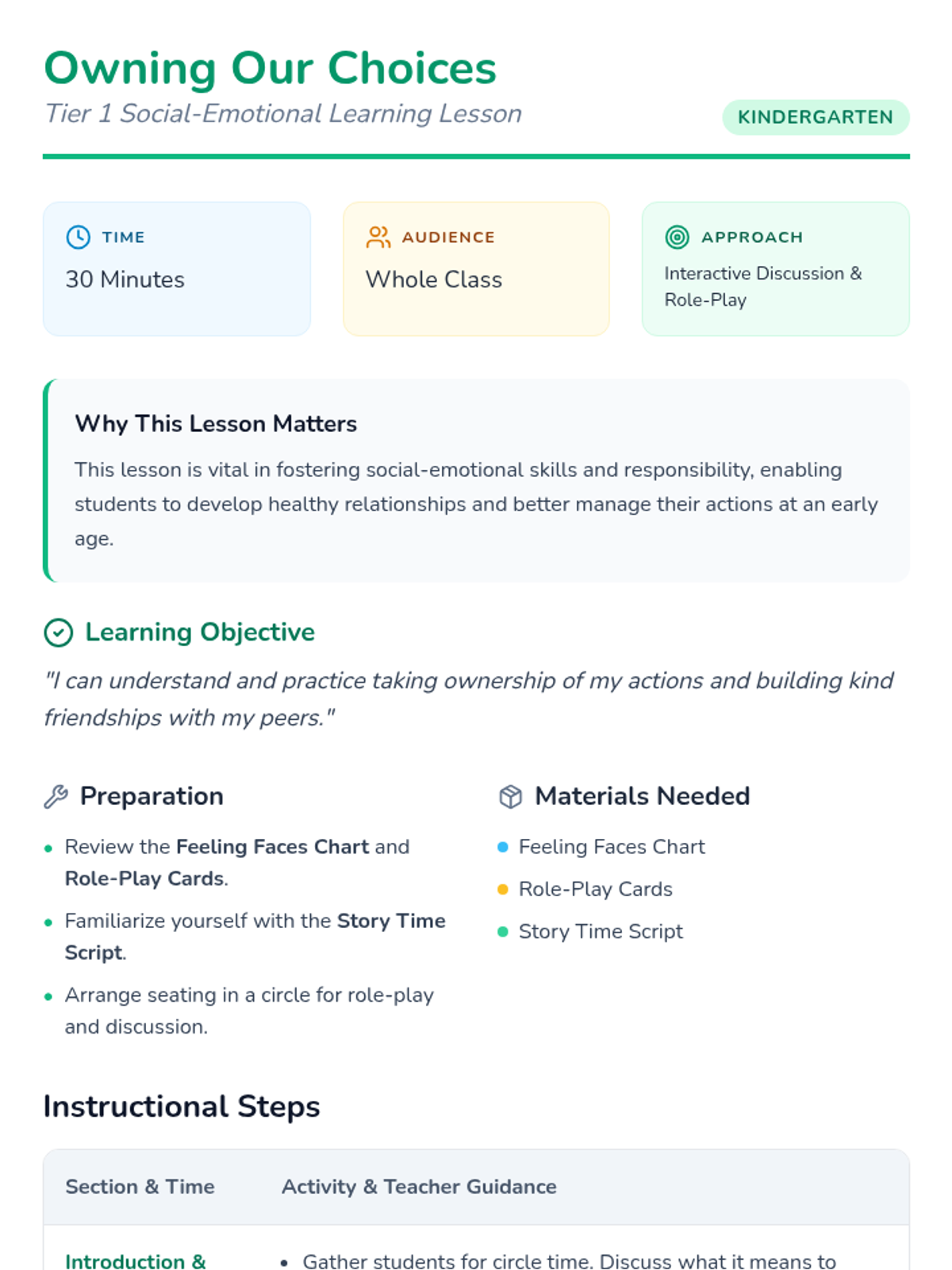 A 30-minute Tier 1 social-emotional learning lesson for kindergarteners focused on taking ownership of actions and building healthy peer relationships through storytelling, role-play, and emotional literacy activities.