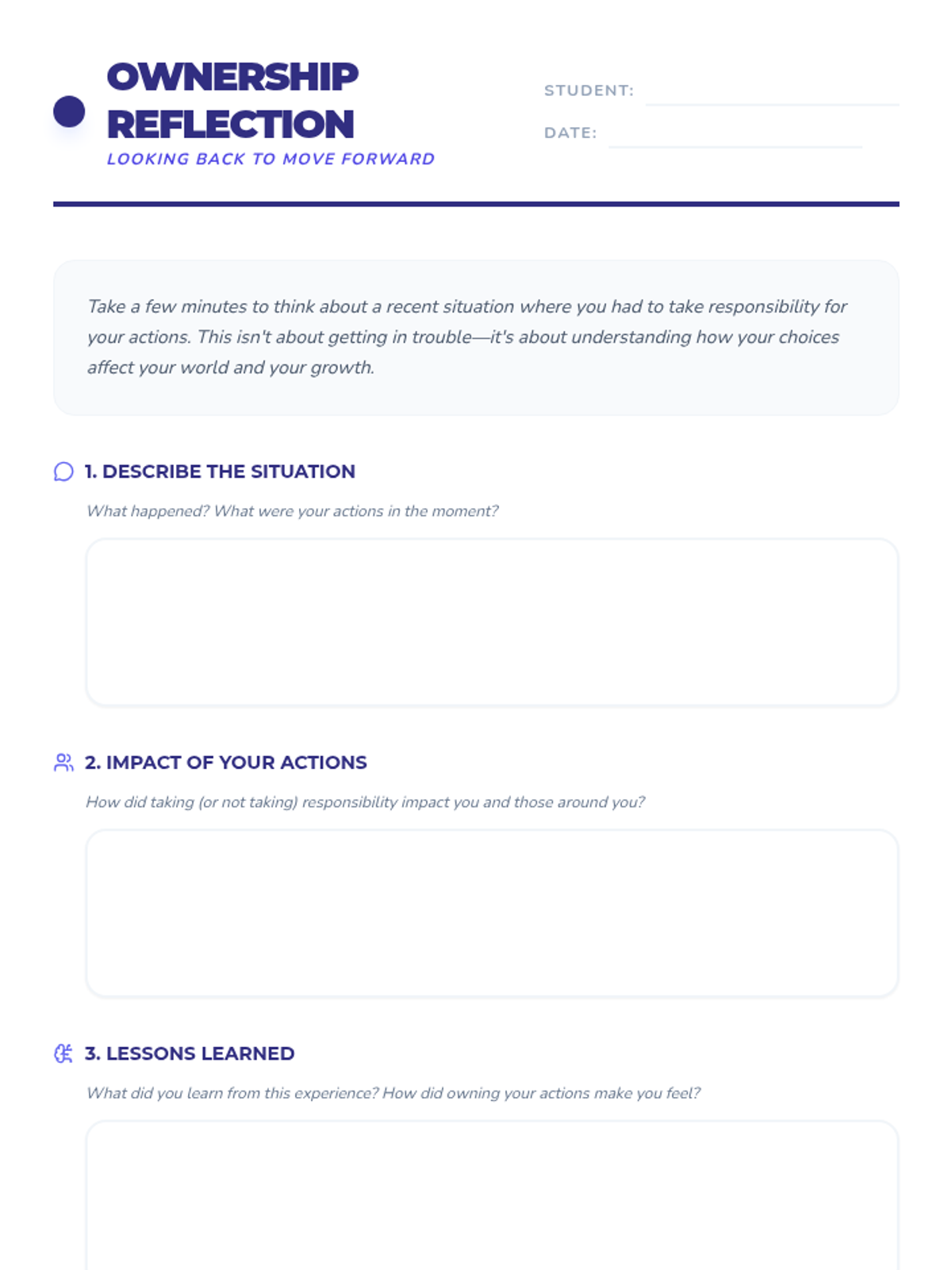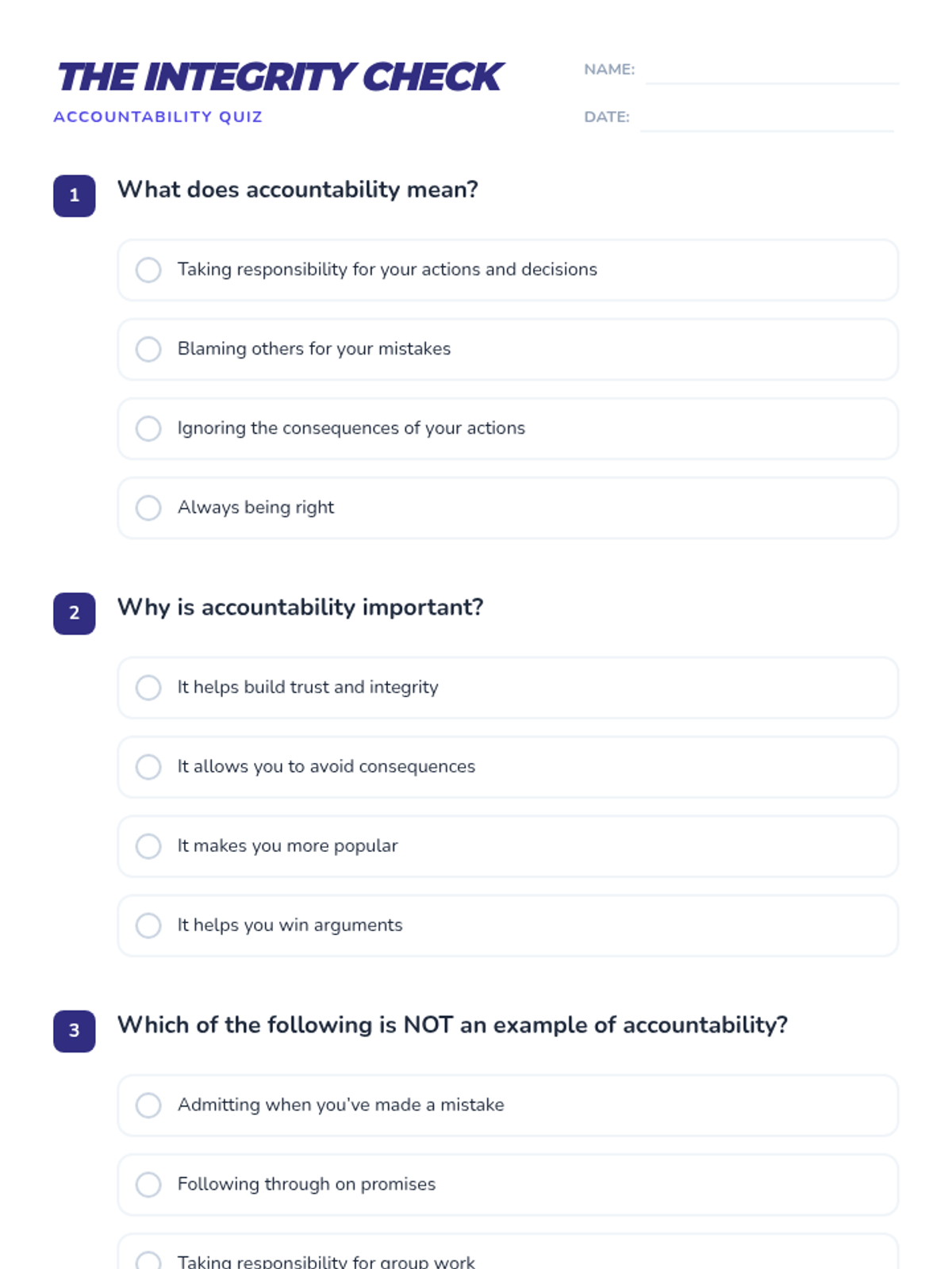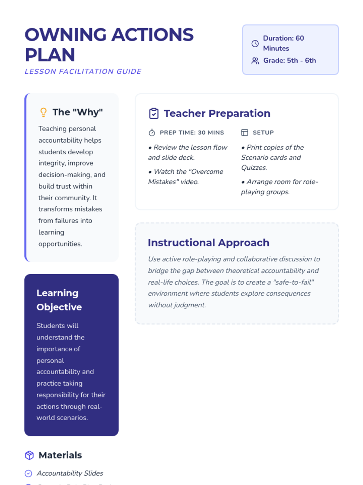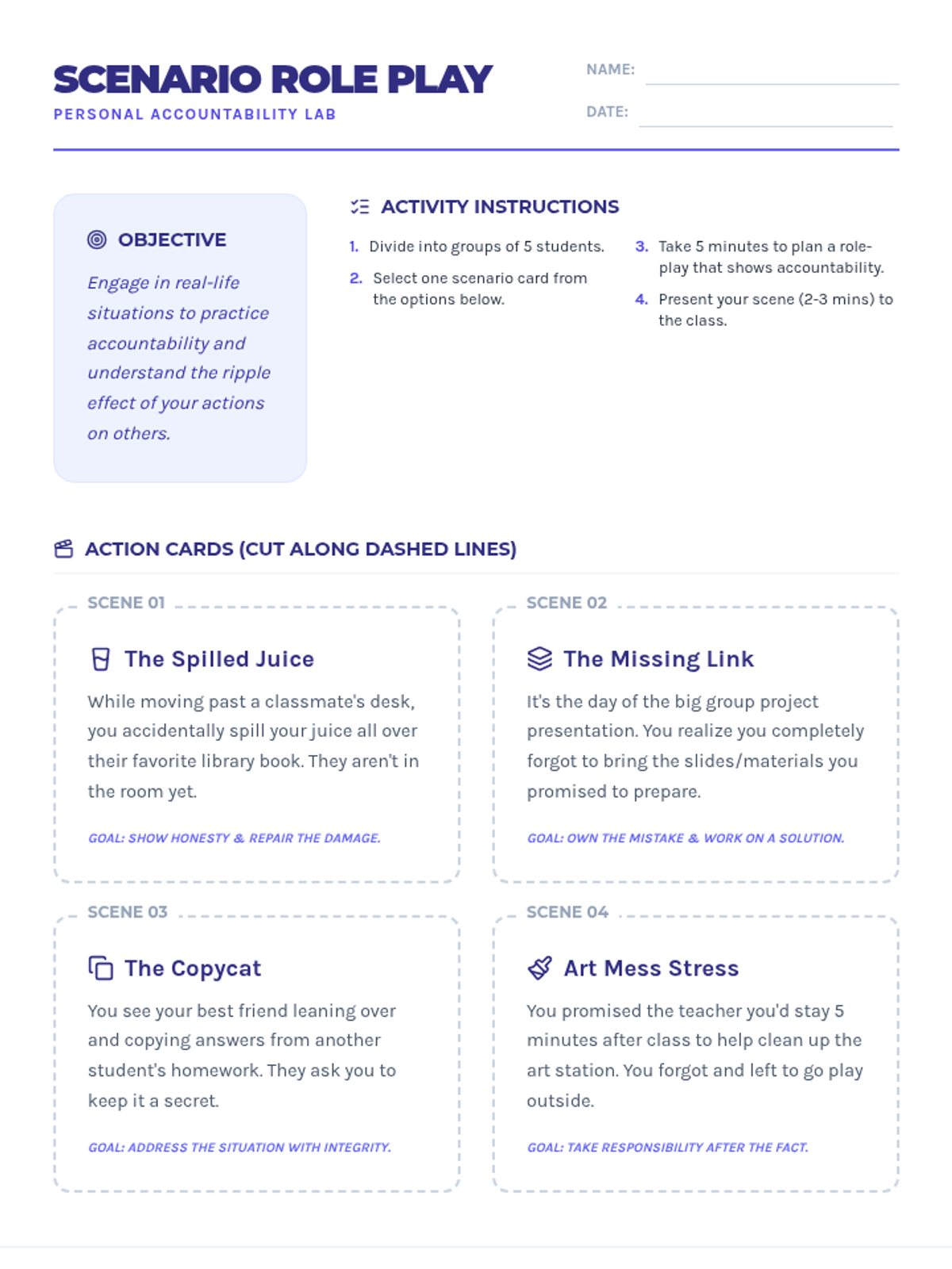 A 60-minute lesson for 5th and 6th graders focused on developing personal accountability and integrity through role-play, discussion, and reflection.