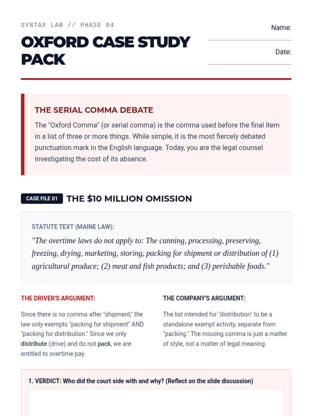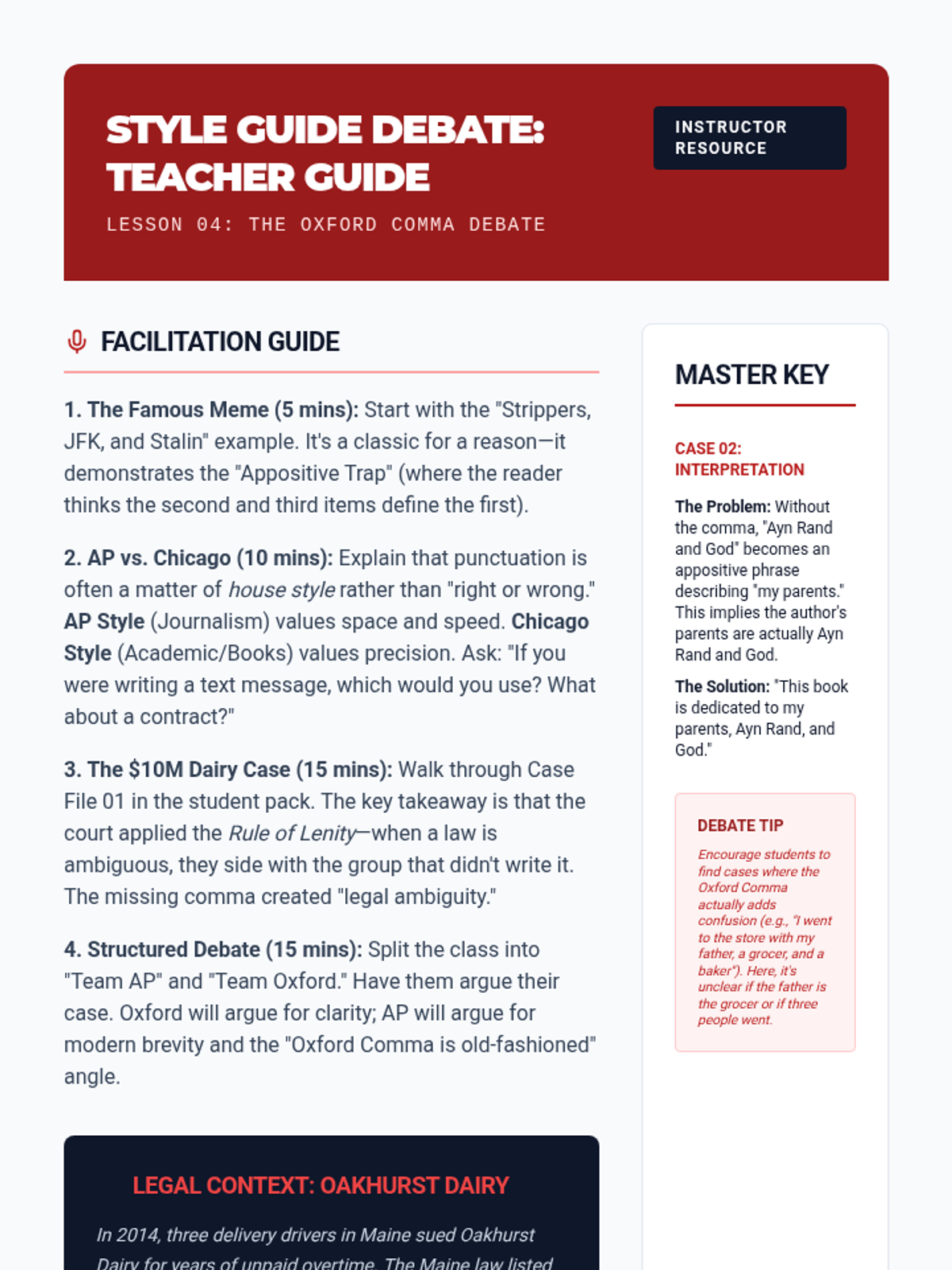 A deep dive into the serial comma through the lens of style guides and high-stakes legal cases, culminating in a structured debate on its necessity.