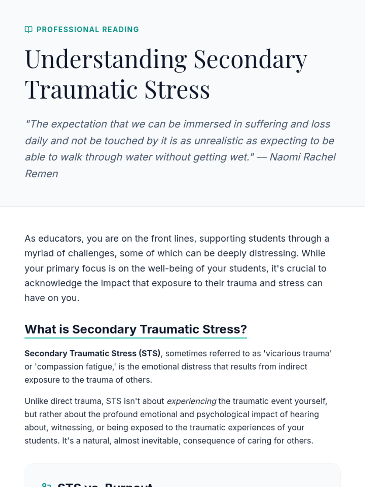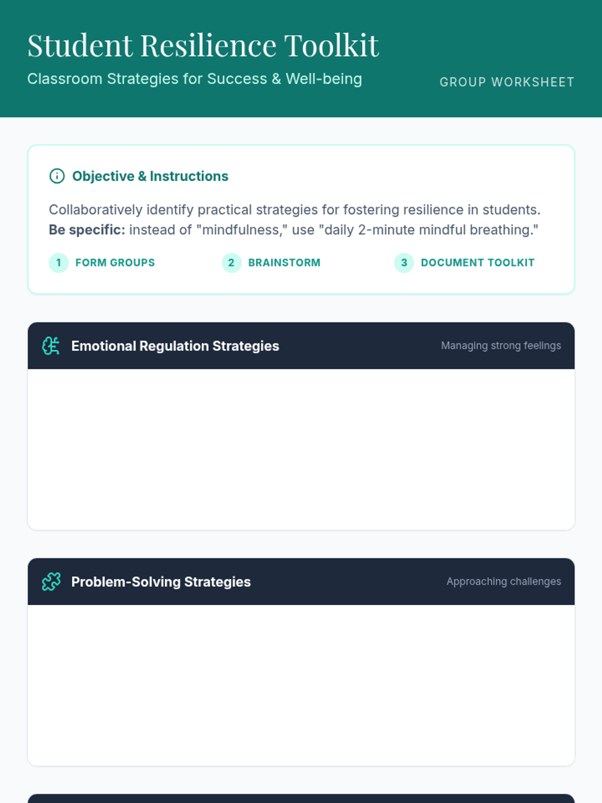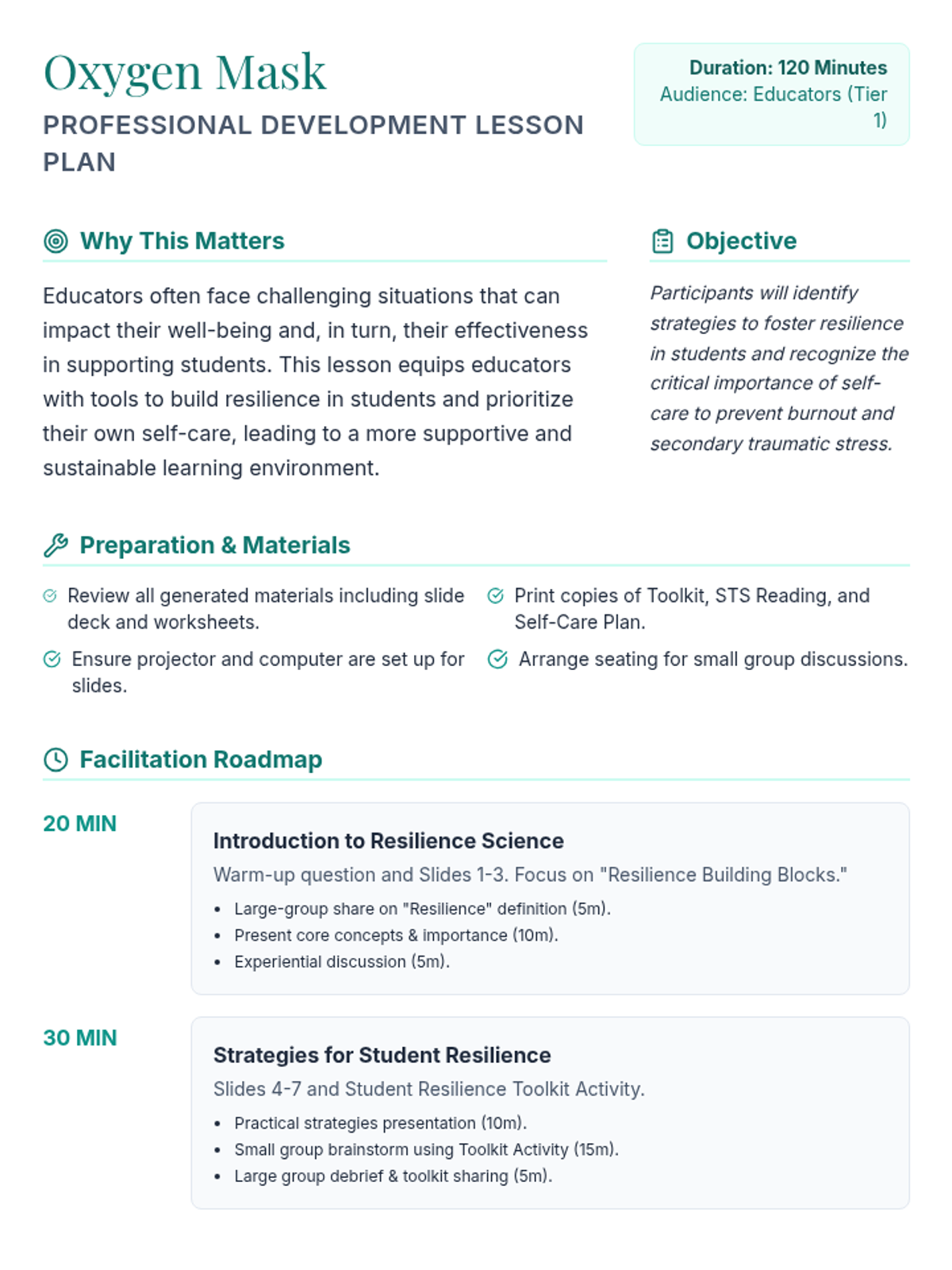 A 120-minute professional development session focused on building student resilience and prioritizing educator self-care to prevent burnout and secondary traumatic stress.