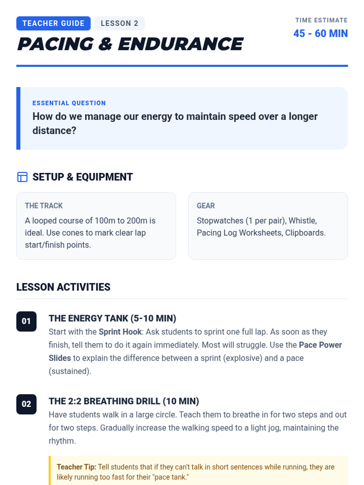This lesson differentiates between the explosive energy of sprinting and the sustained energy of distance running through pacing games and breath control practice.