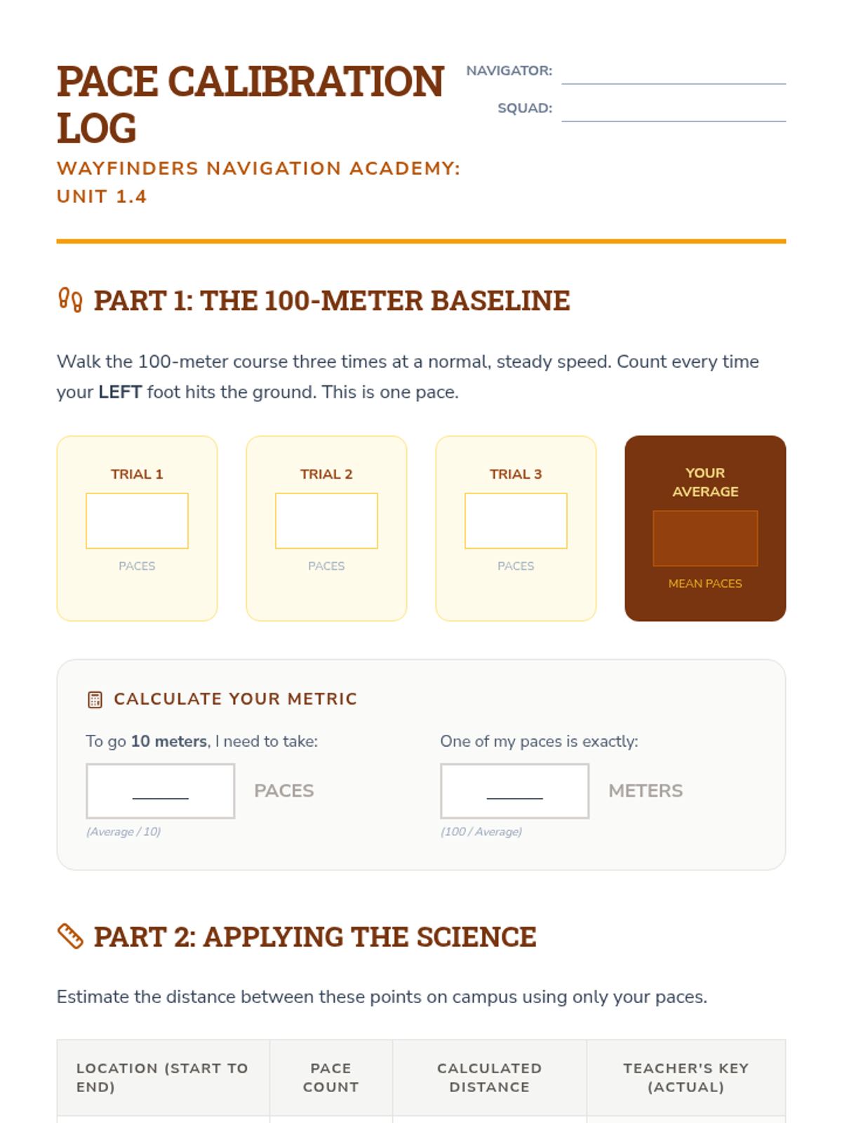 Learners calibrate their personal pace count to measure distances accurately on foot.