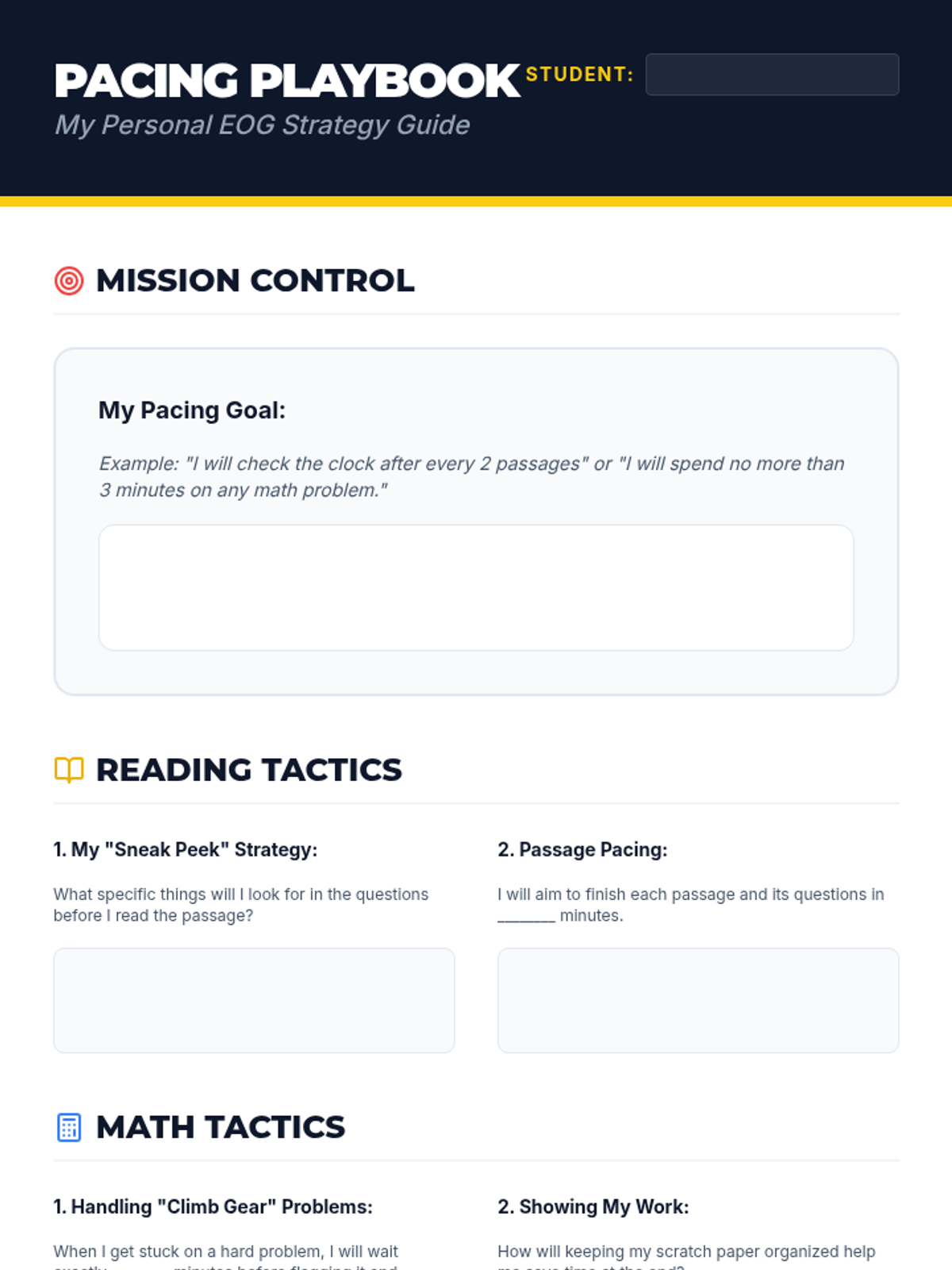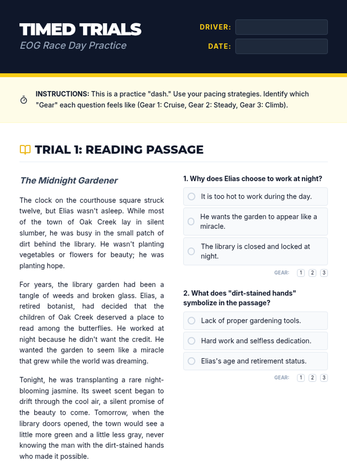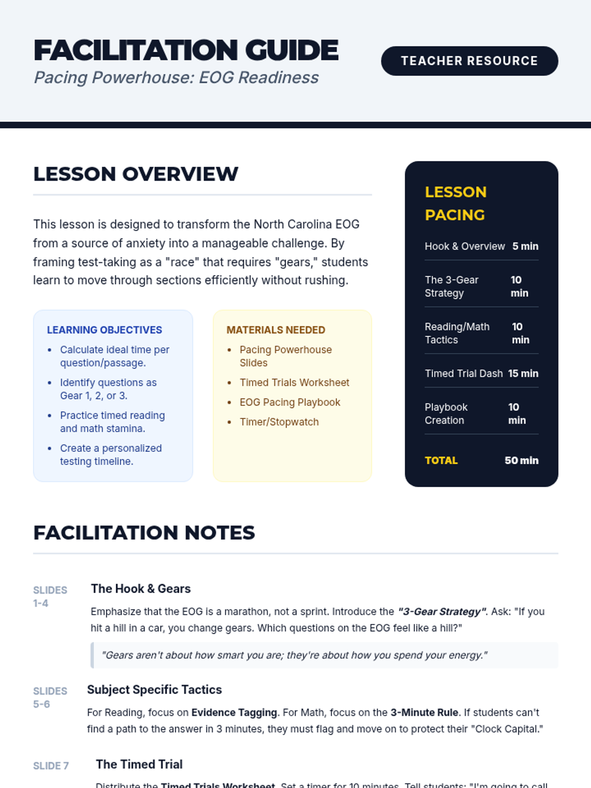 A comprehensive lesson designed to help students in grades 3-8 master the art of pacing during the North Carolina End-of-Grade (EOG) assessments. Students will learn specific time allocation strategies, engage in timed practice, and create a personalized testing plan.