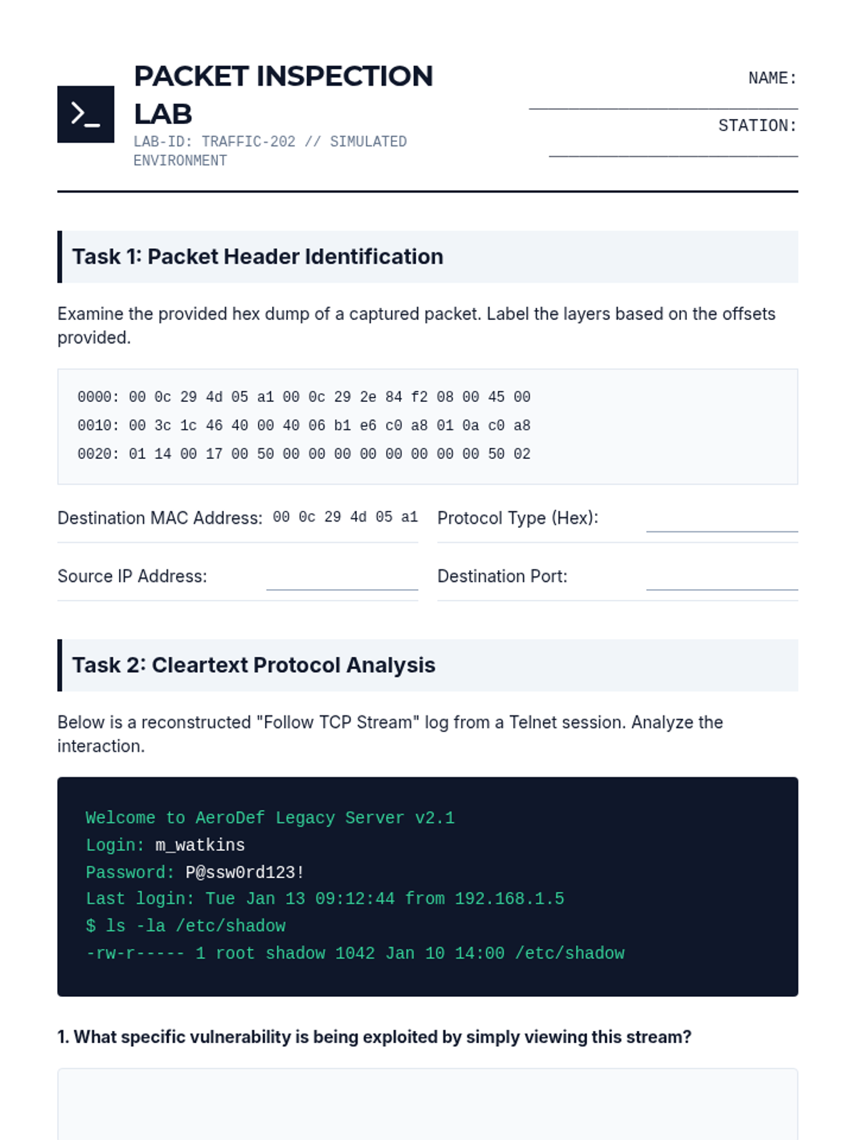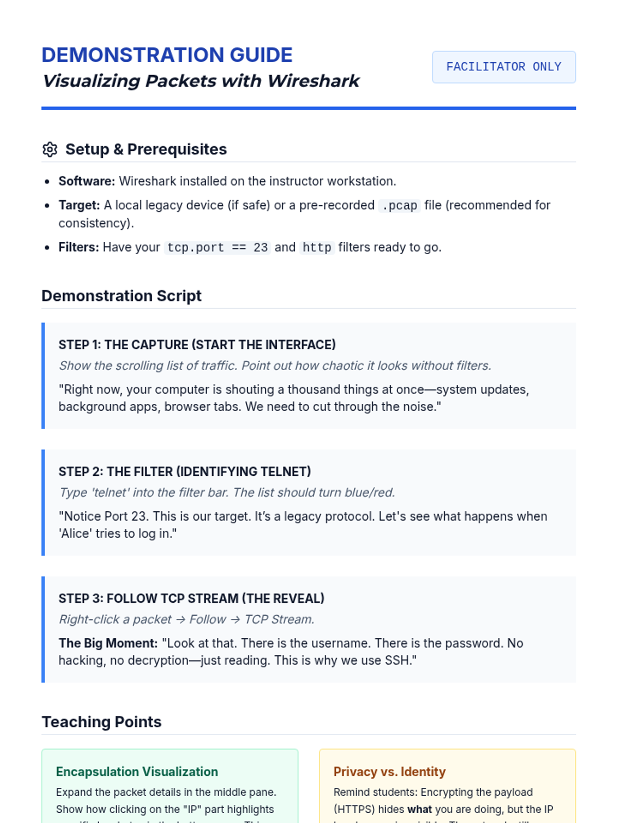 Students capture and inspect network packets in a simulated environment, observing the difference between cleartext and encrypted protocols.