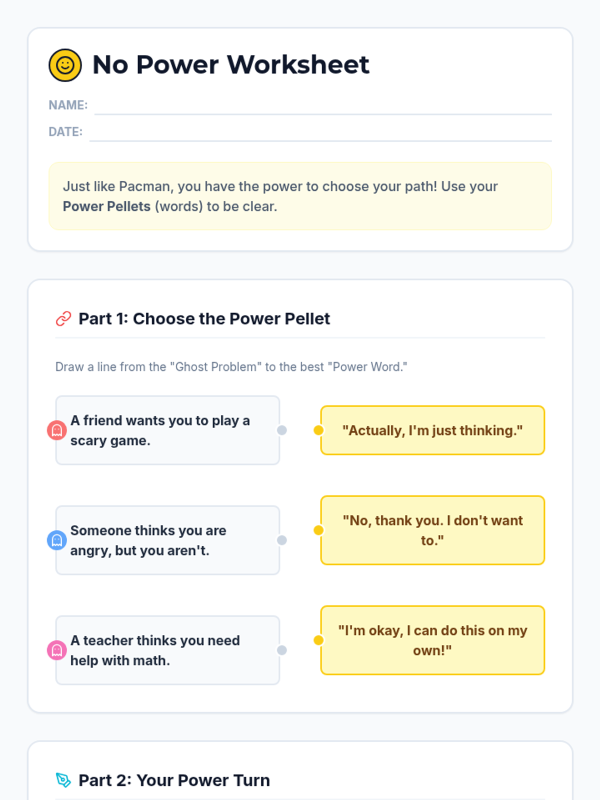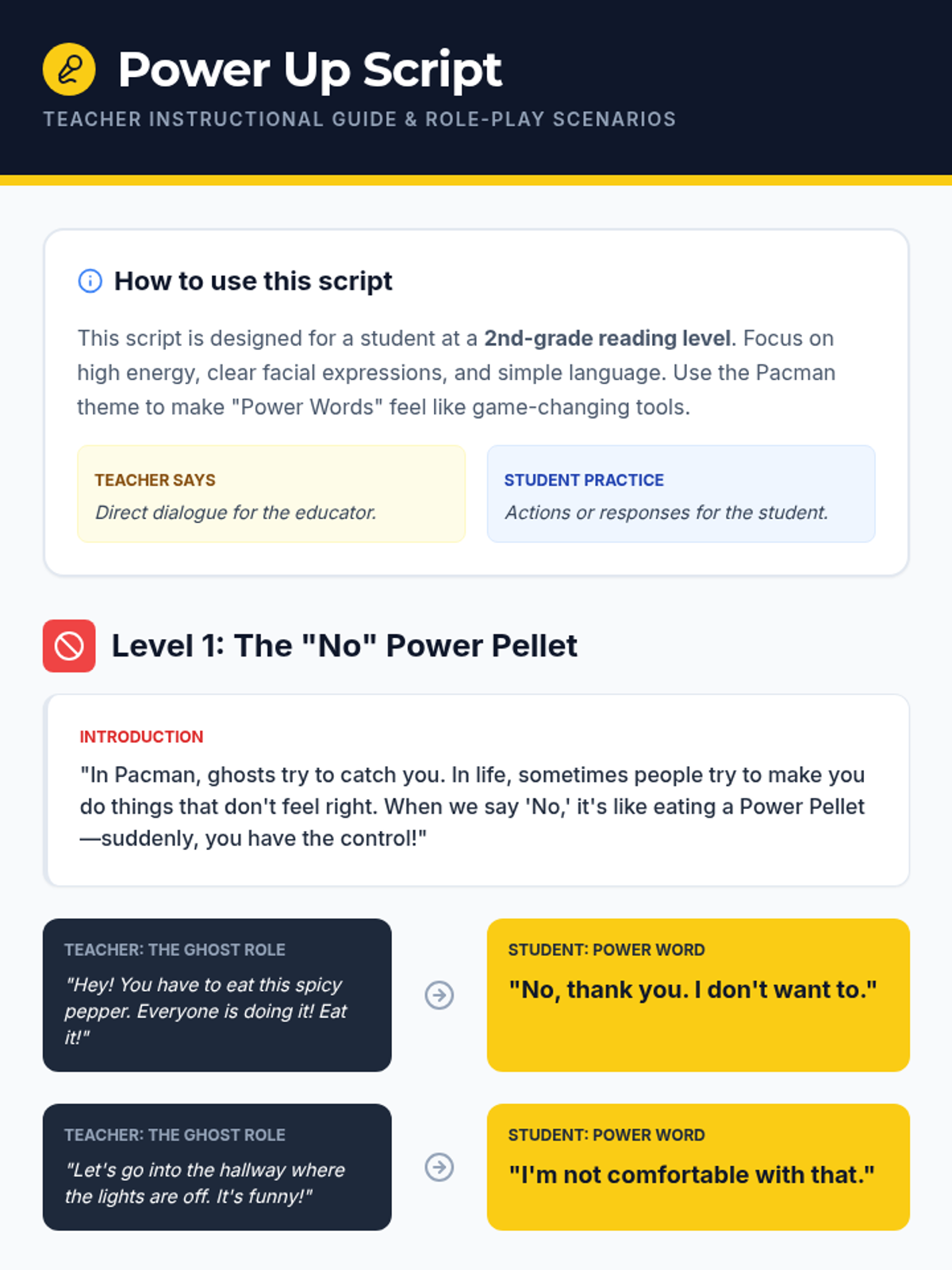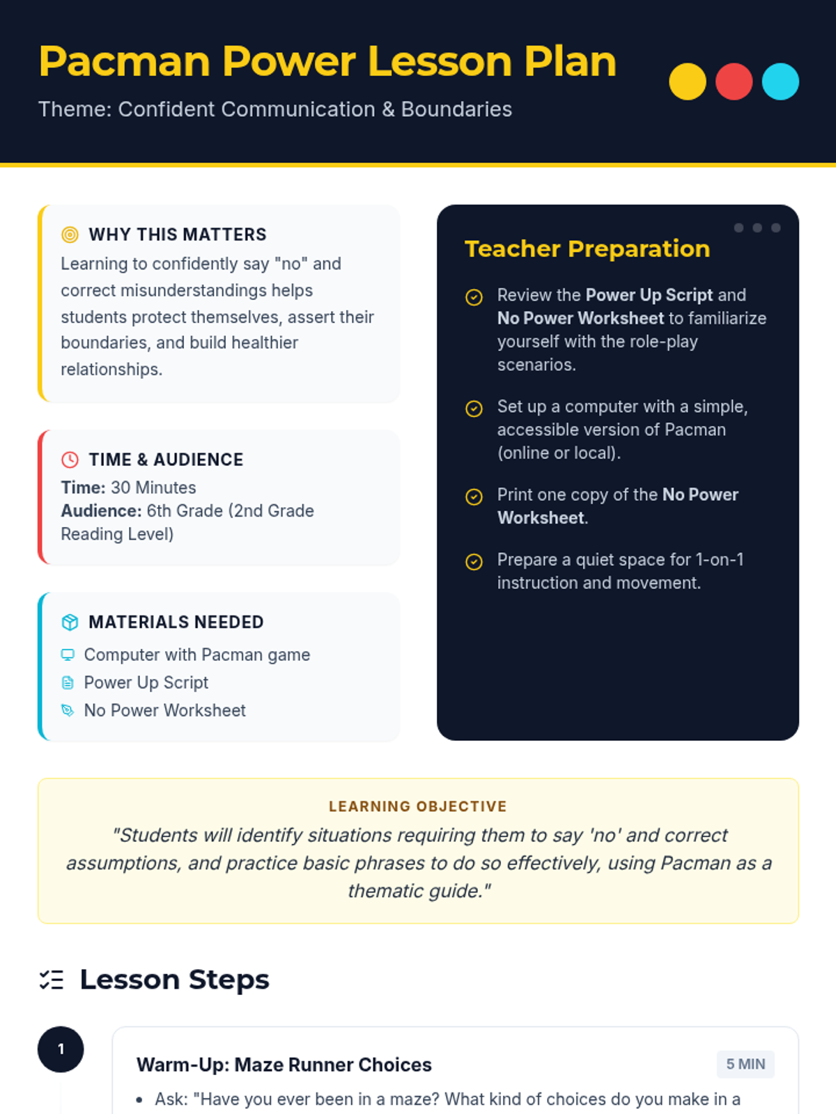 An individual Tier 3 social skills lesson for 6th-grade students with a 2nd-grade reading level, using Pacman metaphors to teach the power of saying "no" and correcting wrong assumptions.
