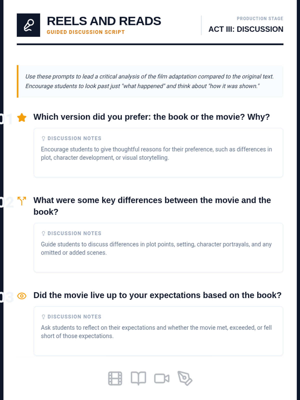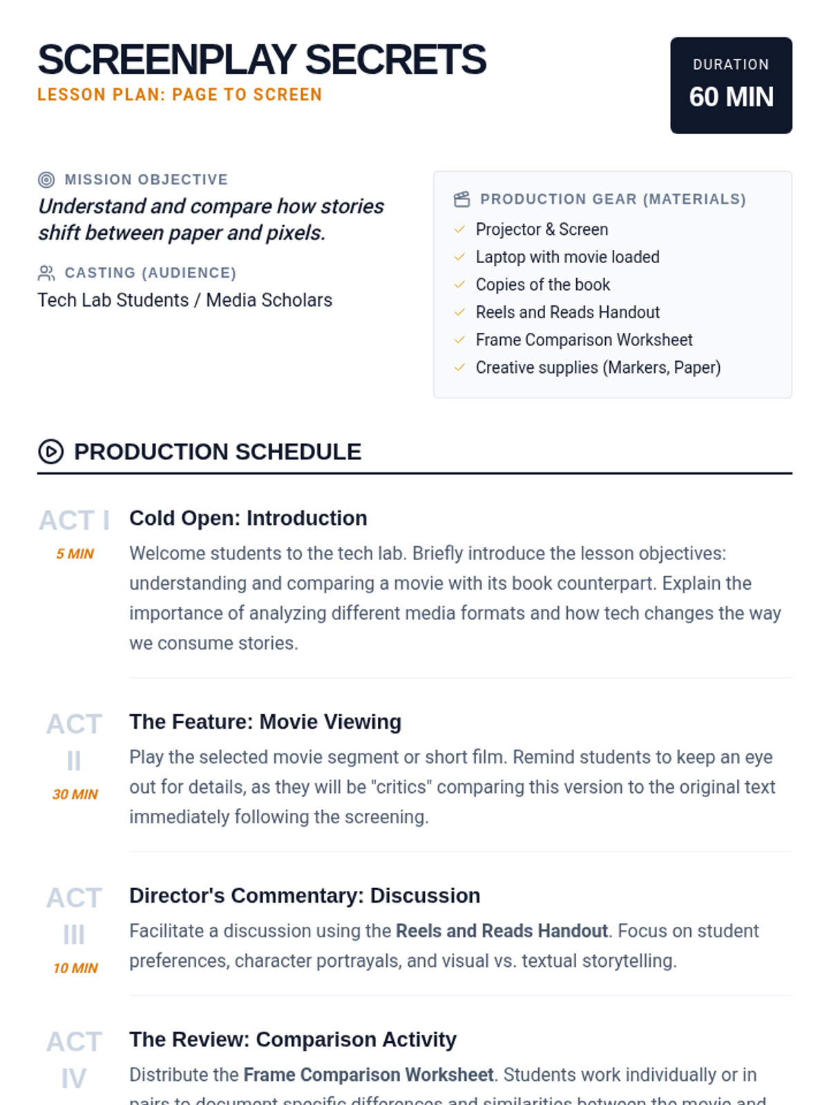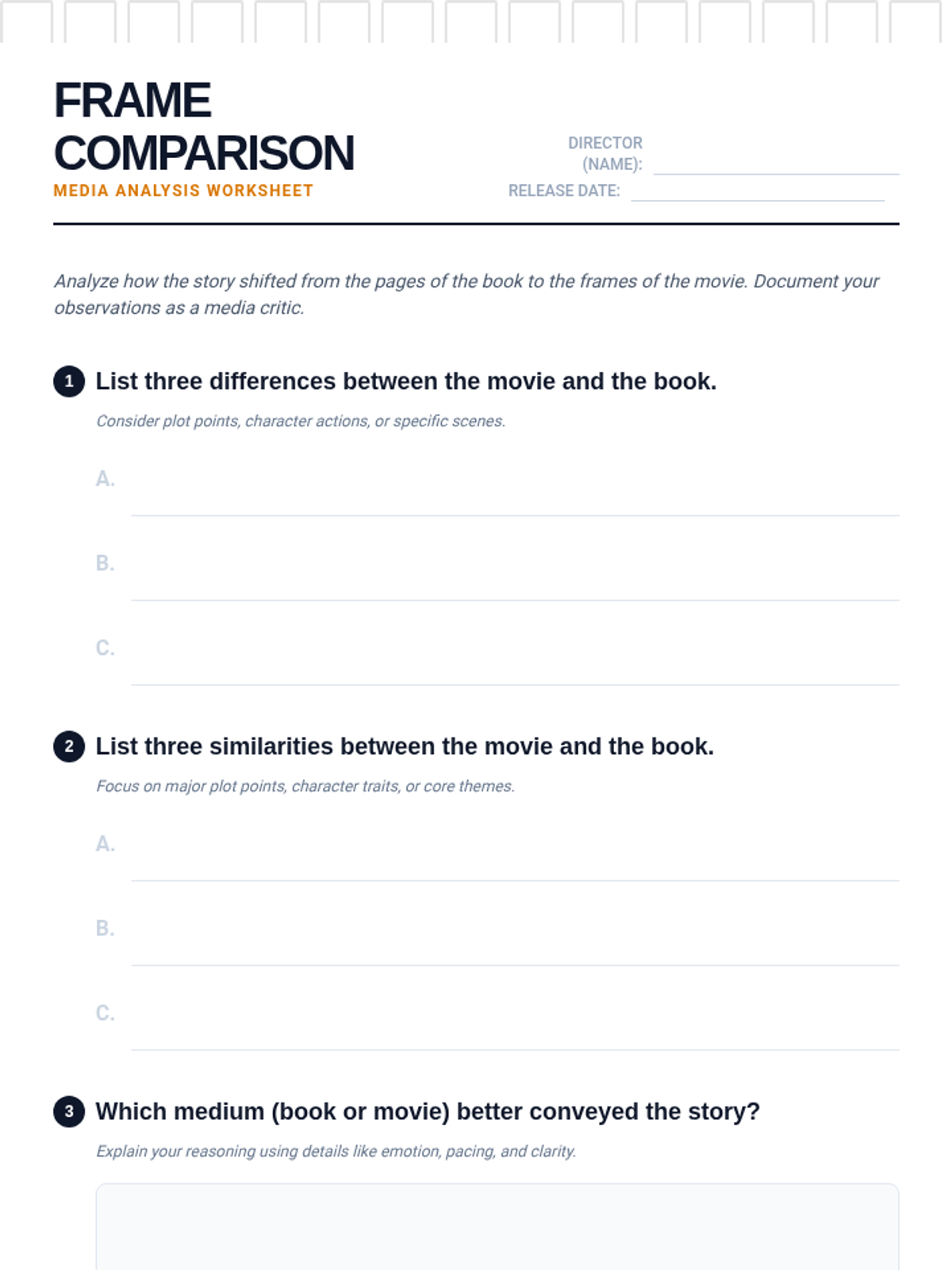 Students analyze the transition from page to screen by comparing a book with its film adaptation, focusing on storytelling techniques and media-specific strengths.