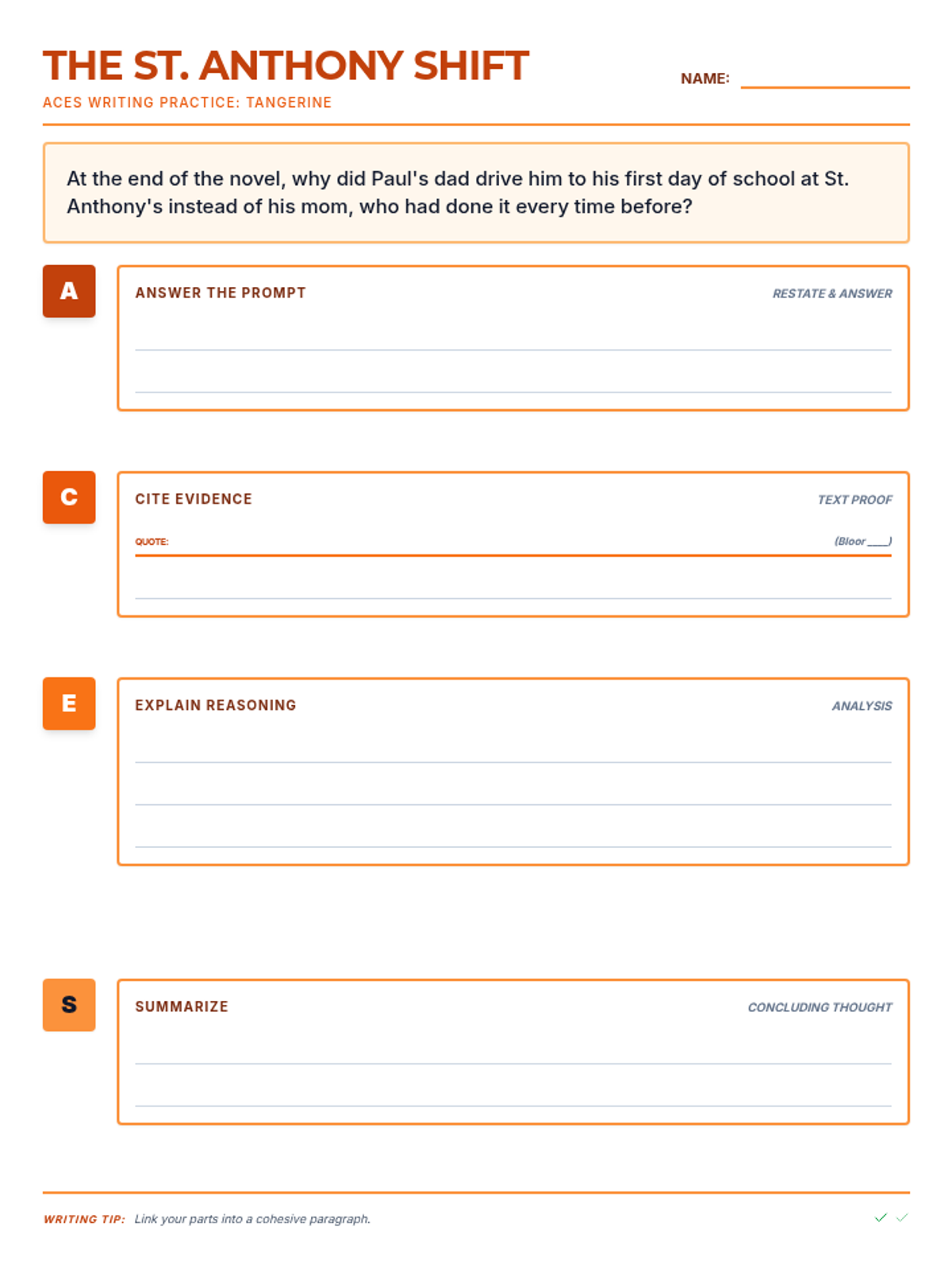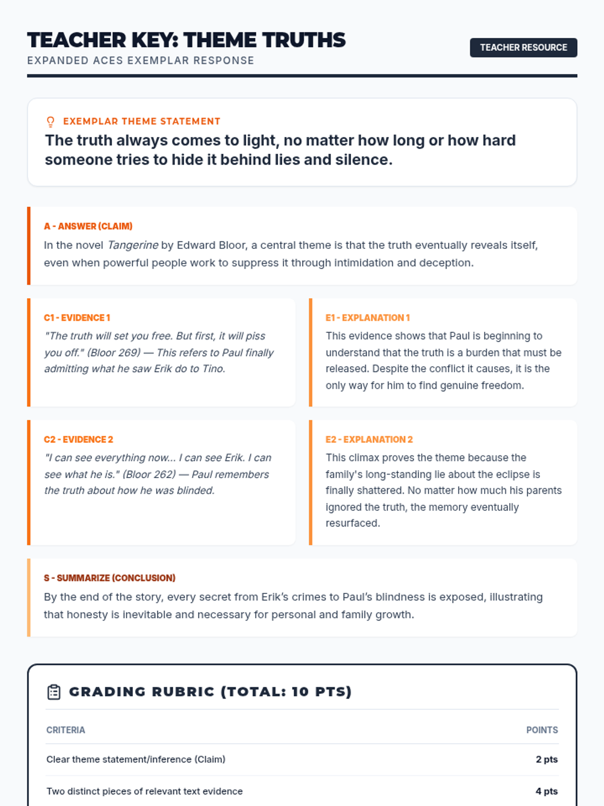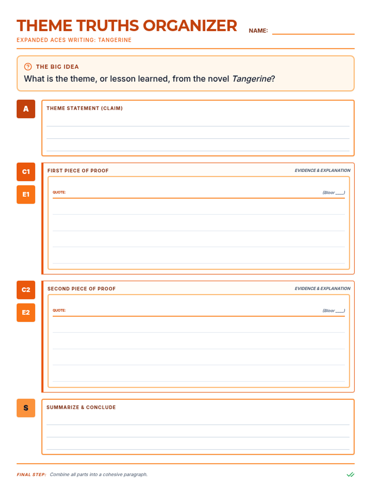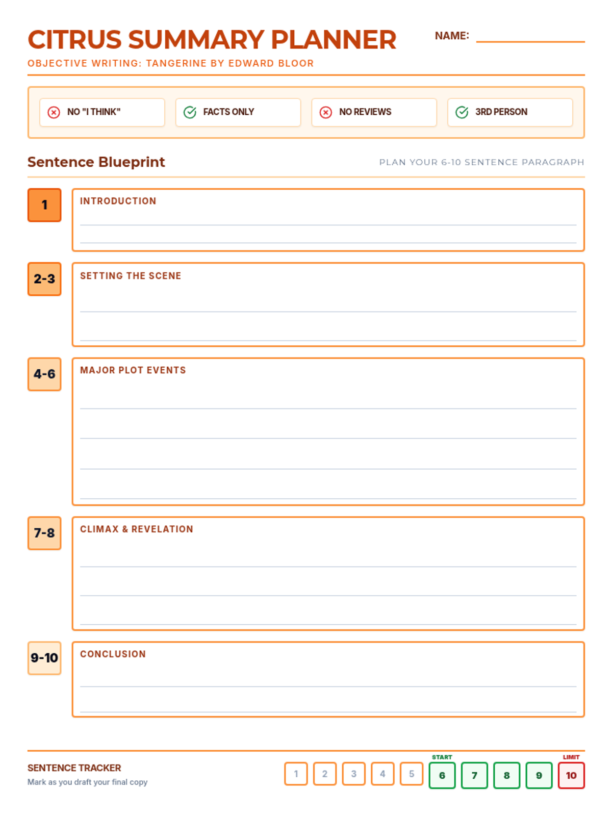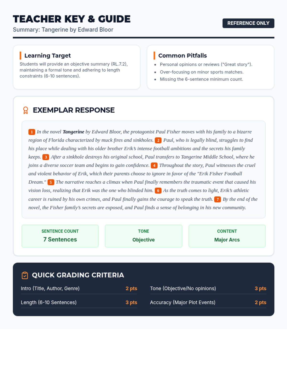 A focused lesson on crafting an objective summary for the novel Tangerine, emphasizing sentence structure and objective tone.