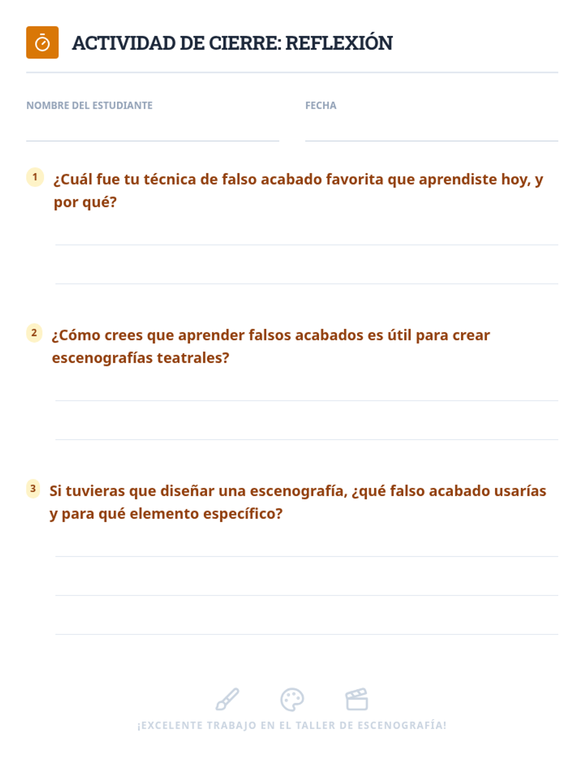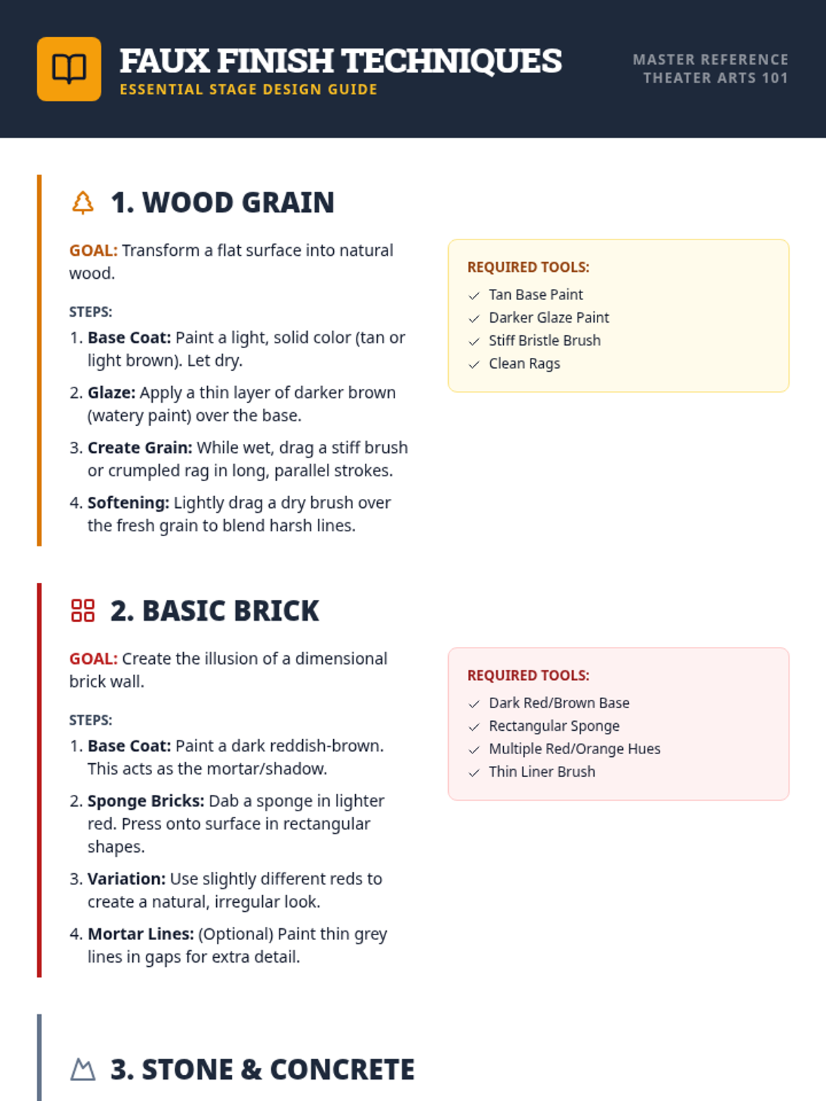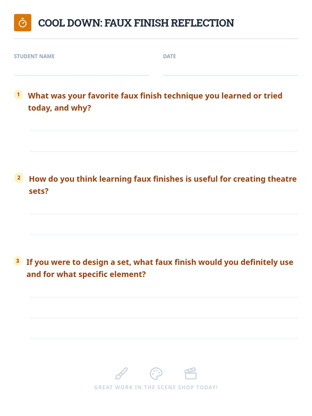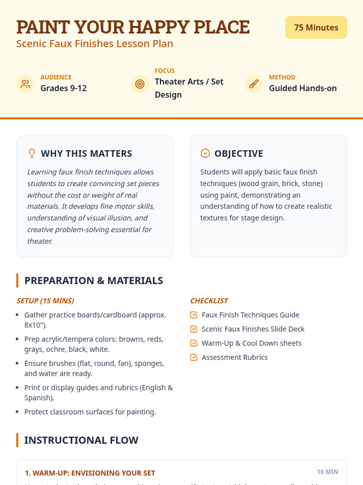 A comprehensive theater arts lesson on scenic faux finishes, teaching students how to transform ordinary materials into realistic wood, brick, and stone textures for the stage. This session includes guided practice, color mixing, and reflection activities.