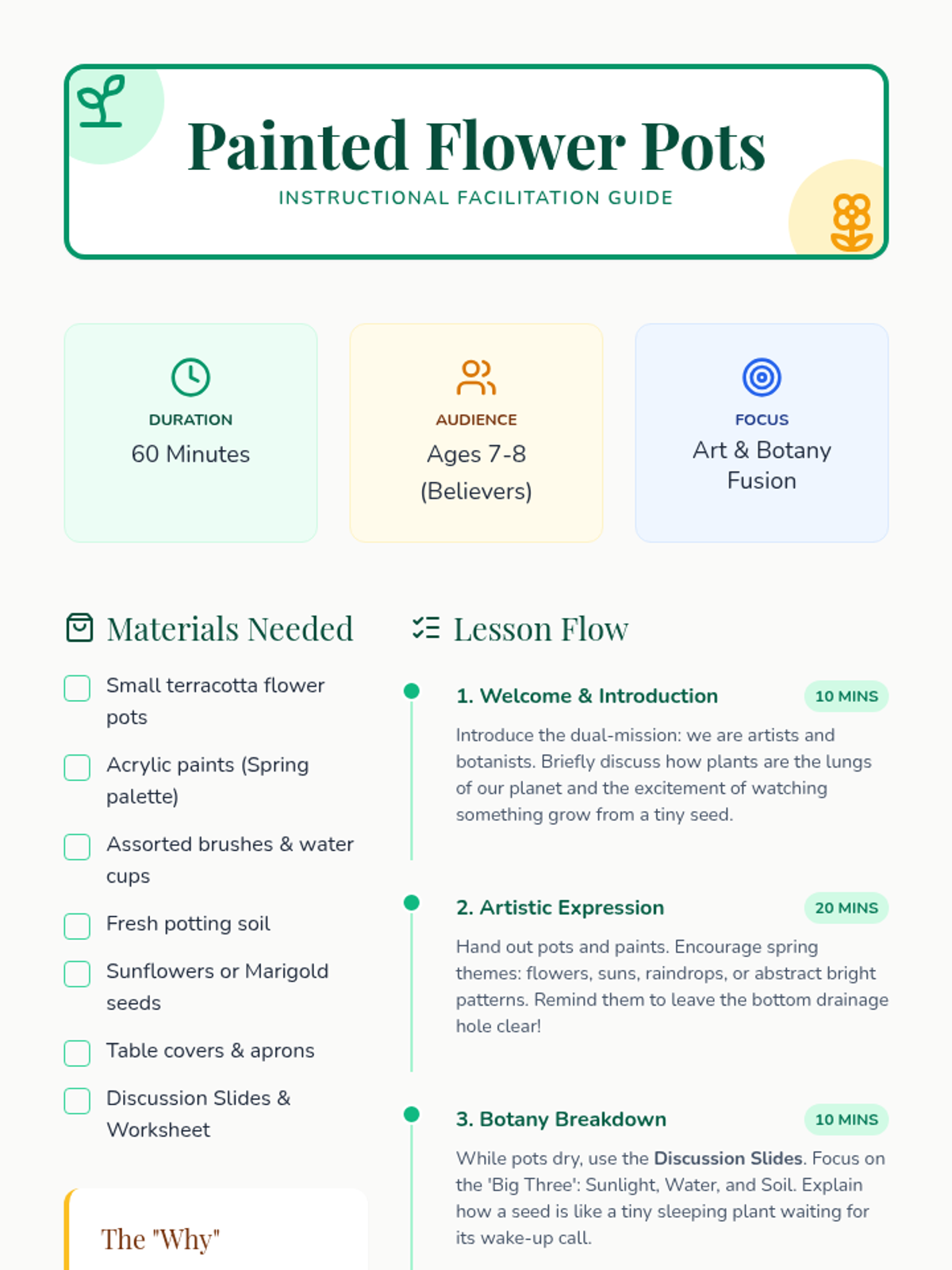 Students will decorate flower pots with spring designs and learn the basics of plant life by planting seeds. This lesson integrates art and science to foster creativity and environmental responsibility.
