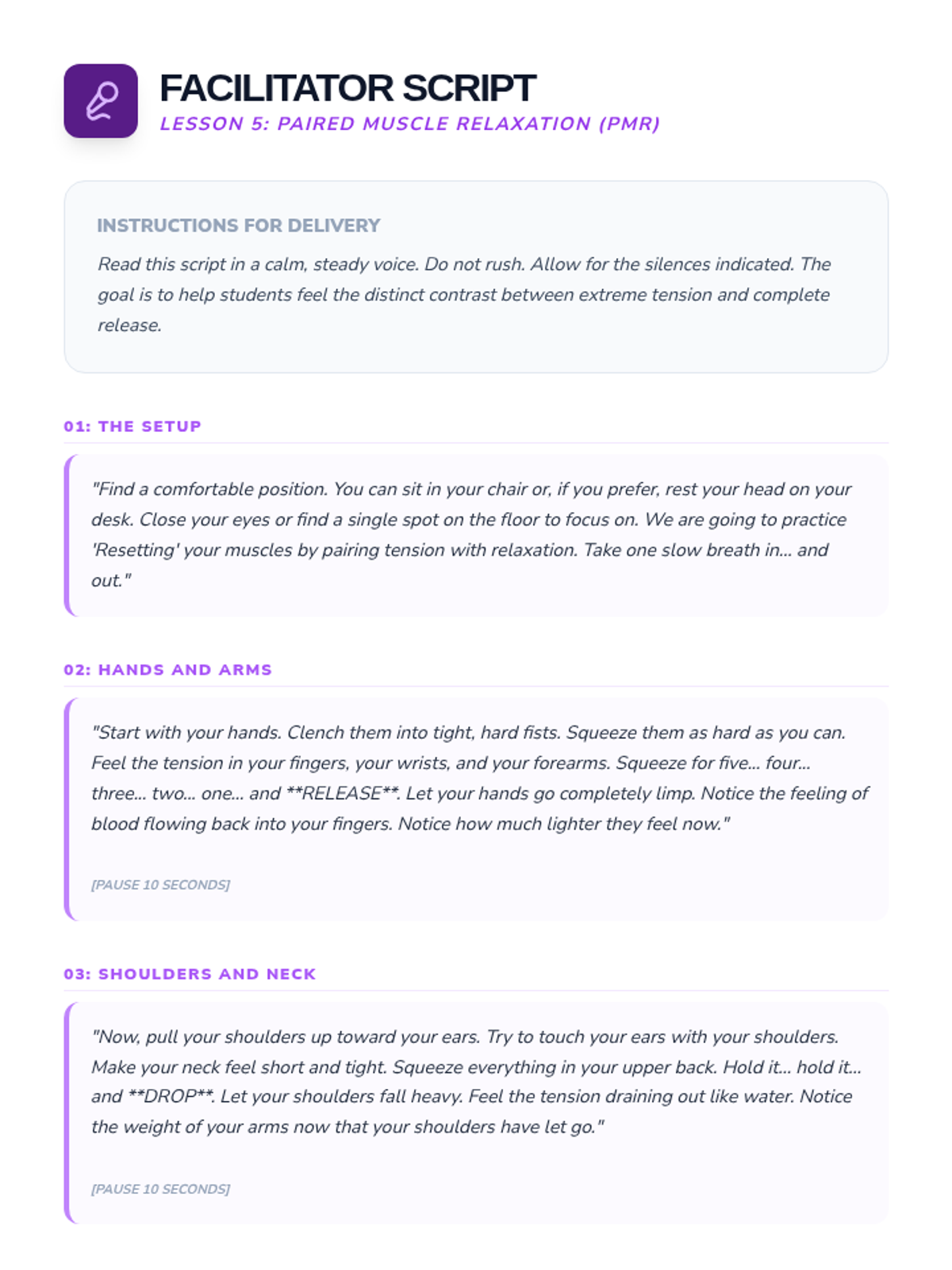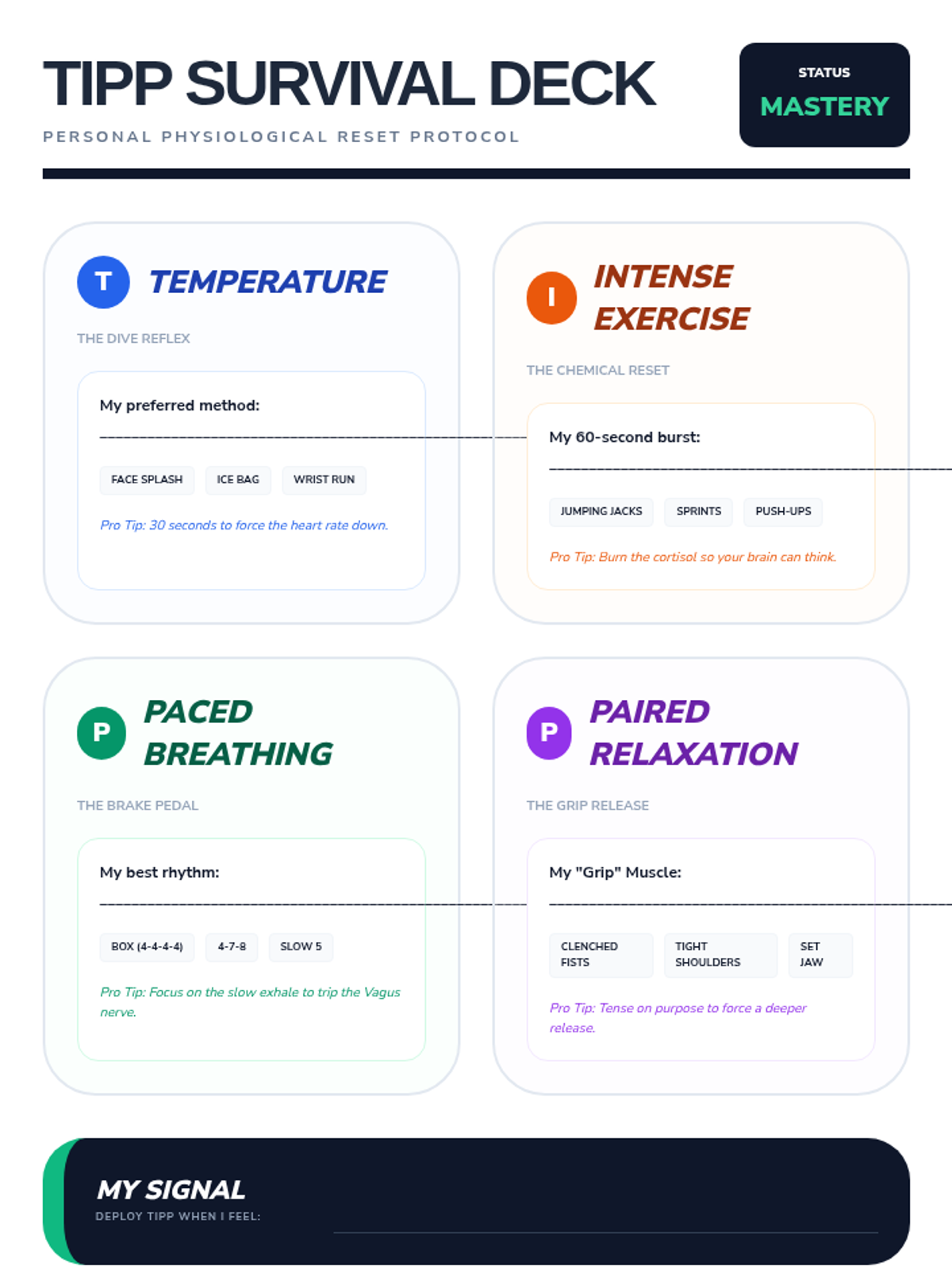 Students learn the final 'P' by practicing tensing and releasing muscle groups to identify and release held tension. The sequence concludes with students creating a 'TIPP Cheat Sheet' for their binders.