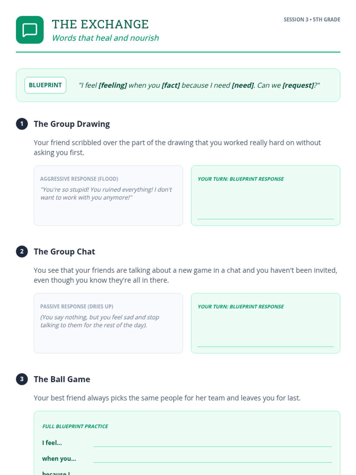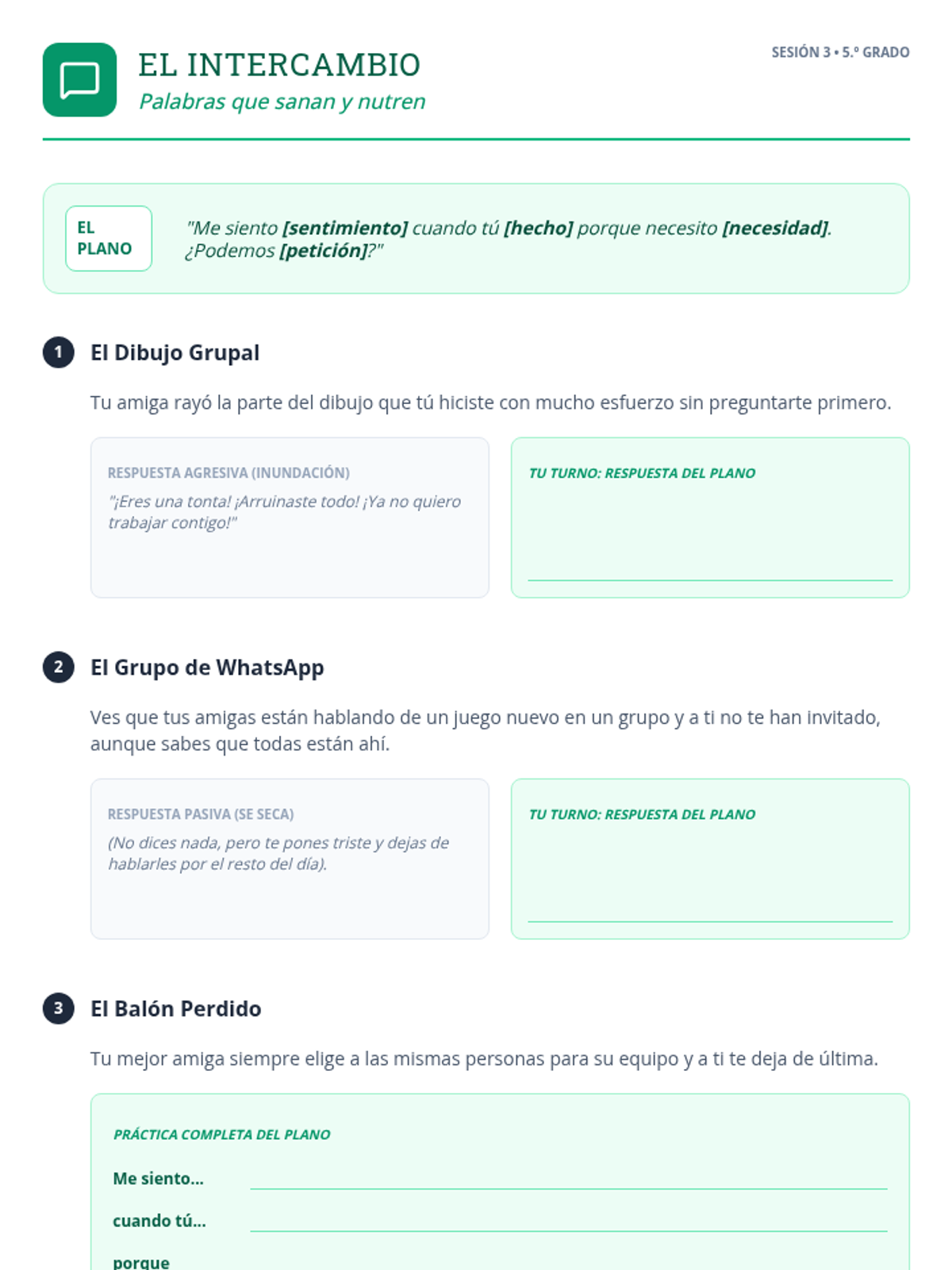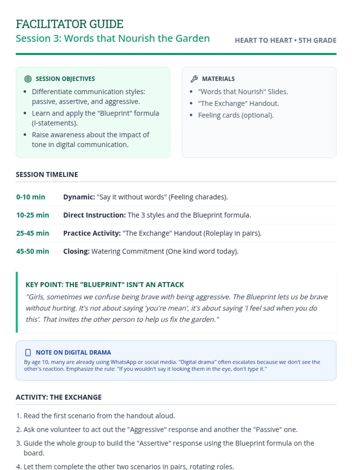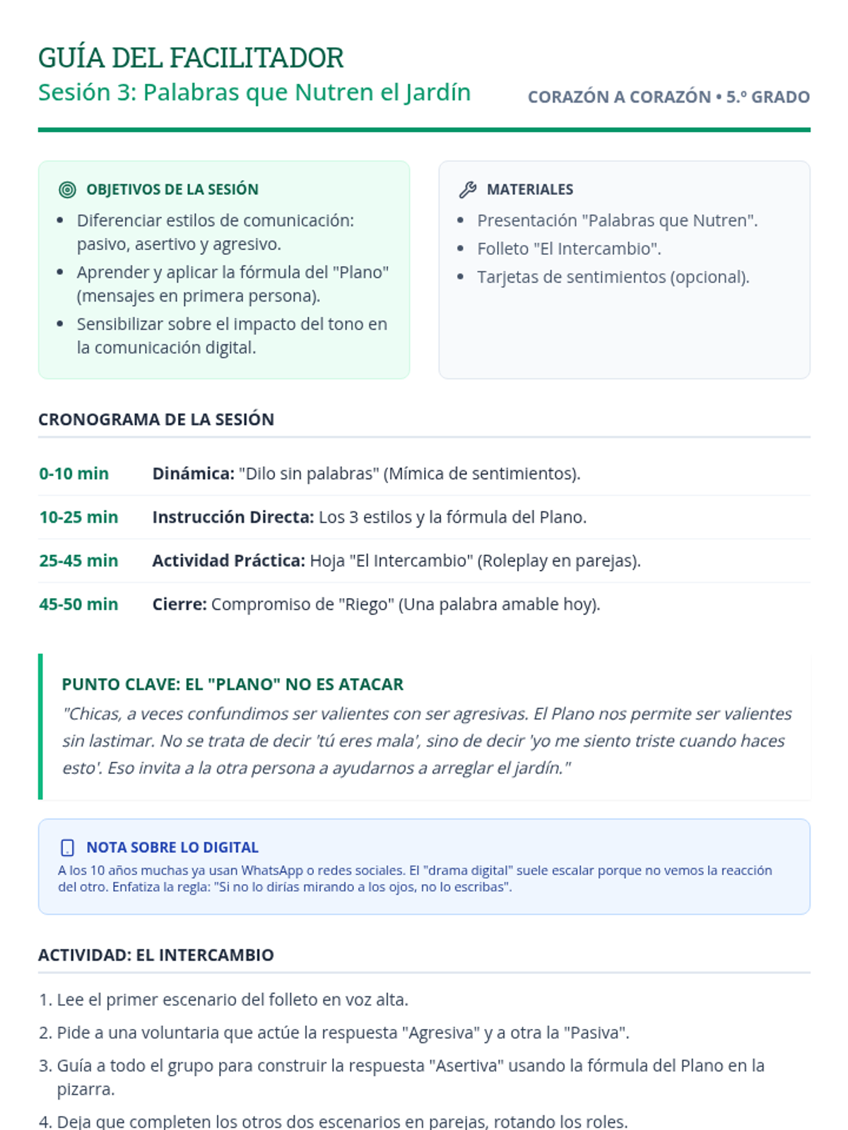 Se introduce la comunicación amable y asertiva, enseñando a las niñas a usar palabras que "rieguen" sus amistades en lugar de dañarlas, tanto en persona como en línea.