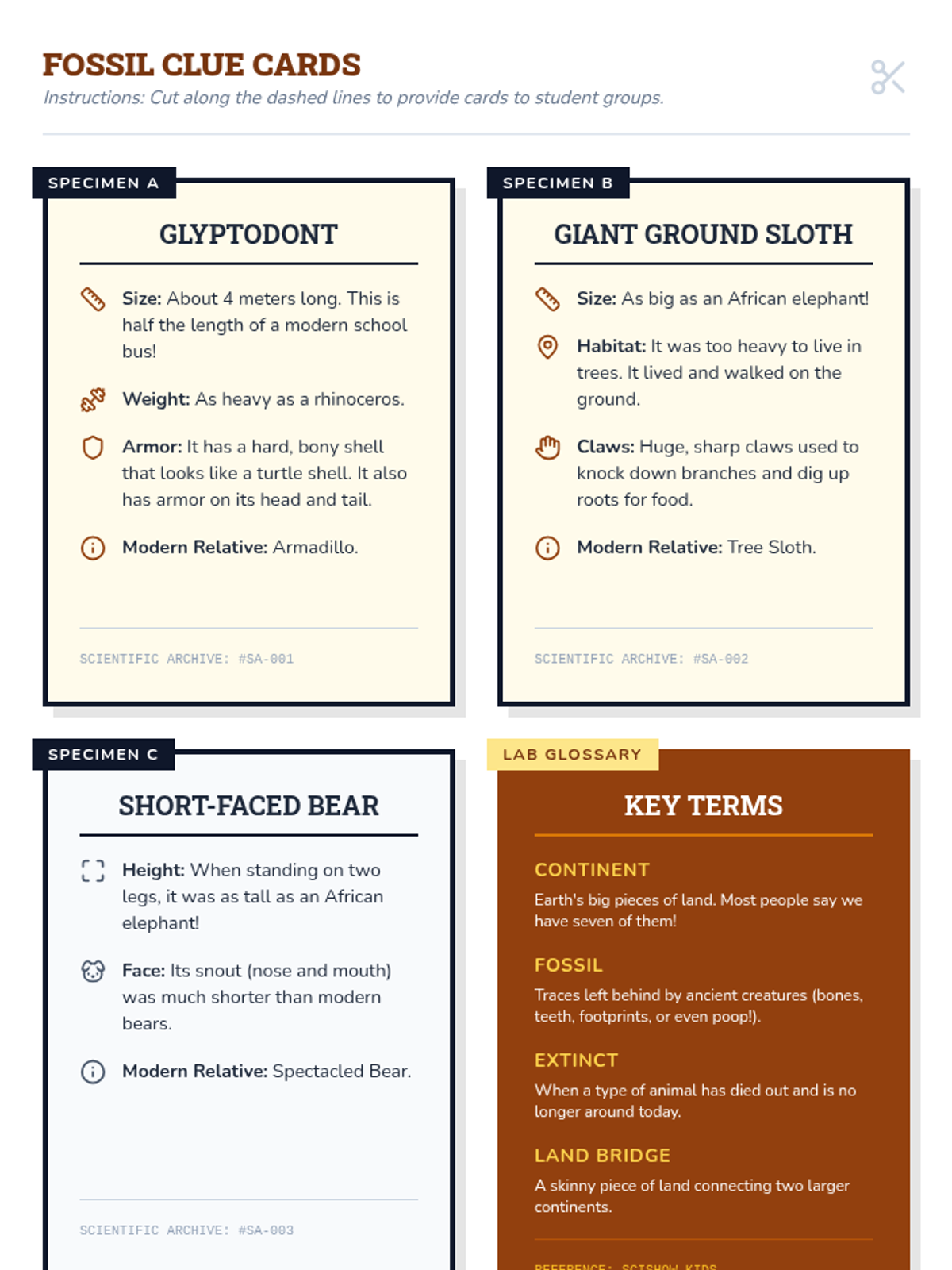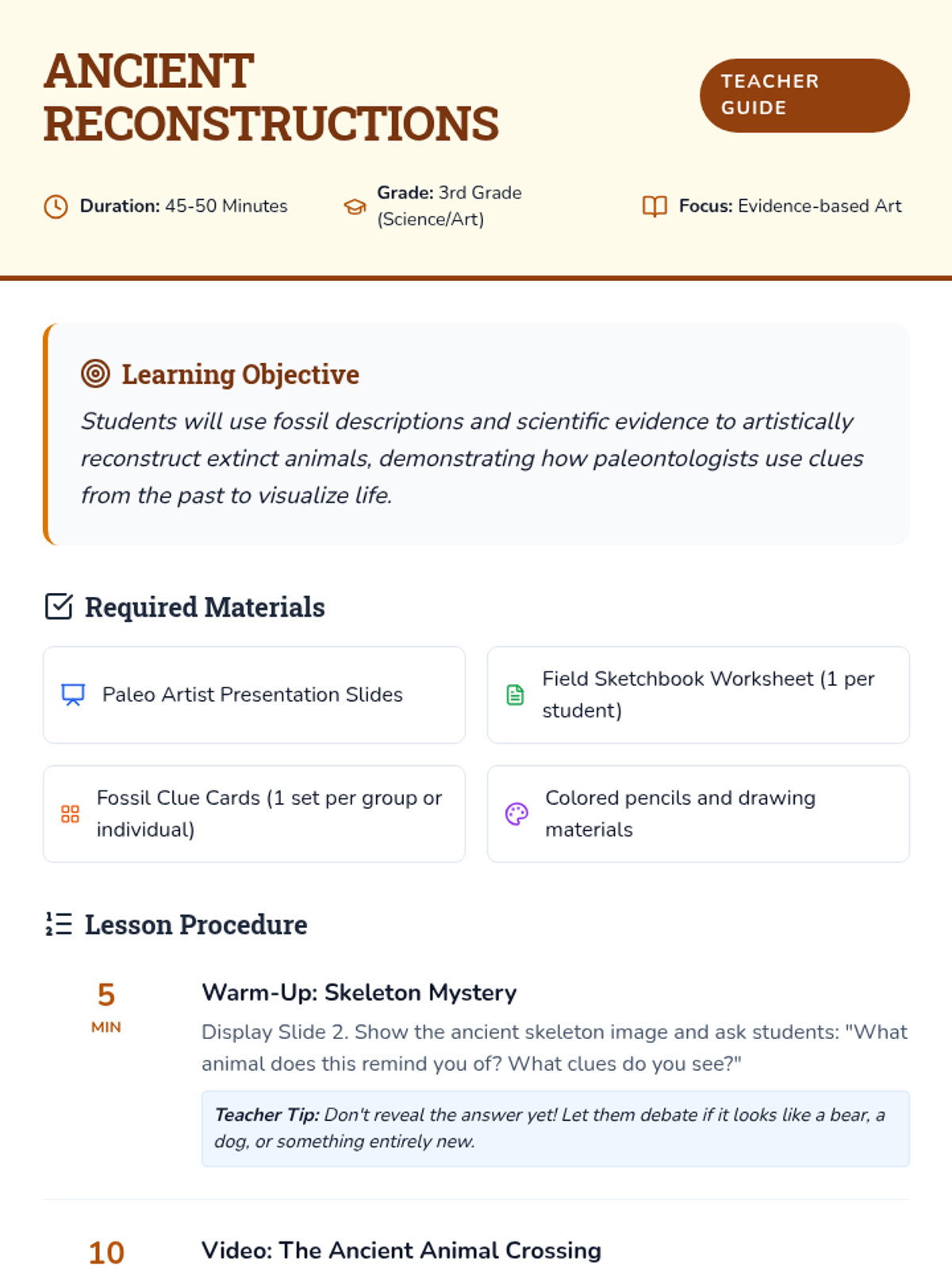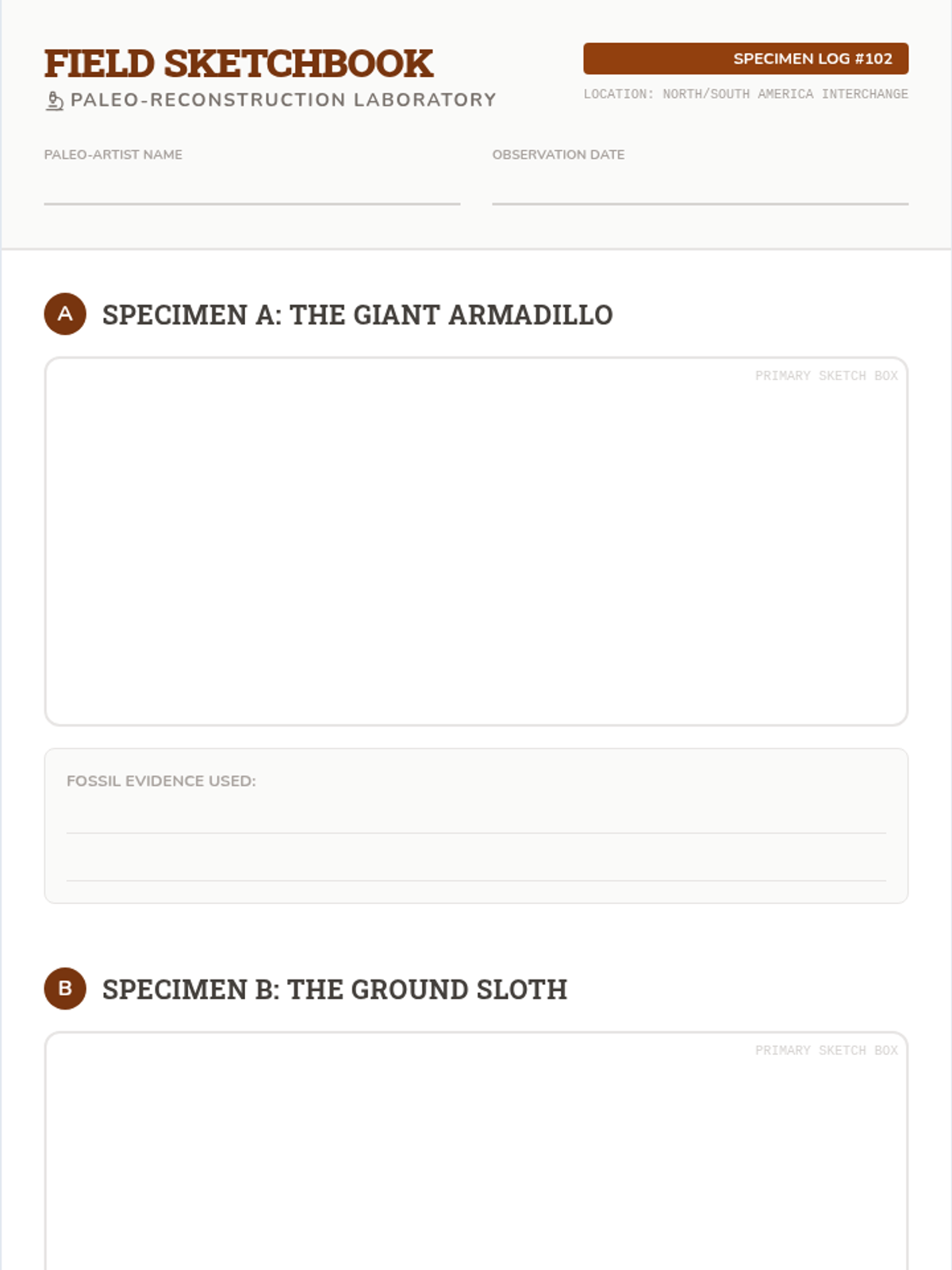 Students act as paleo-artists, using scientific descriptions of fossils to reconstruct extinct creatures like the Glyptodont and Giant Sloth before comparing their work to actual illustrations.
