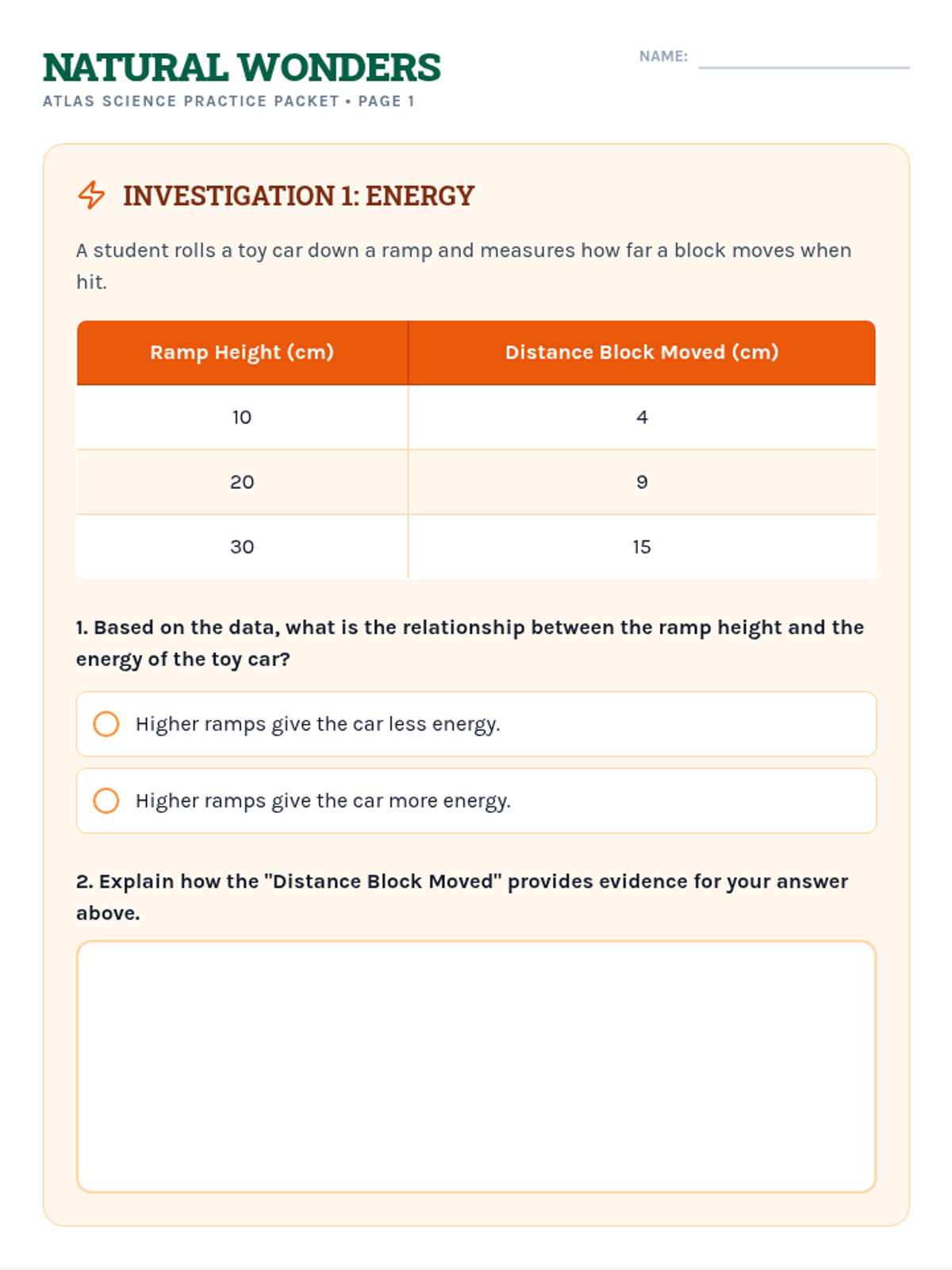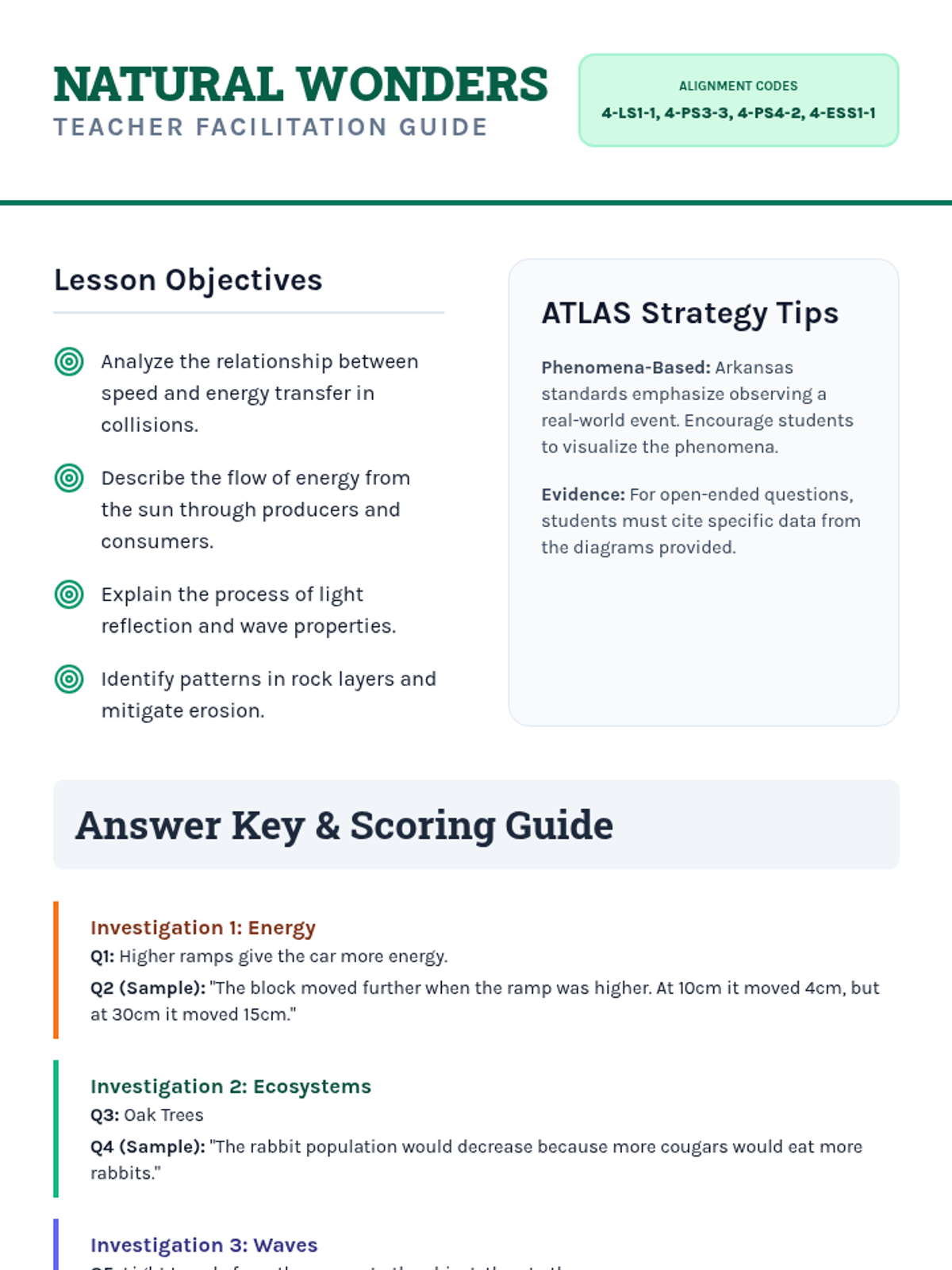 A comprehensive Grade 3 Science test prep lesson aligned to the Arkansas ATLAS standards. It covers core domains including life cycles, habitats, matter, forces, and weather through scenario-based learning and practice.