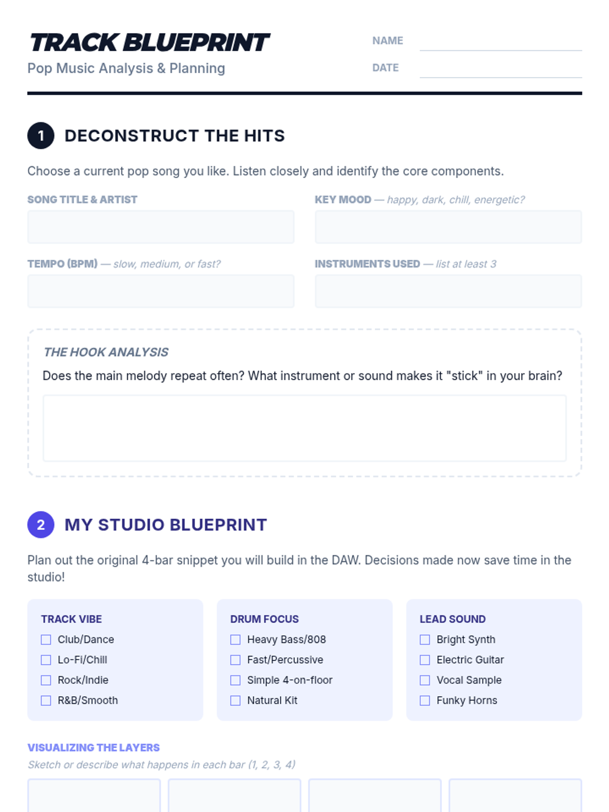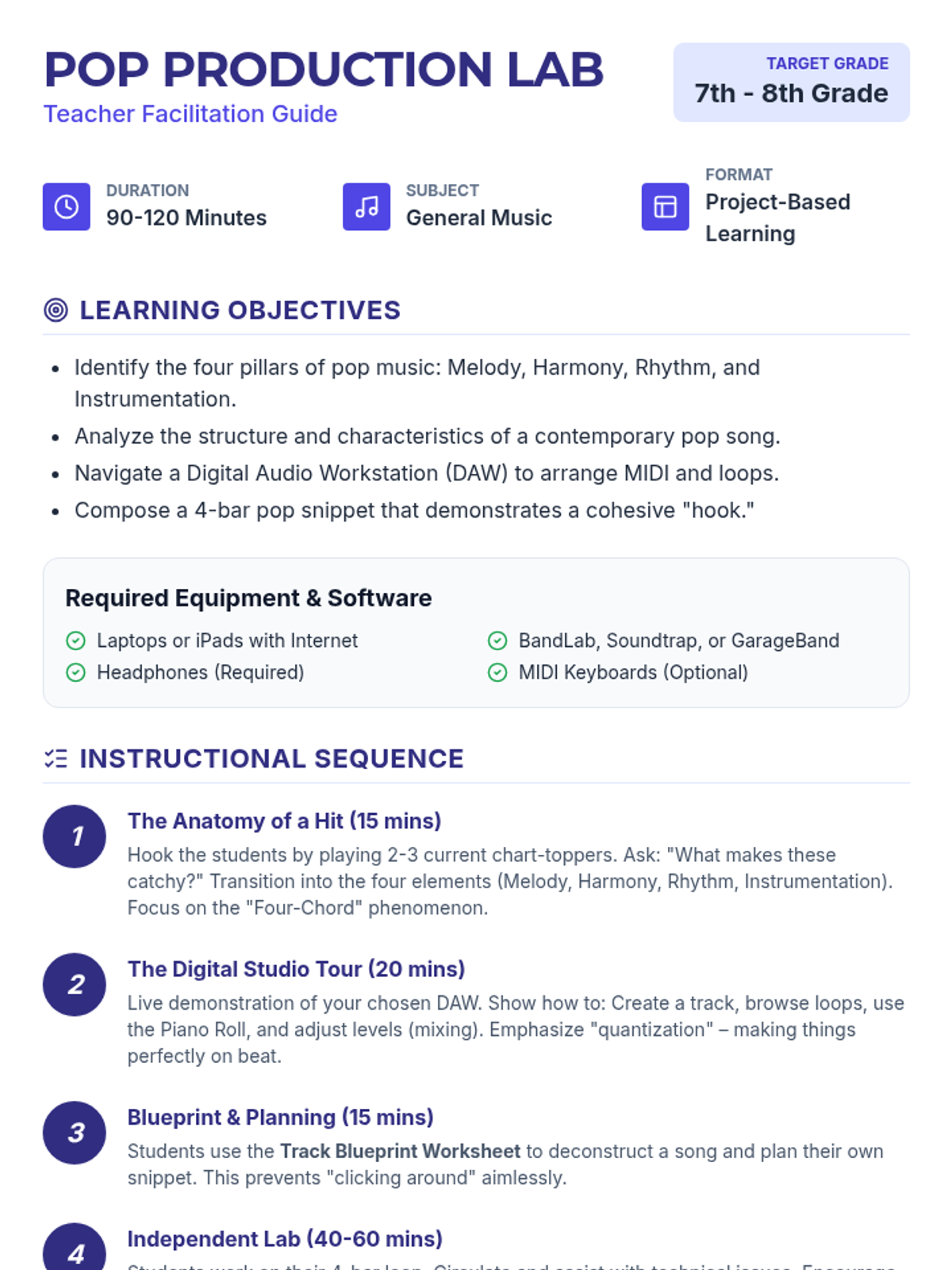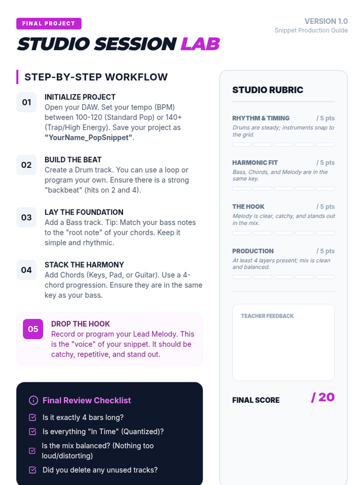 A project-based lesson where students learn the elements of modern pop music and use digital tools to create their own original 4-bar song snippet.