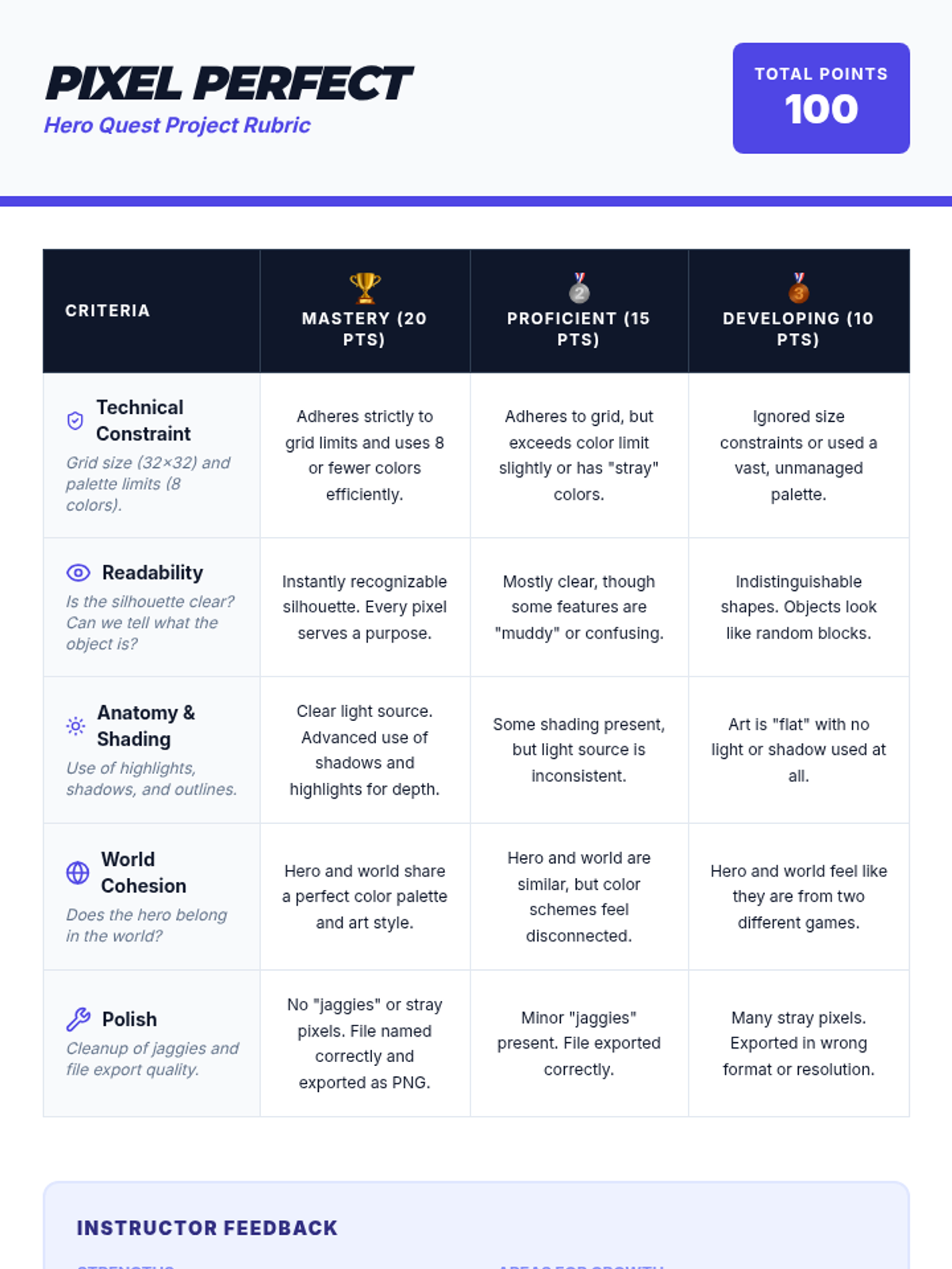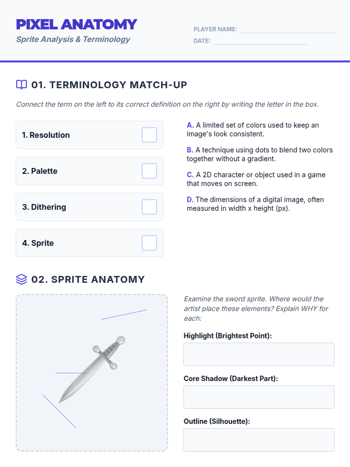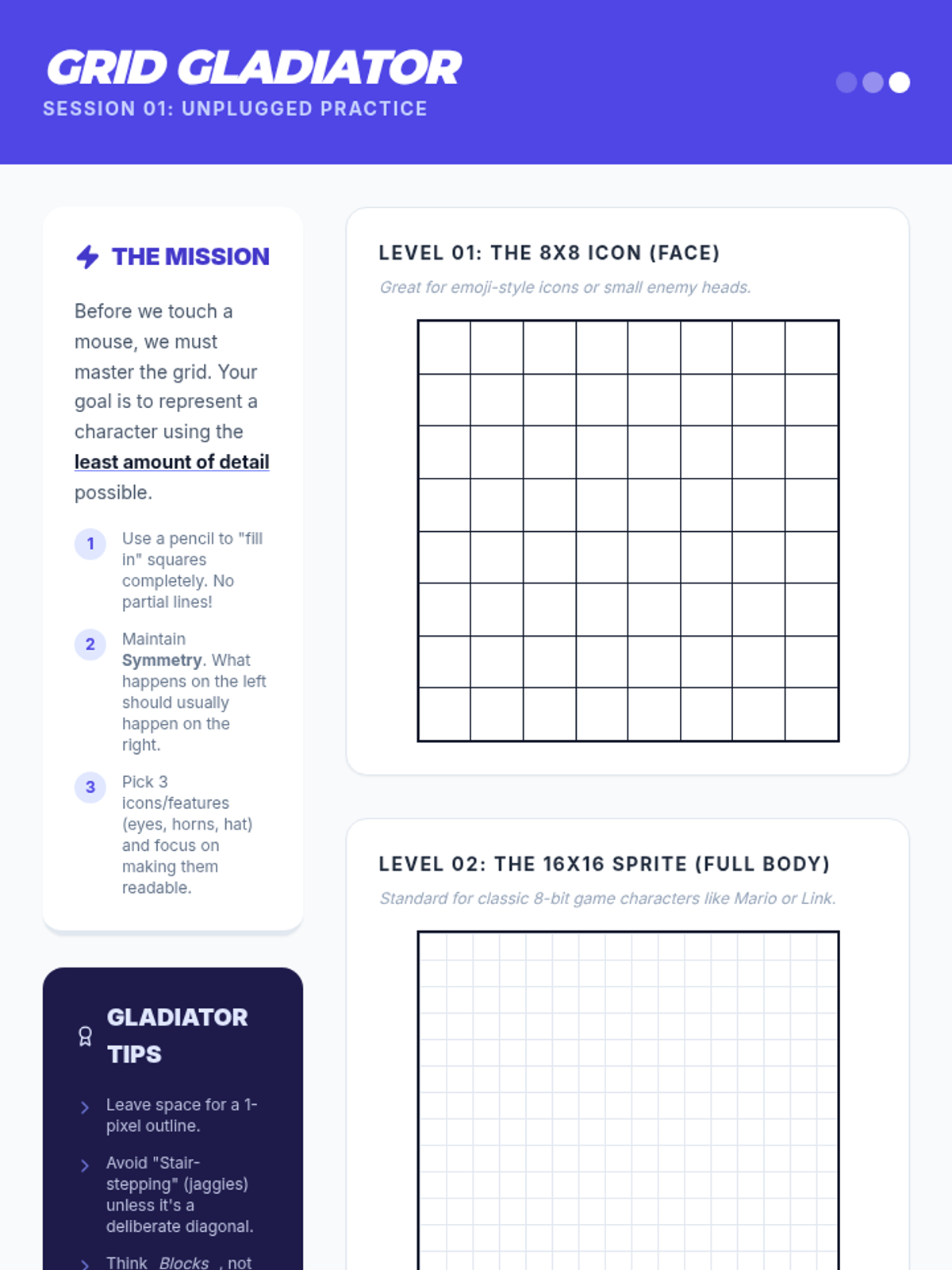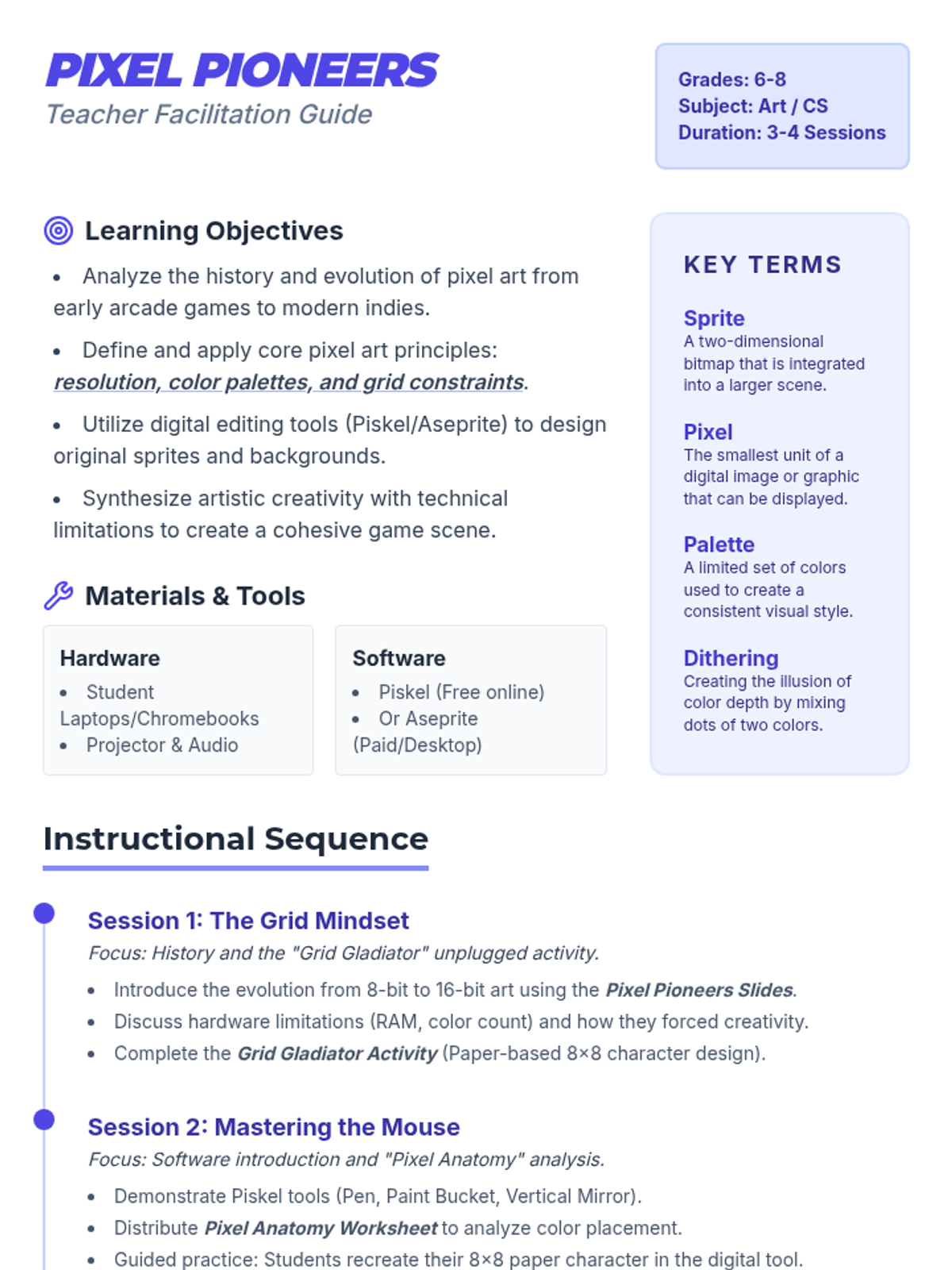 A comprehensive lesson exploring the history and techniques of pixel art, guiding students to create their own retro-style game characters and environments within technical constraints.