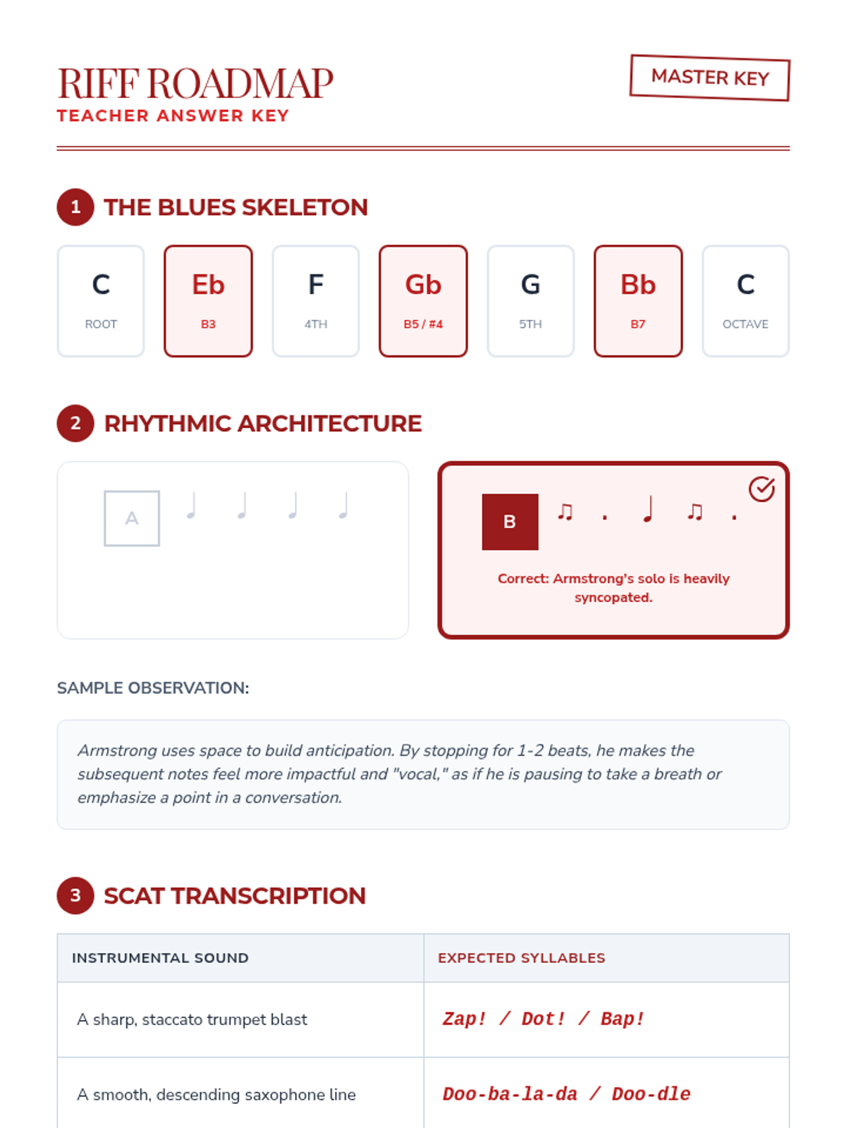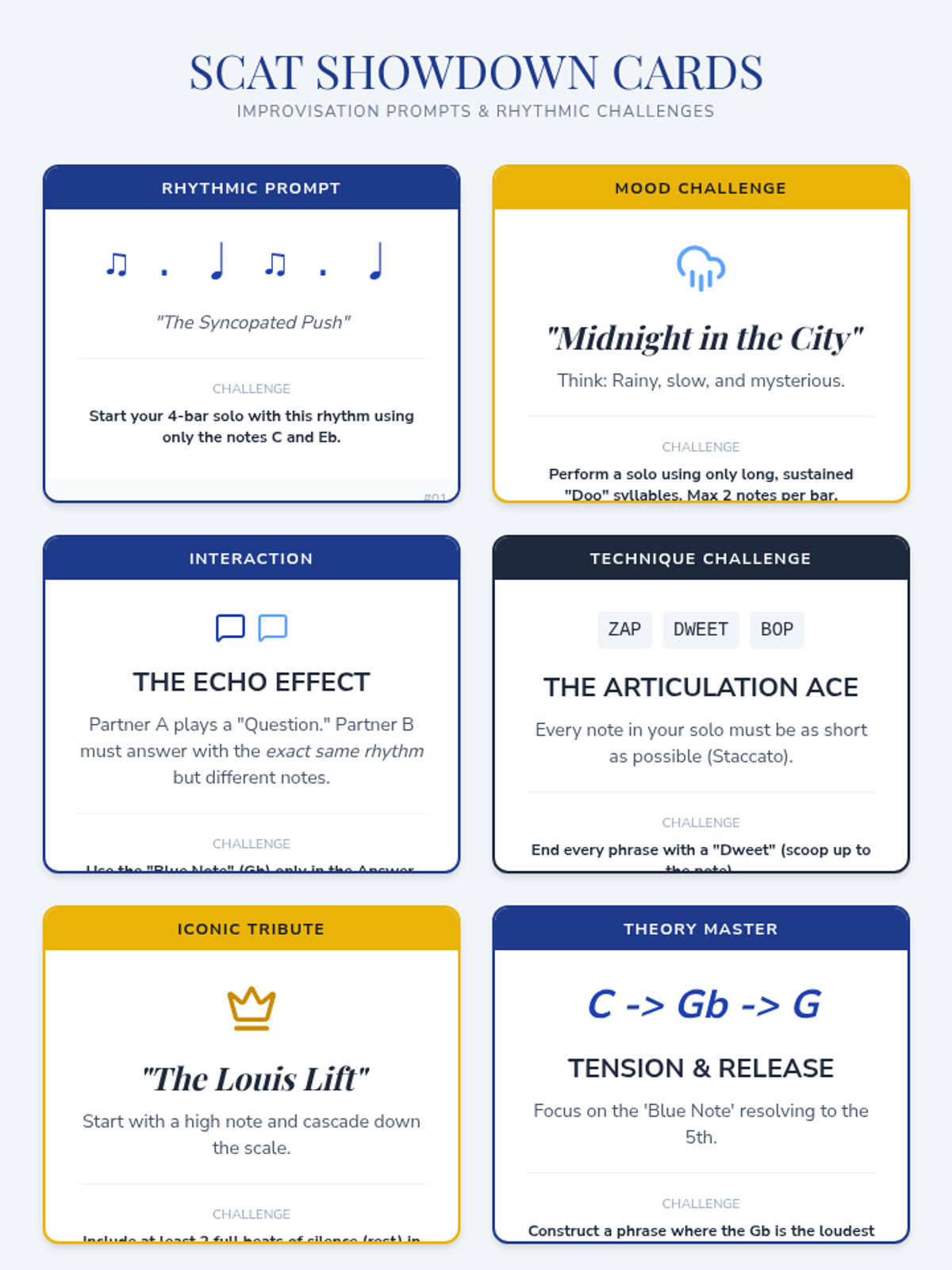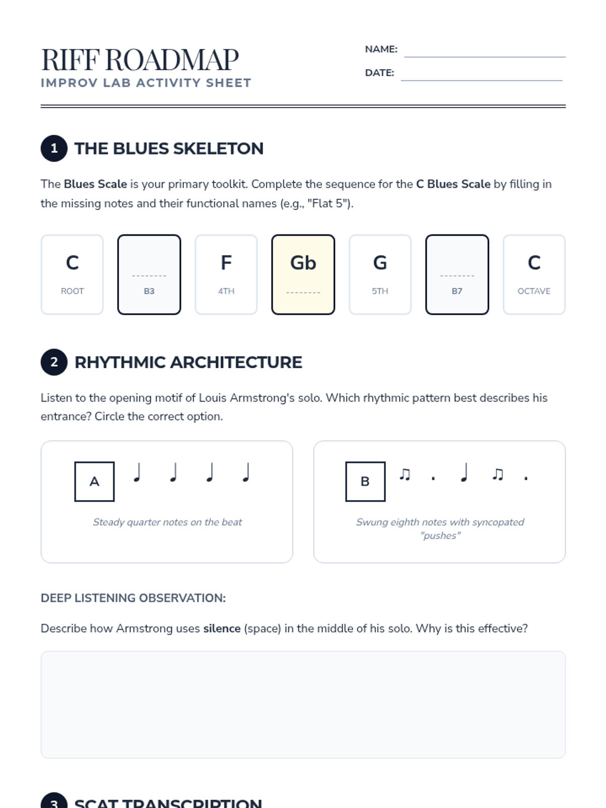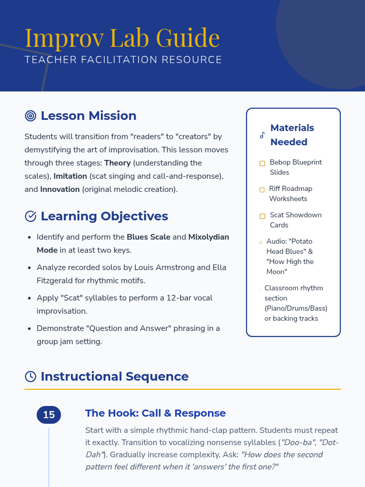 A comprehensive lesson for high school students to master the basics of jazz improvisation through theory, vocal exercises, and analysis of iconic solos.