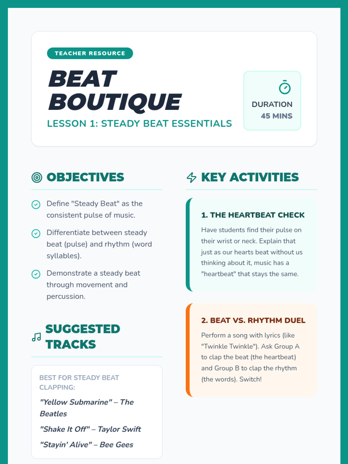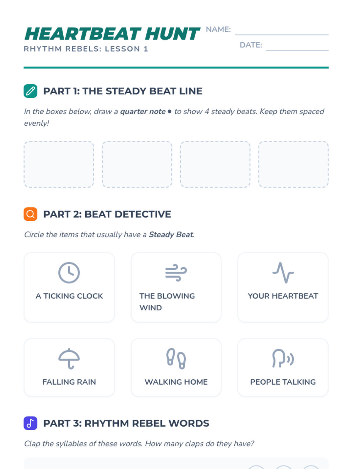 Students will differentiate between rhythm and steady beat using 'heartbeat' exercises and interactive clapping games.