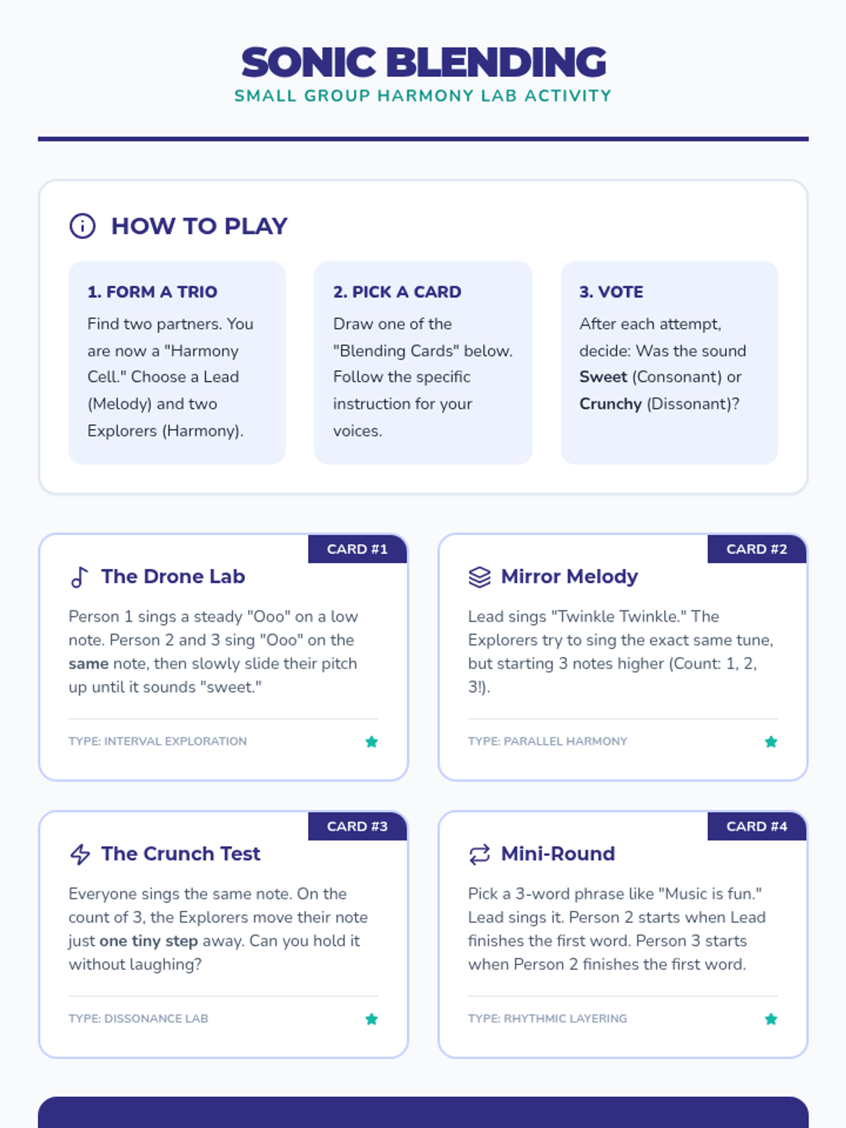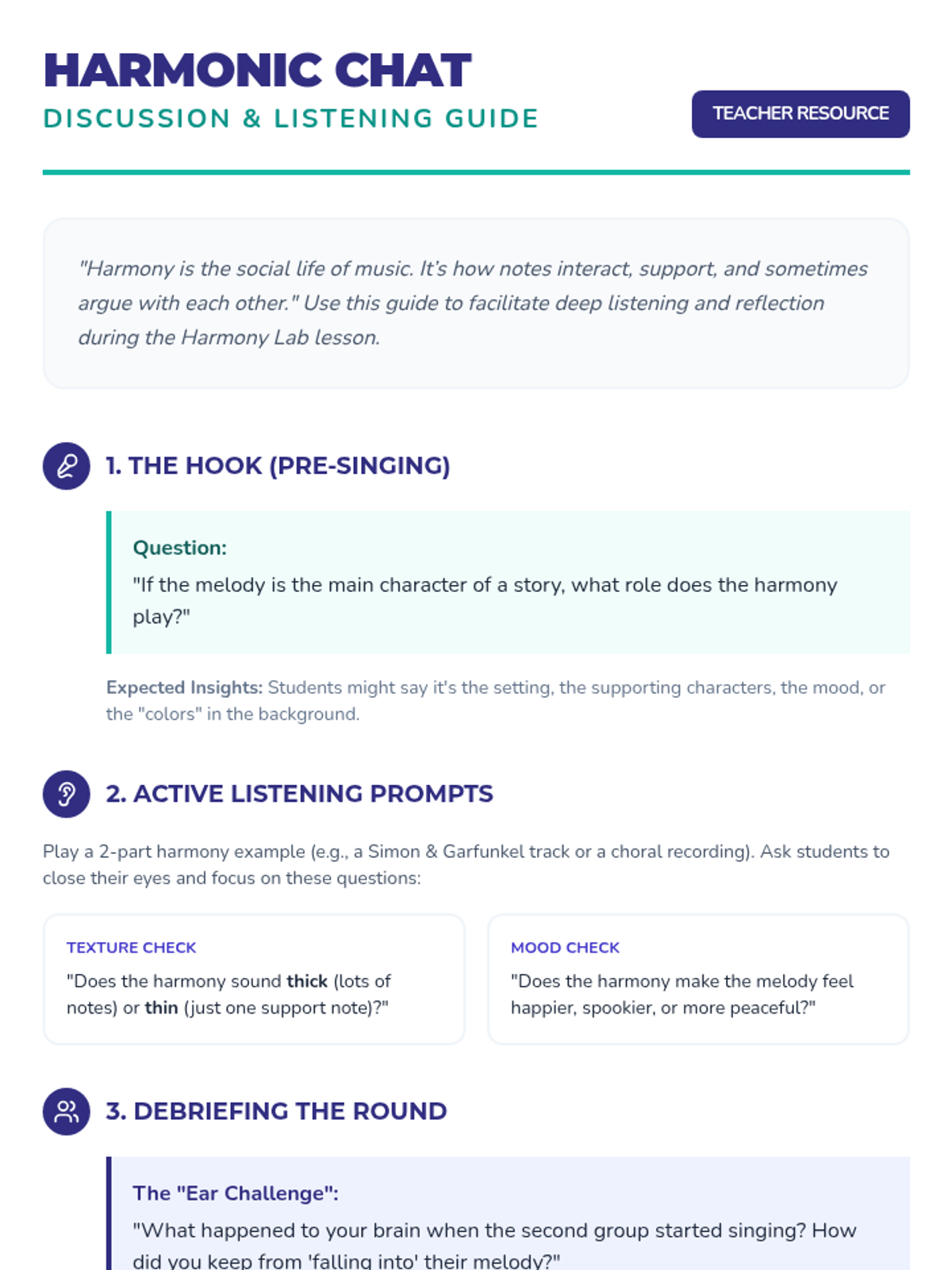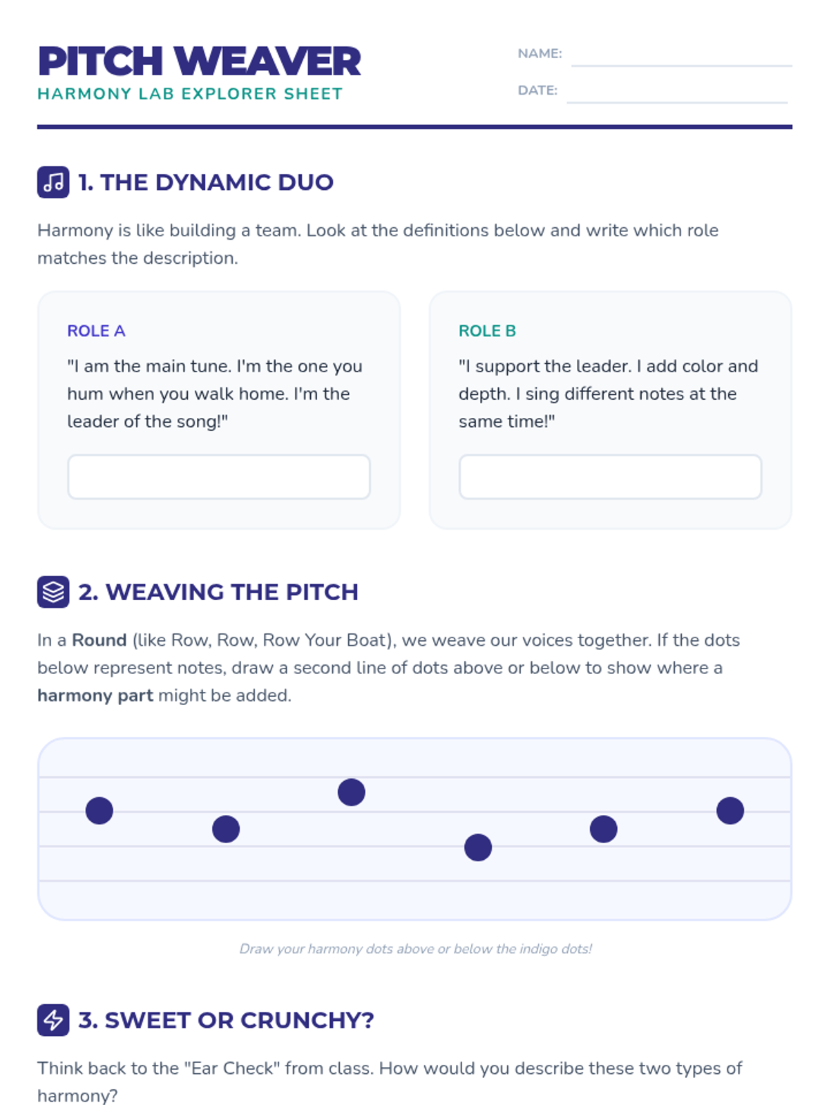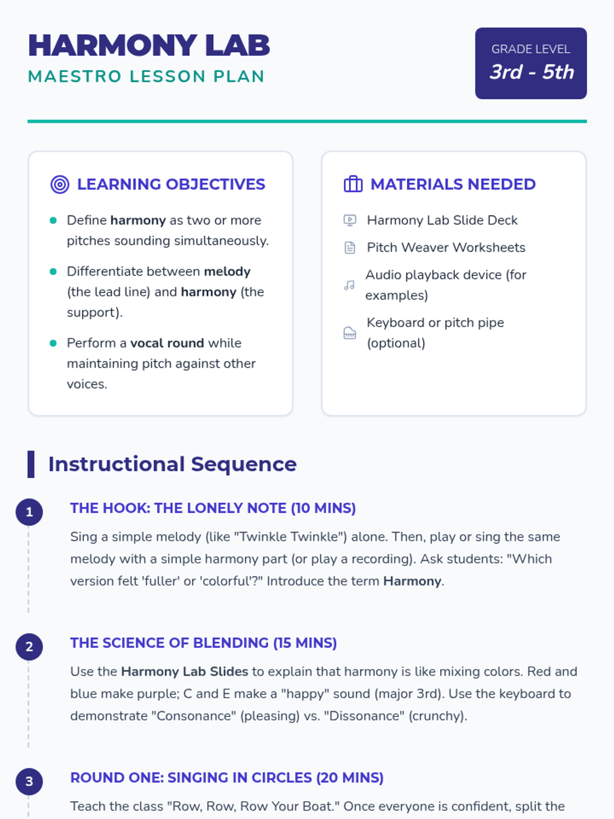 Students explore the concept of musical harmony through interactive singing exercises, listening tasks, and collaborative blending activities. They will learn to distinguish between melody and harmony and participate in multi-part vocal performances.
