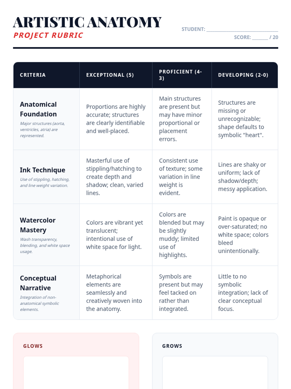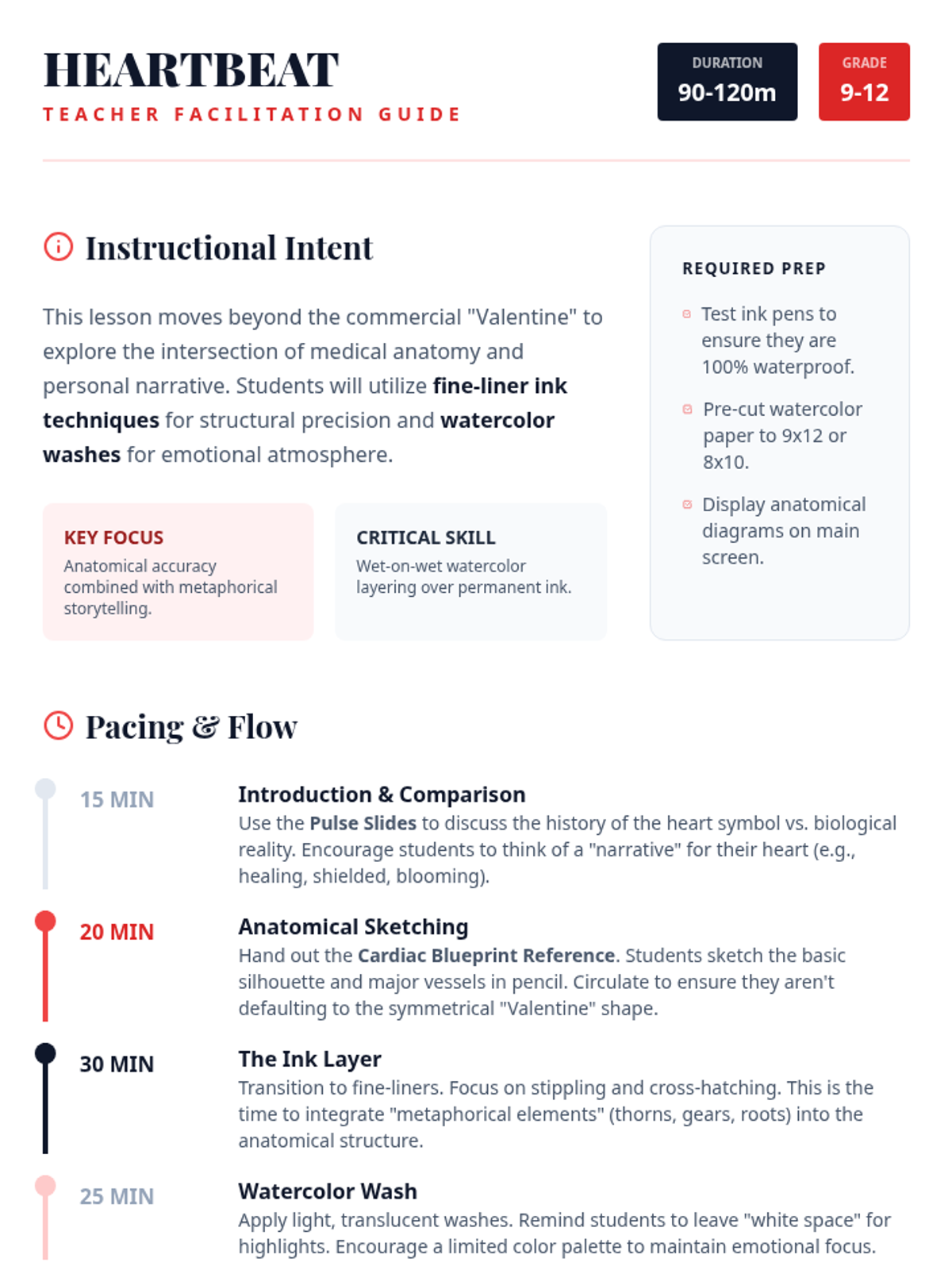 A sophisticated art lesson for high school students focusing on creating anatomical mixed-media hearts for Valentine's Day. Students explore the intersection of science and emotion through ink and watercolor techniques.