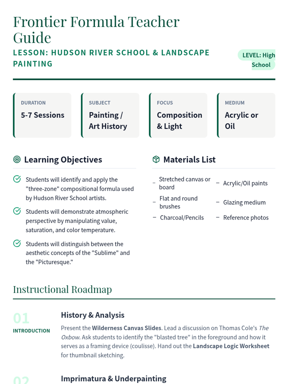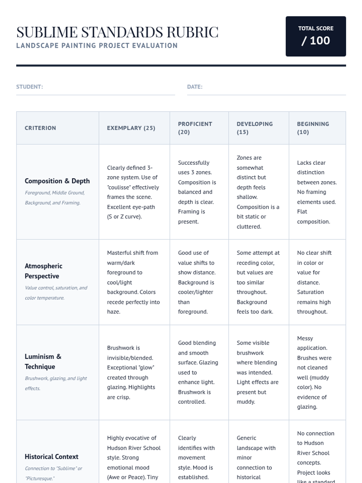 A high school painting lesson exploring the Hudson River School movement, focusing on the technical aspects of landscape composition, luminism, and the concept of the 'sublime' in 19th-century American art. Students will analyze masterworks and apply these techniques to their own landscape paintings.