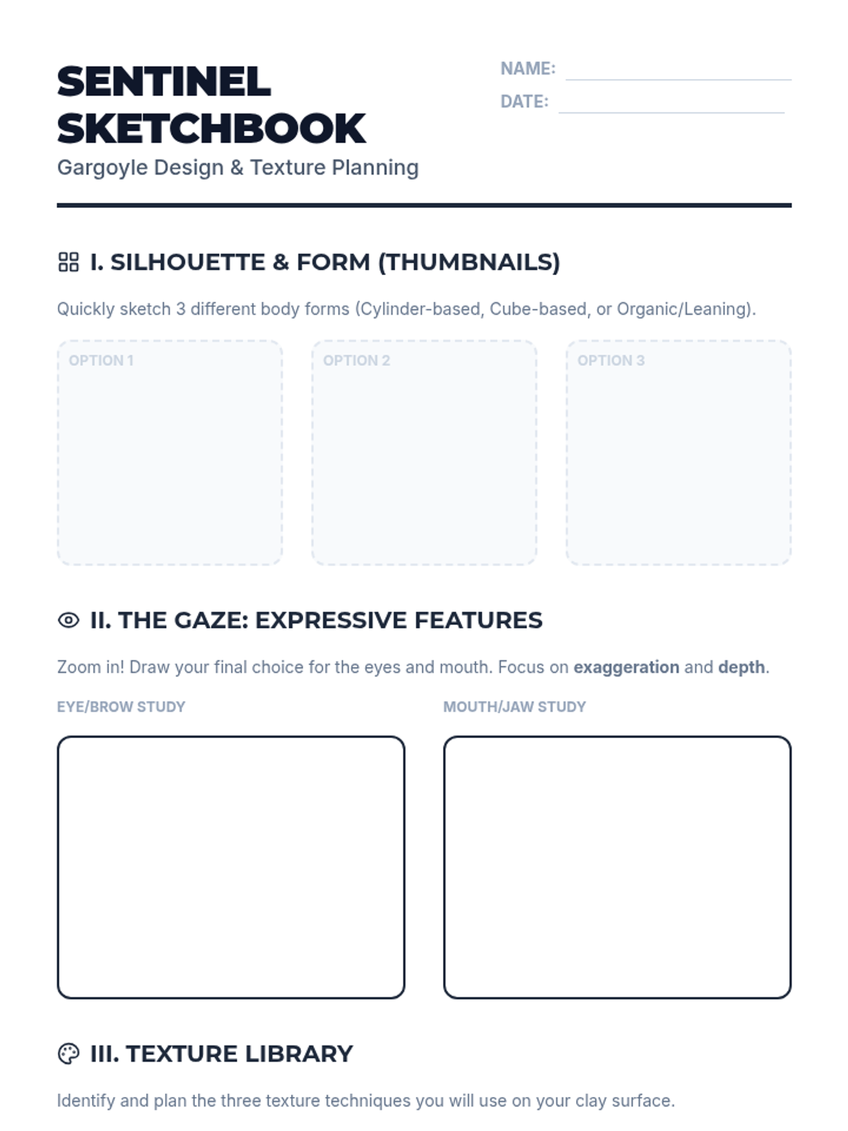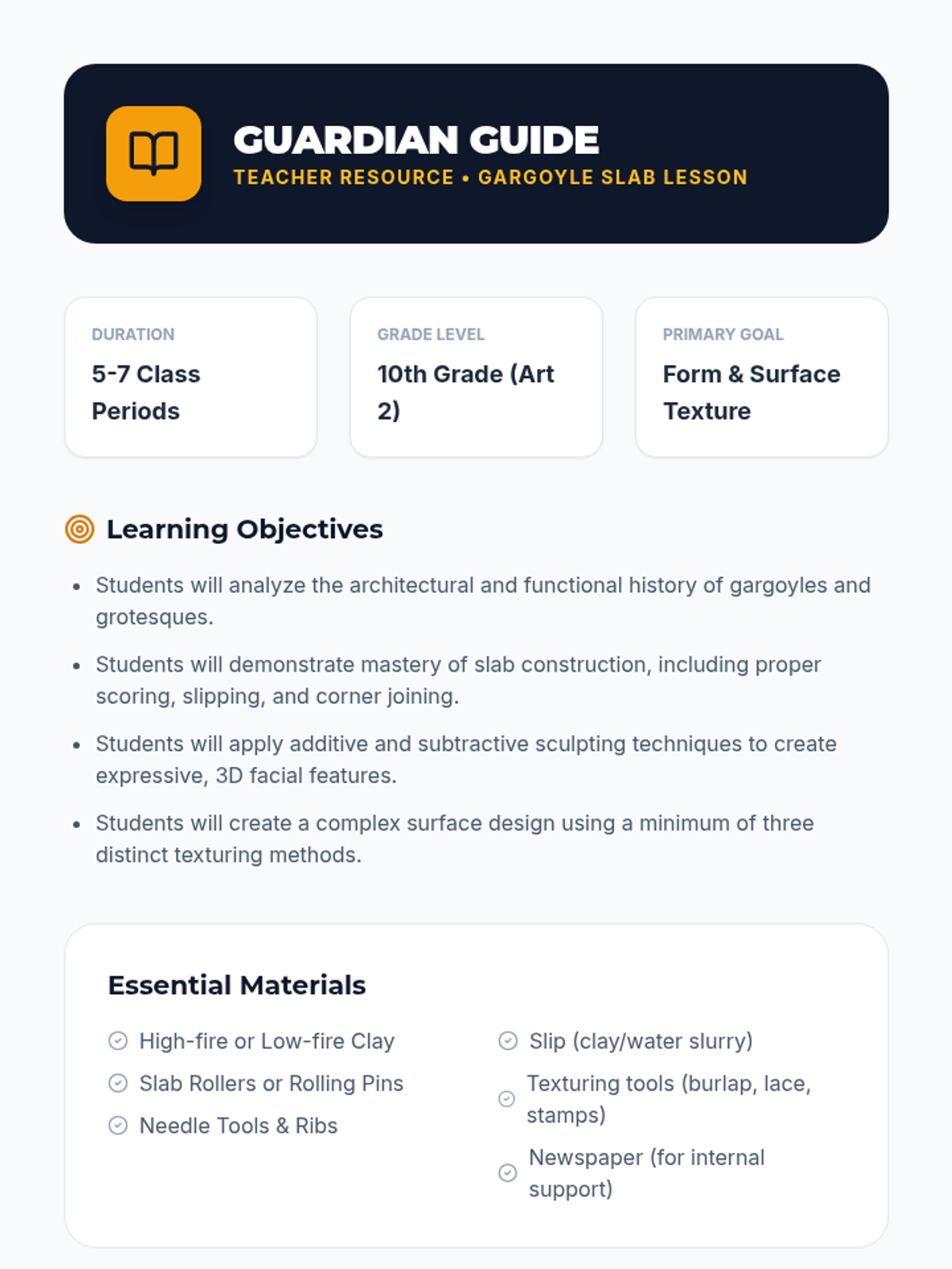 A comprehensive lesson for 10th grade Art 2 students focusing on slab-building techniques to create expressive gargoyles. Students will learn the architectural history of gargoyles while mastering advanced facial feature sculpting and diverse surface textures in clay.