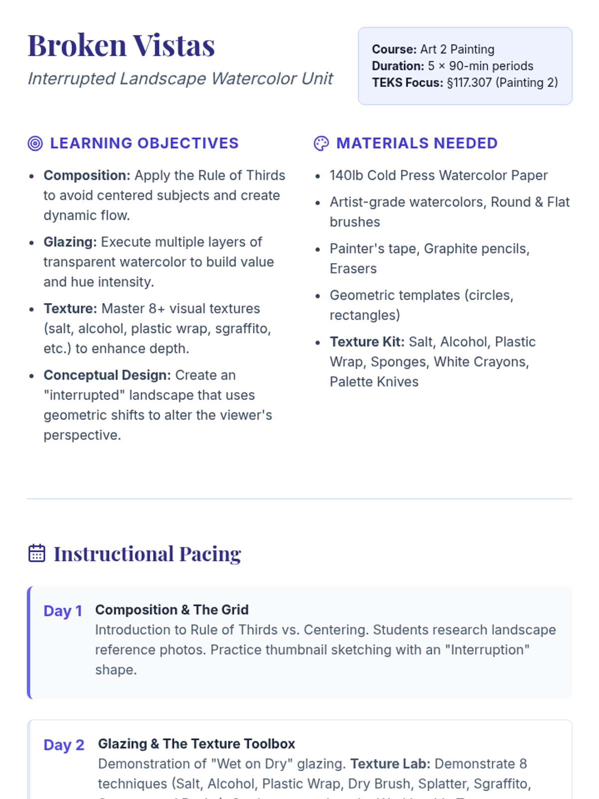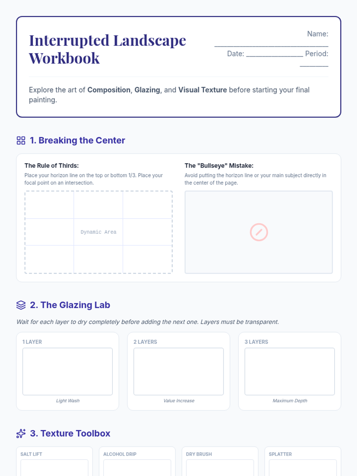 A comprehensive 5-day unit for Art 2 students focusing on watercolor glazing, Rule of Thirds composition, and the 'interrupted' landscape technique. Students will learn to avoid centered compositions and build depth through transparent layers.