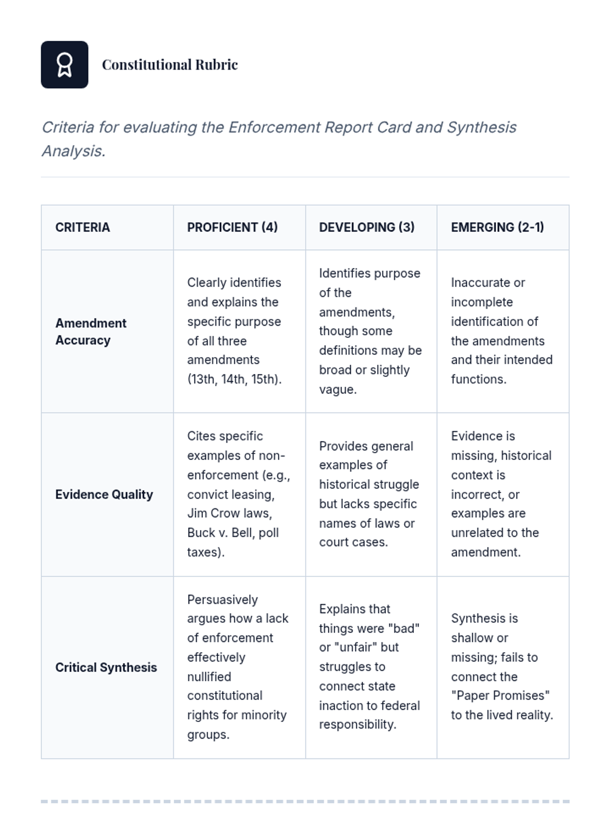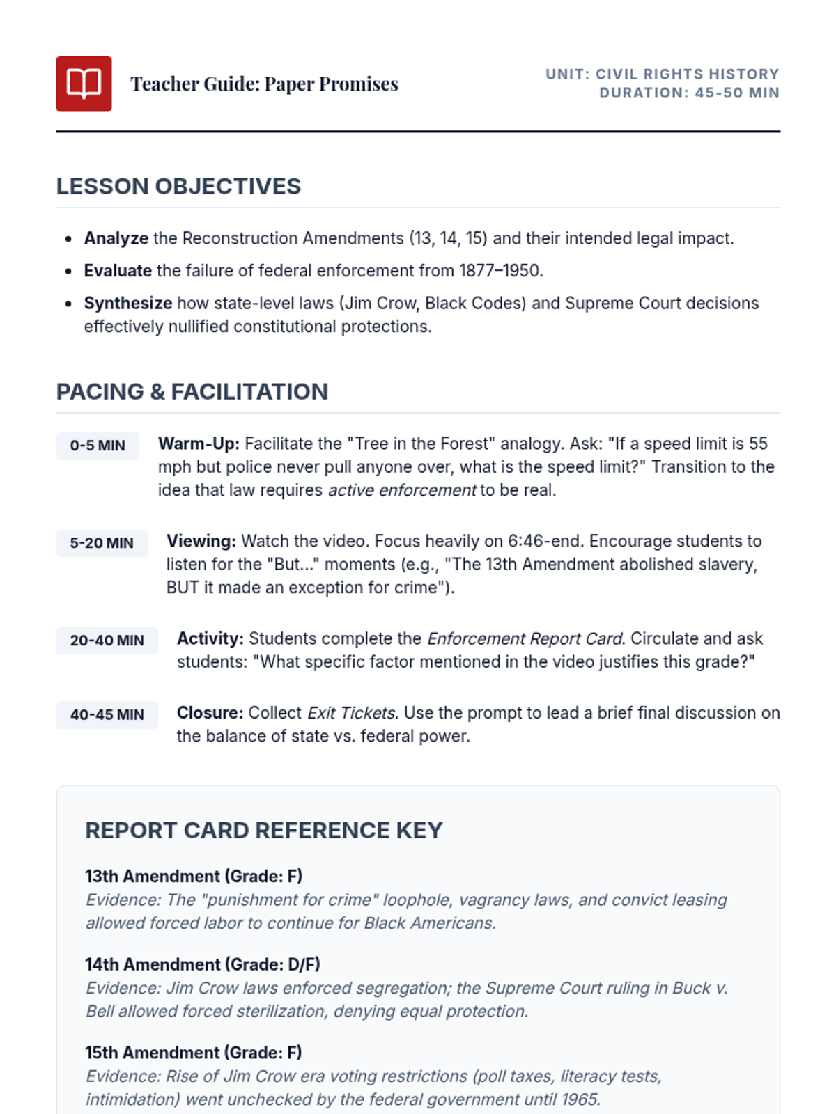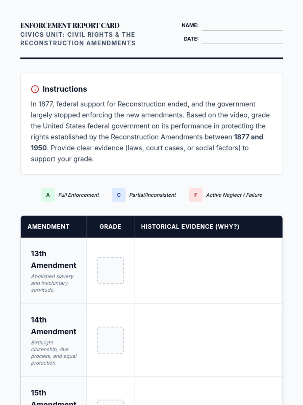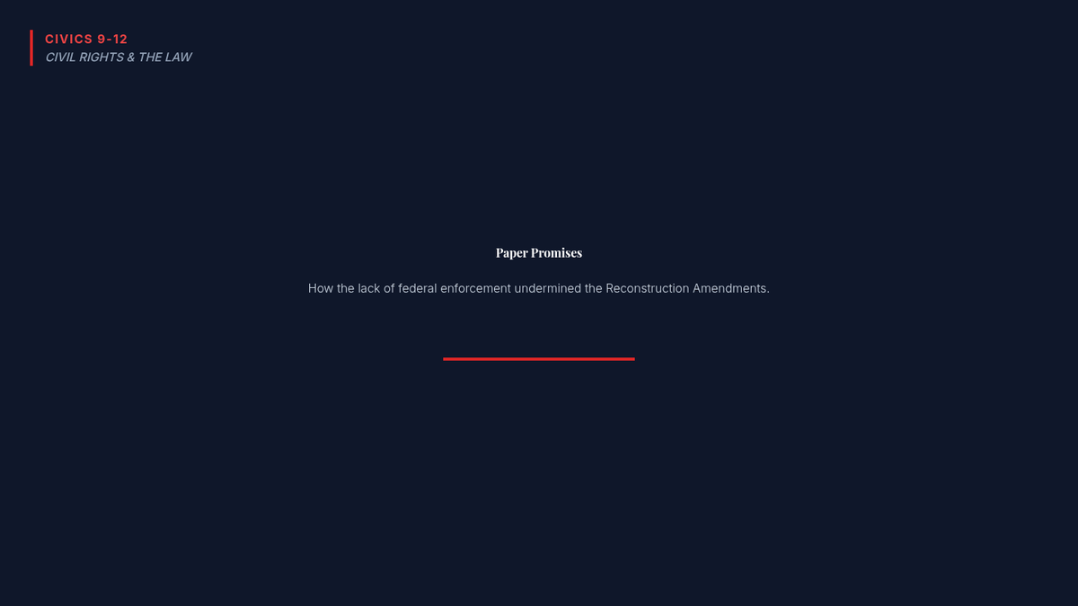 Students analyze the gap between constitutional law and lived reality during the Jim Crow era, focusing on how a lack of federal enforcement undermined the 13th, 14th, and 15th Amendments.