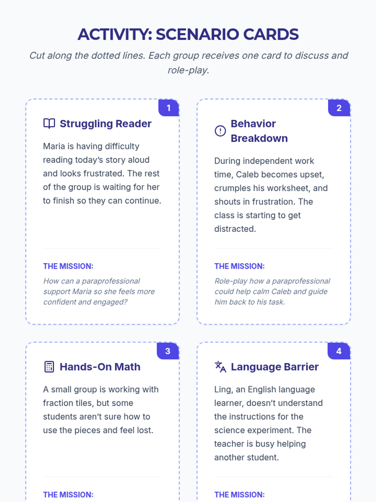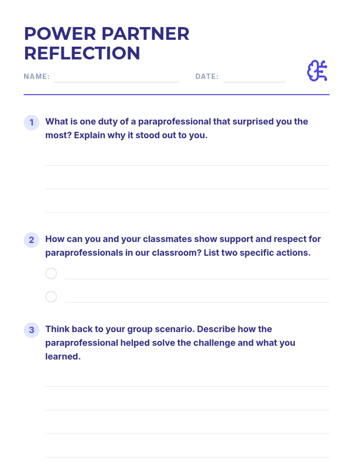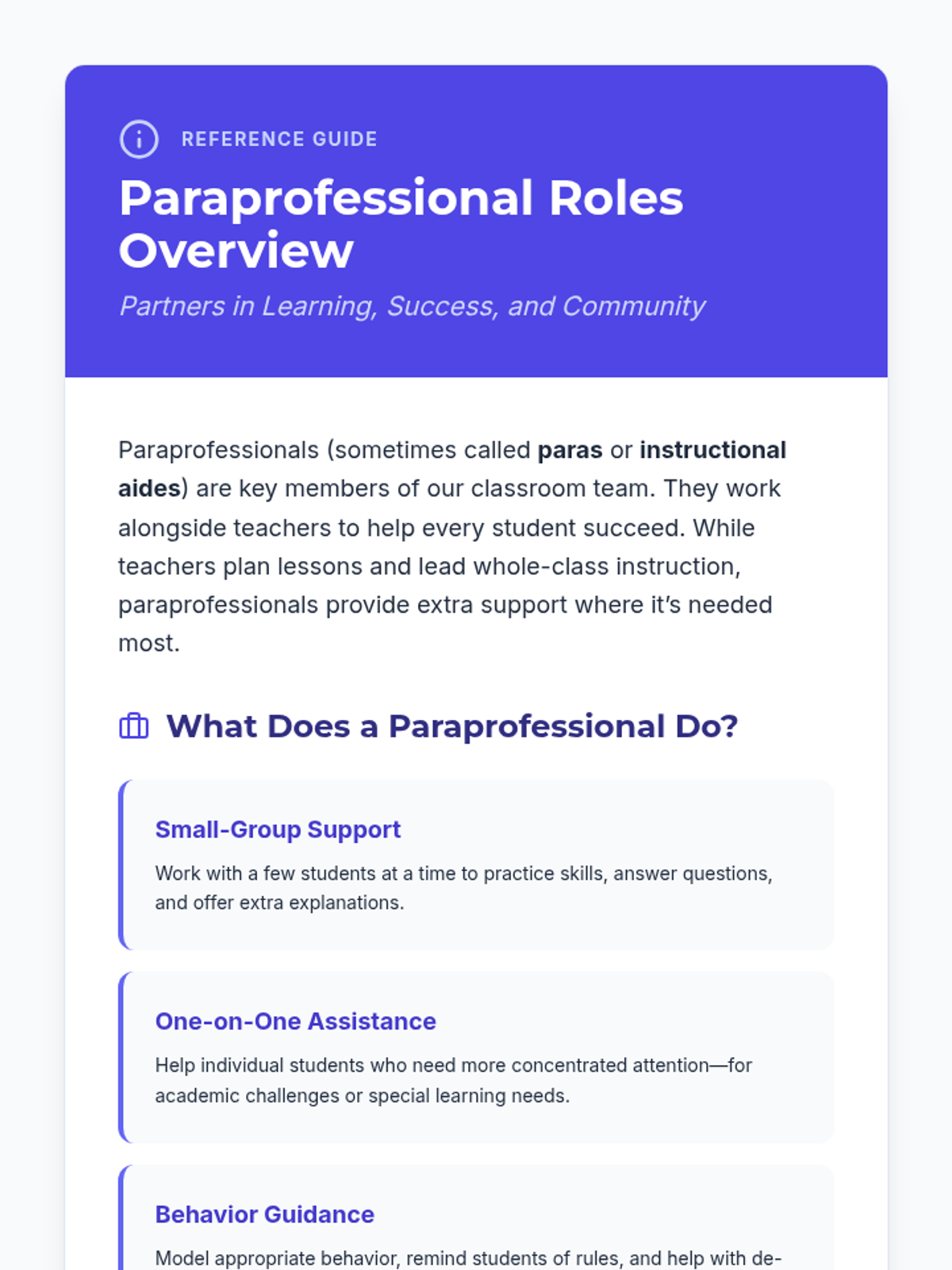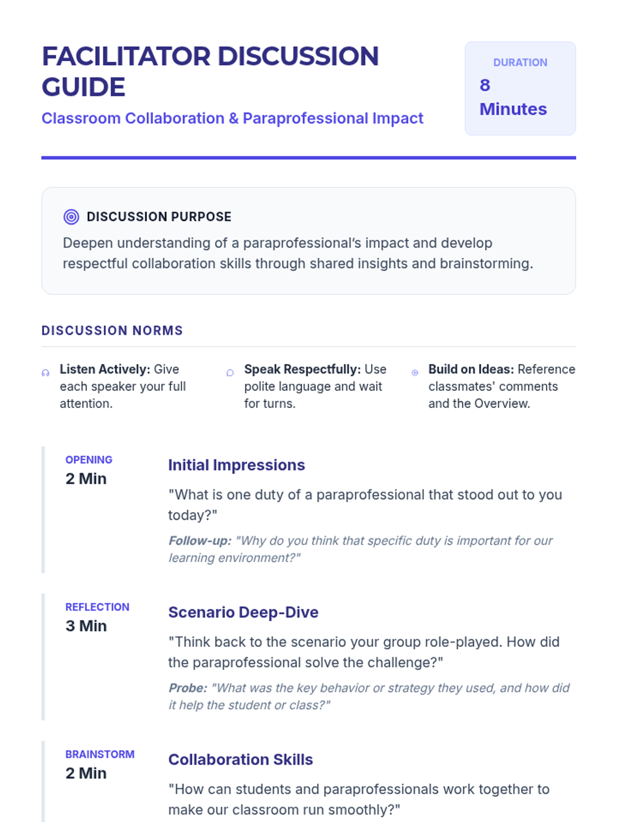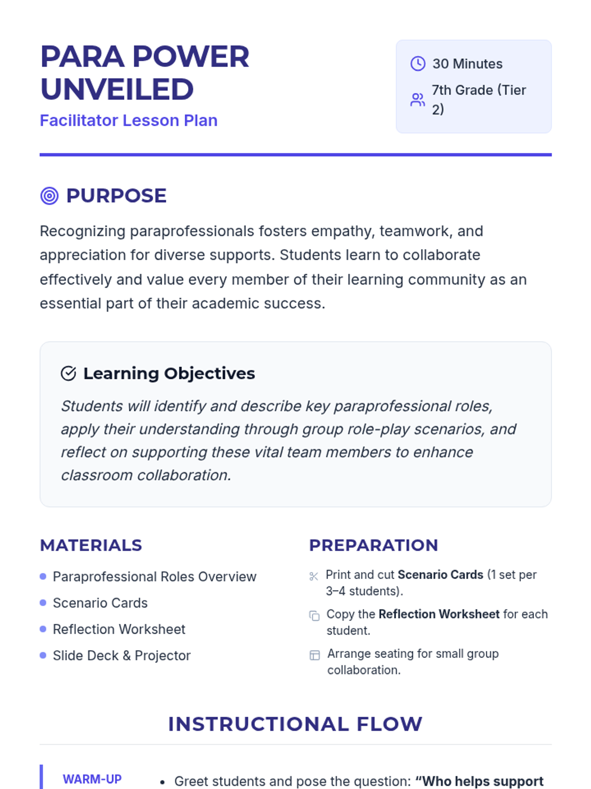 In this 30-minute Tier 2 lesson for 7th graders, students will learn about the roles, responsibilities, and importance of paraprofessionals in schools. Understanding these key team members empowers students to collaborate better and appreciate diverse supports in their learning environment.