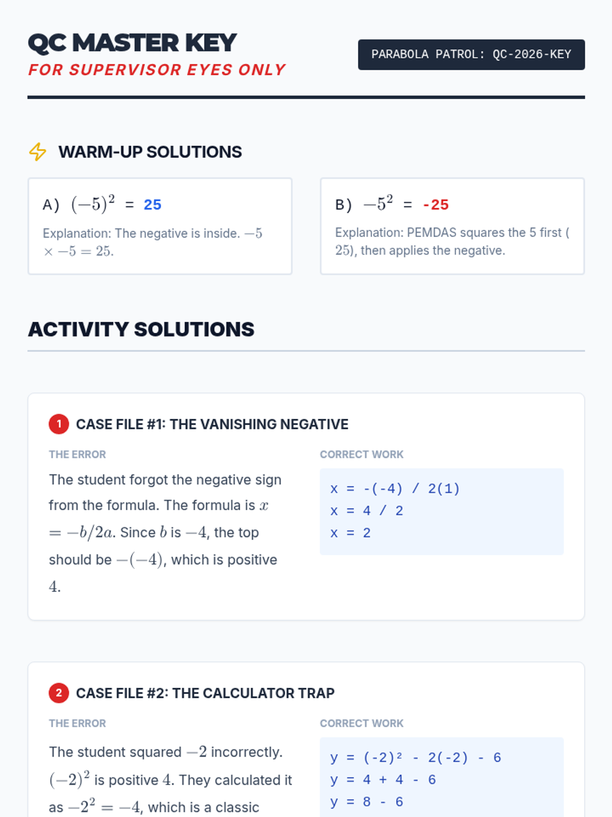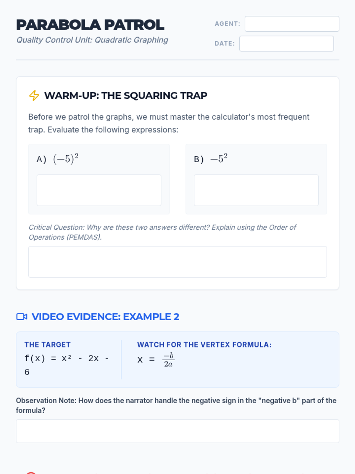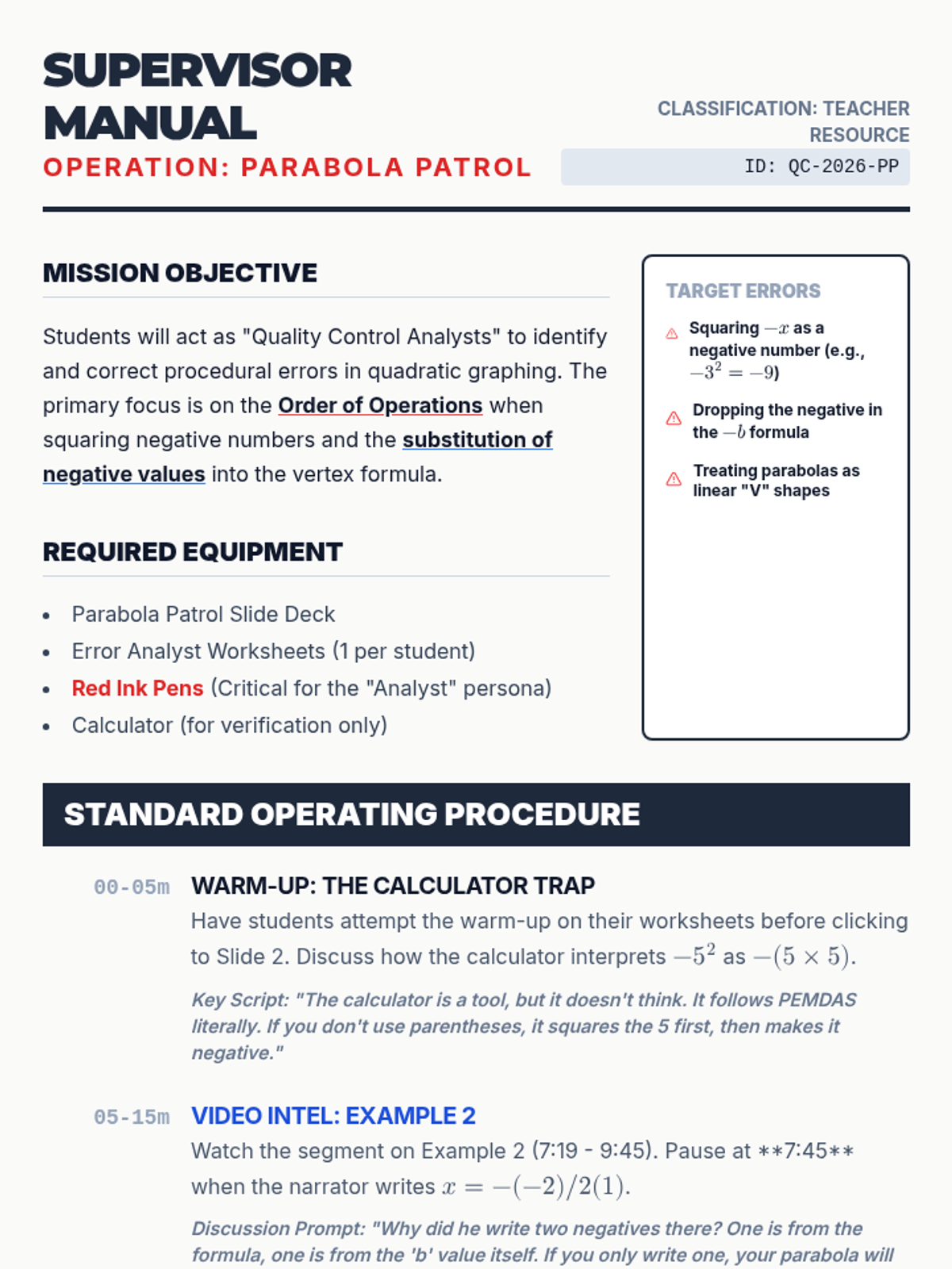 A high-school intervention lesson focused on identifying and correcting common algebraic errors when graphing quadratic functions, with a specific emphasis on the order of operations and negative numbers.
