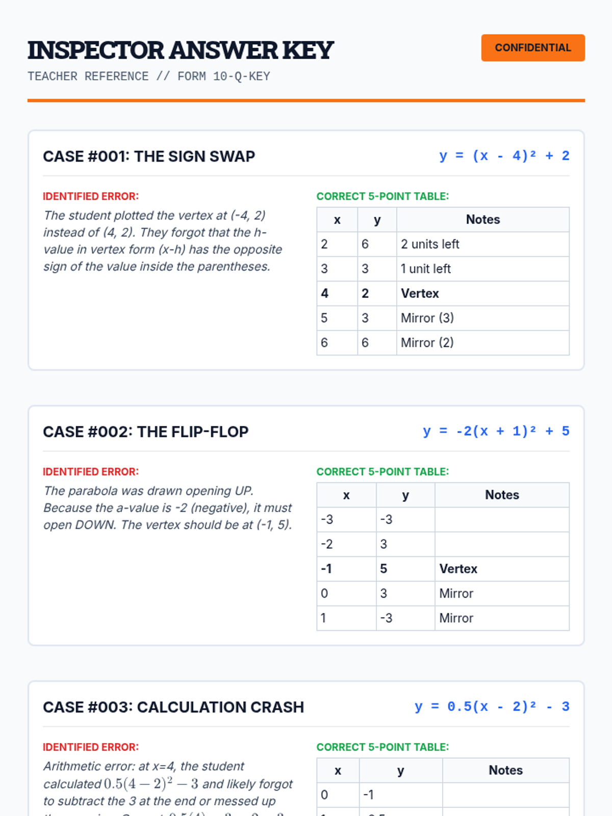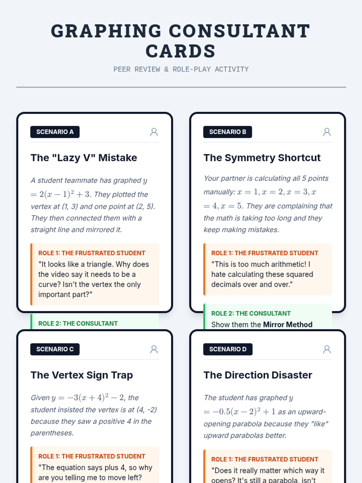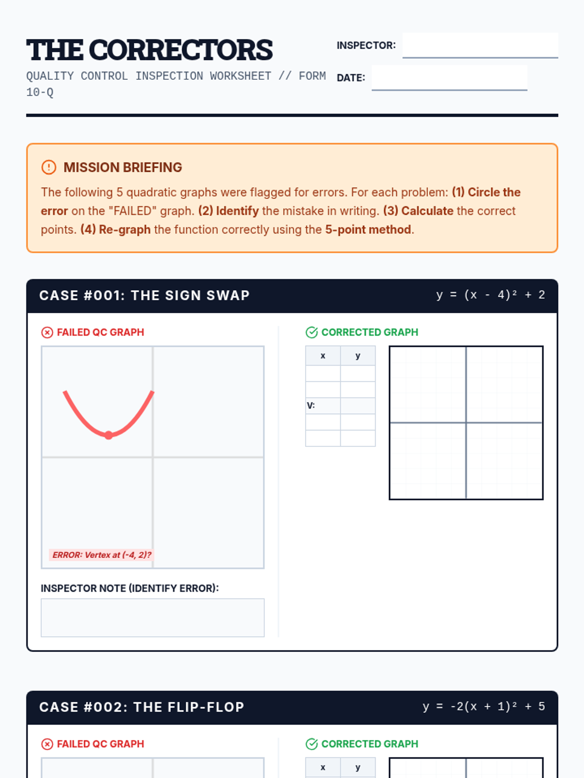 A 10th-grade algebra review lesson focused on identifying and correcting common errors when graphing quadratic functions from vertex form. Students use a 5-point method and symmetry to ensure accuracy, culminating in a 'Quality Control' activity and peer role-play.