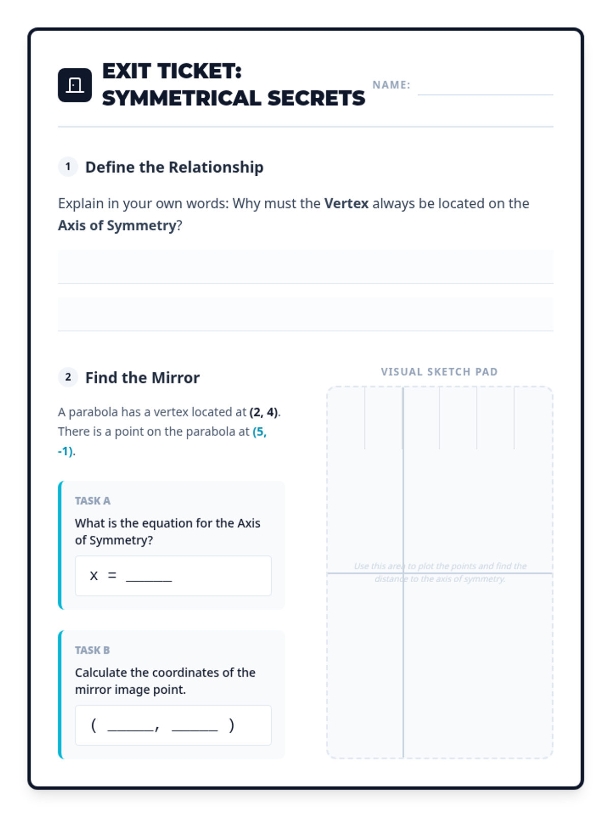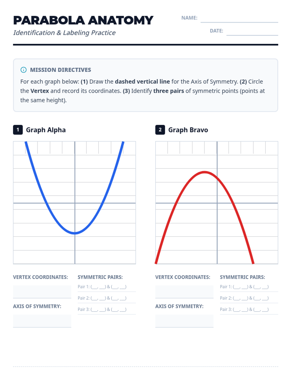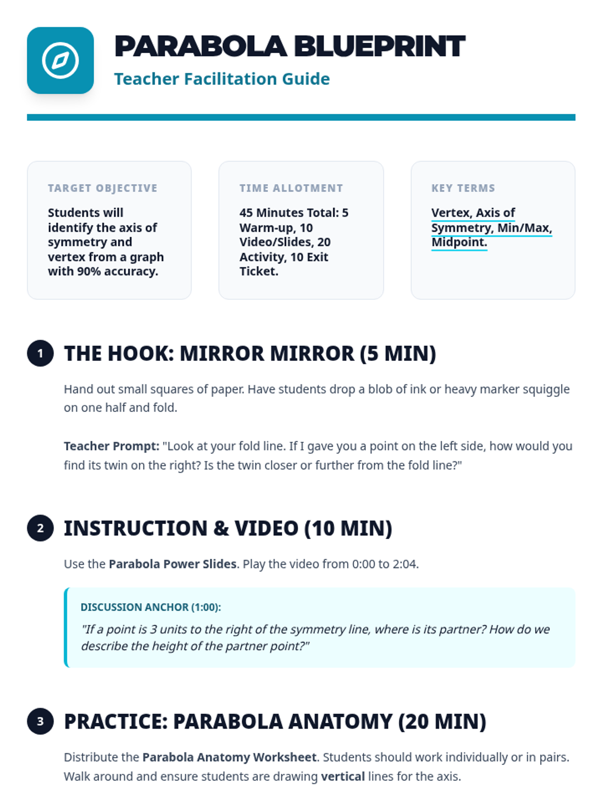 Students will learn to identify the axis of symmetry and vertex of a parabola from a graph through visual exploration, video analysis, and hands-on labeling.
