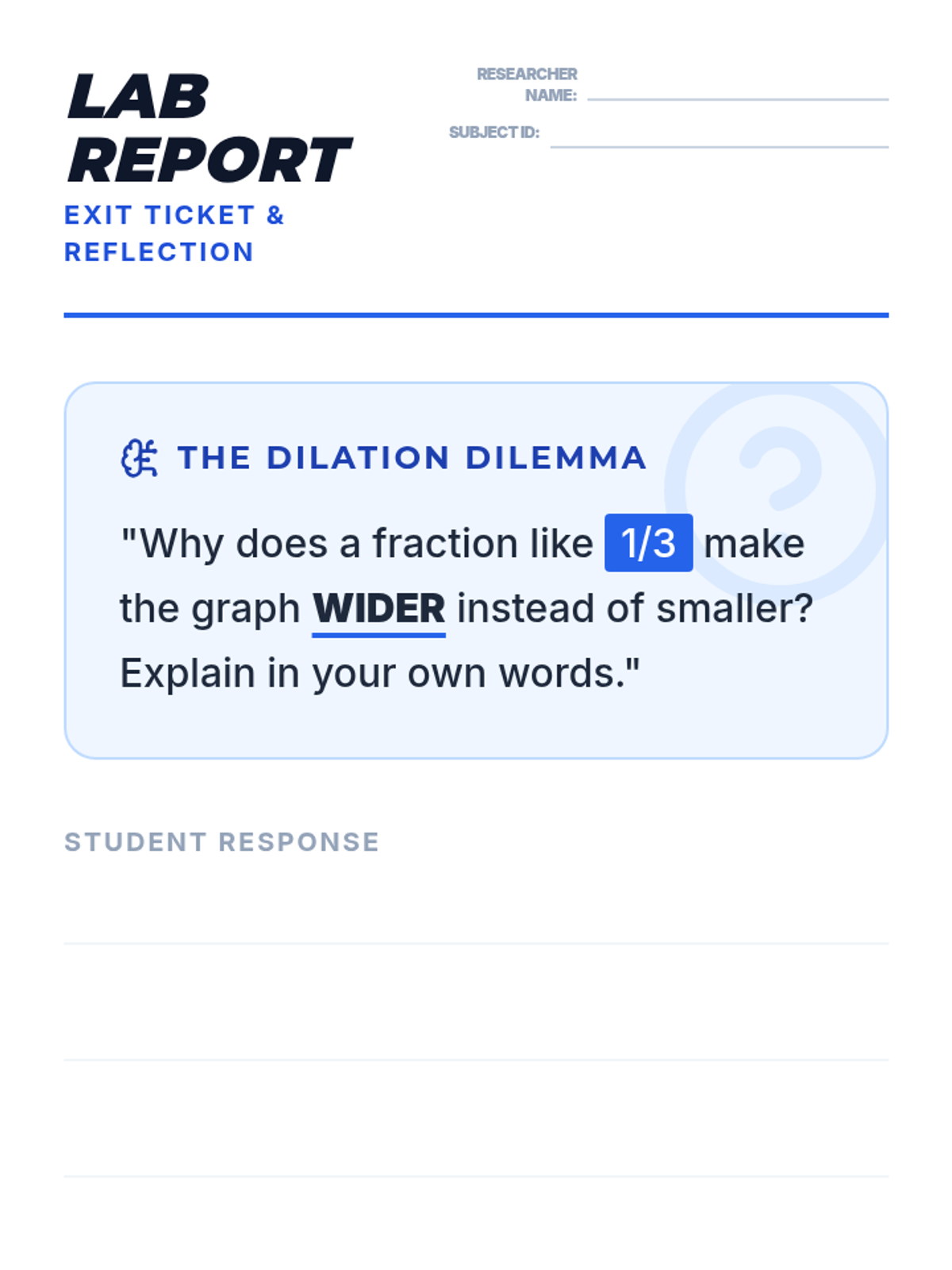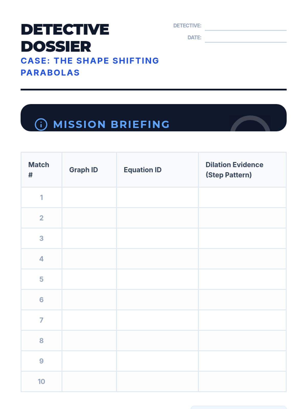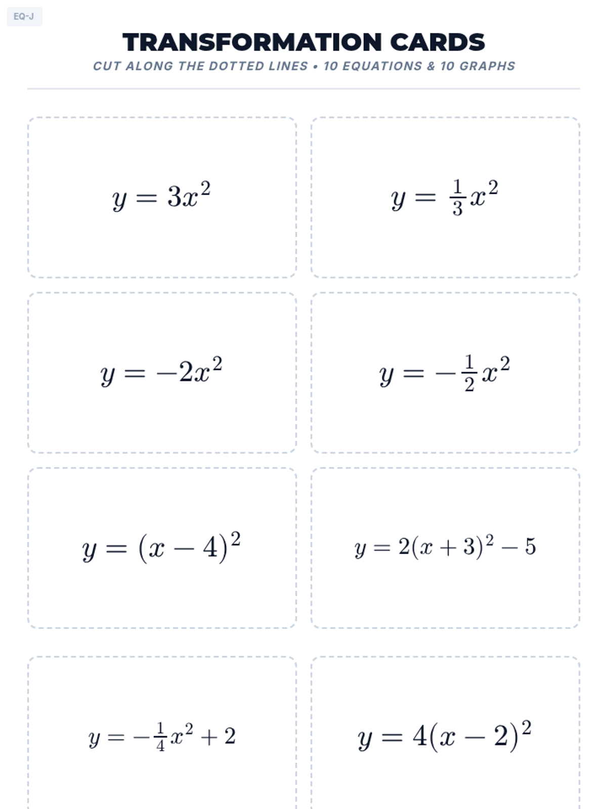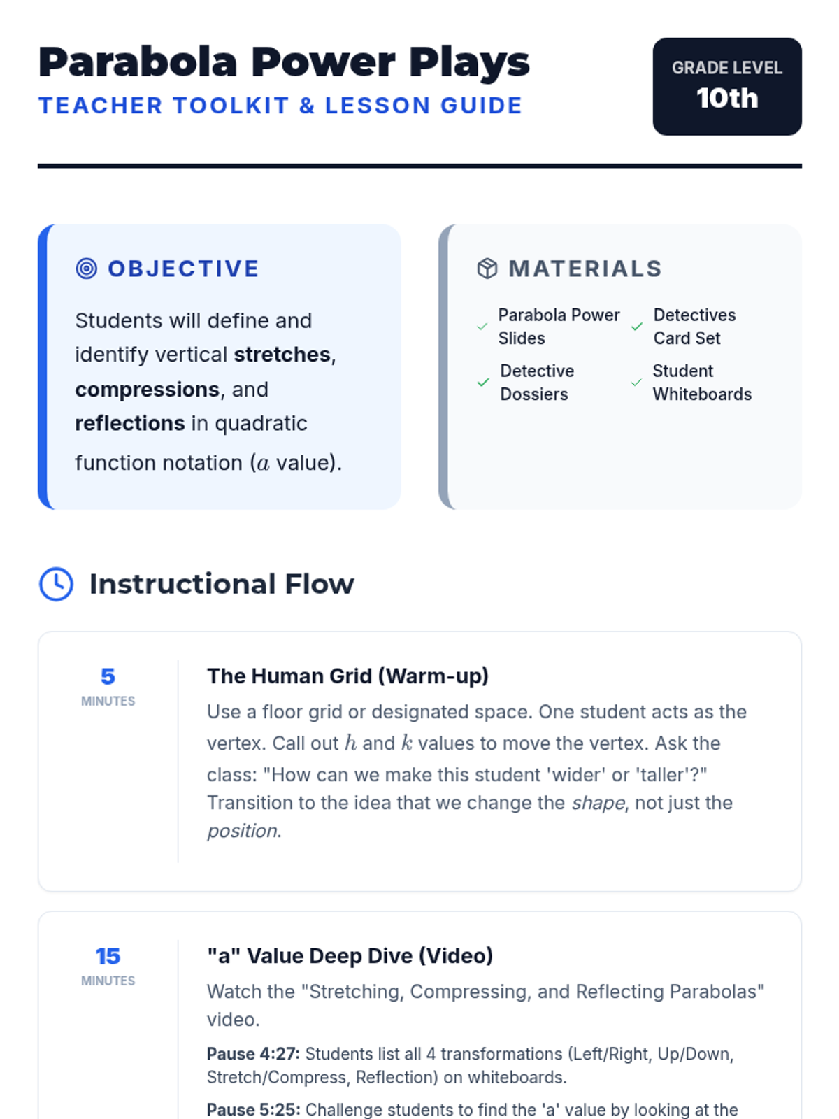 A 10th-grade Algebra II lesson focused on identifying vertical stretches, compressions, and reflections of parabolas using the 'a' value in vertex form. Students engage with physical modeling, video-guided practice, and a collaborative card-matching activity.
