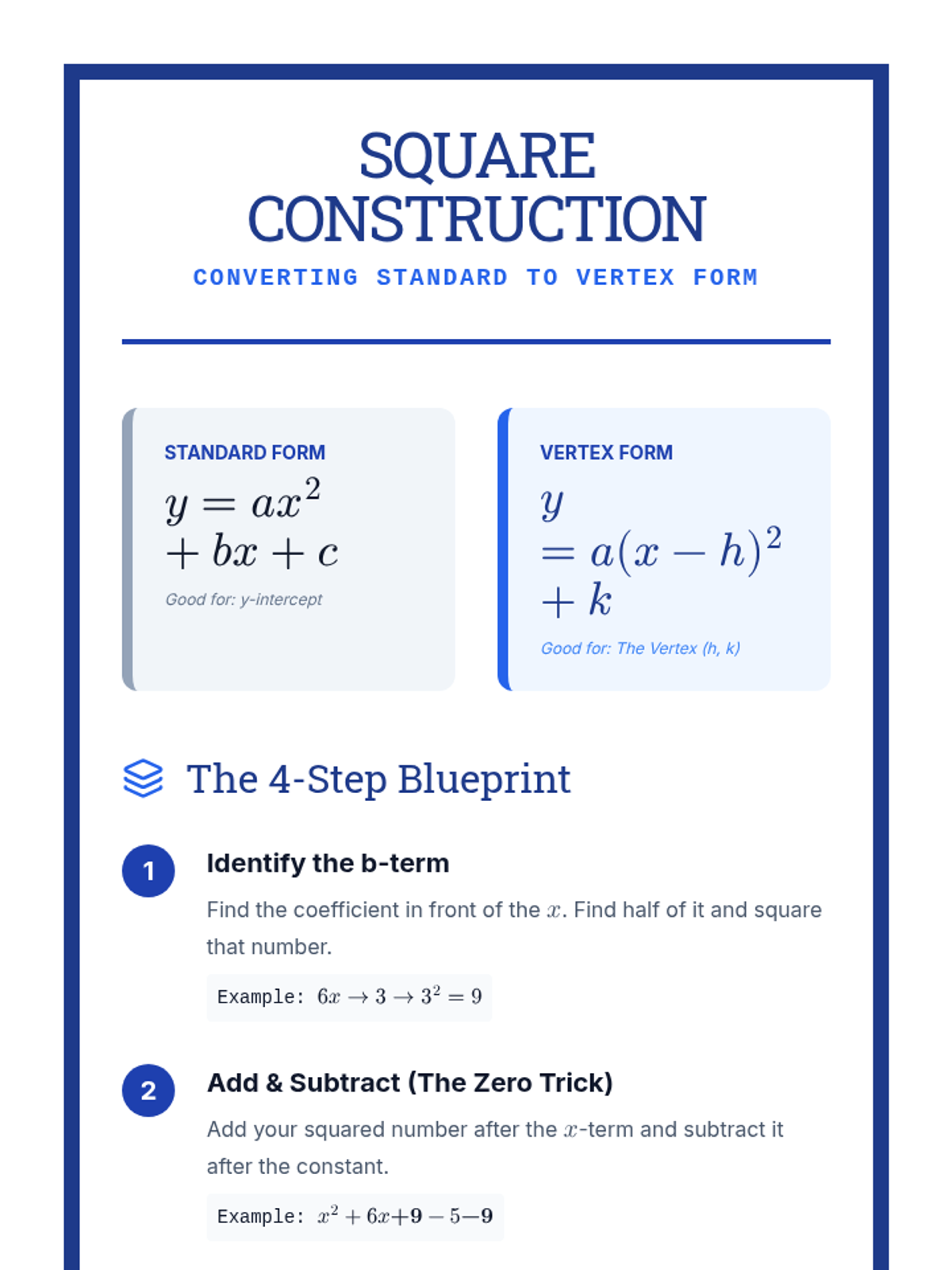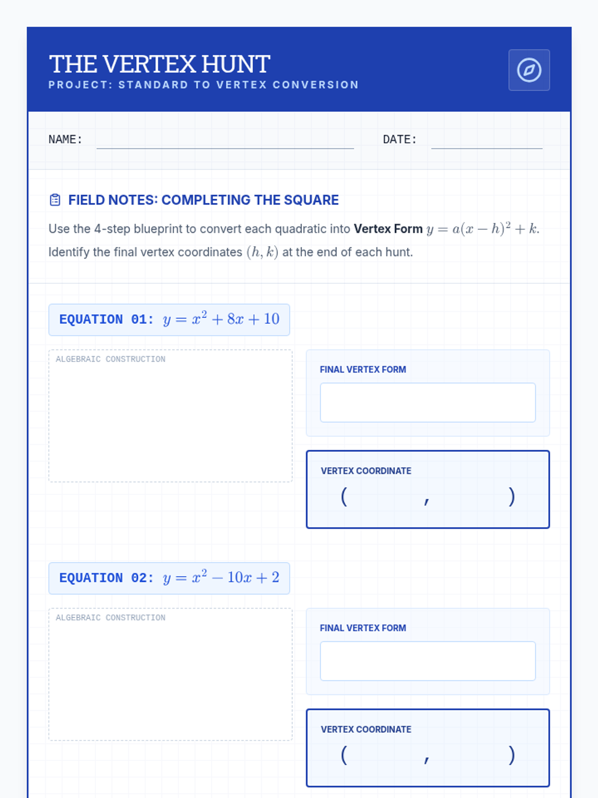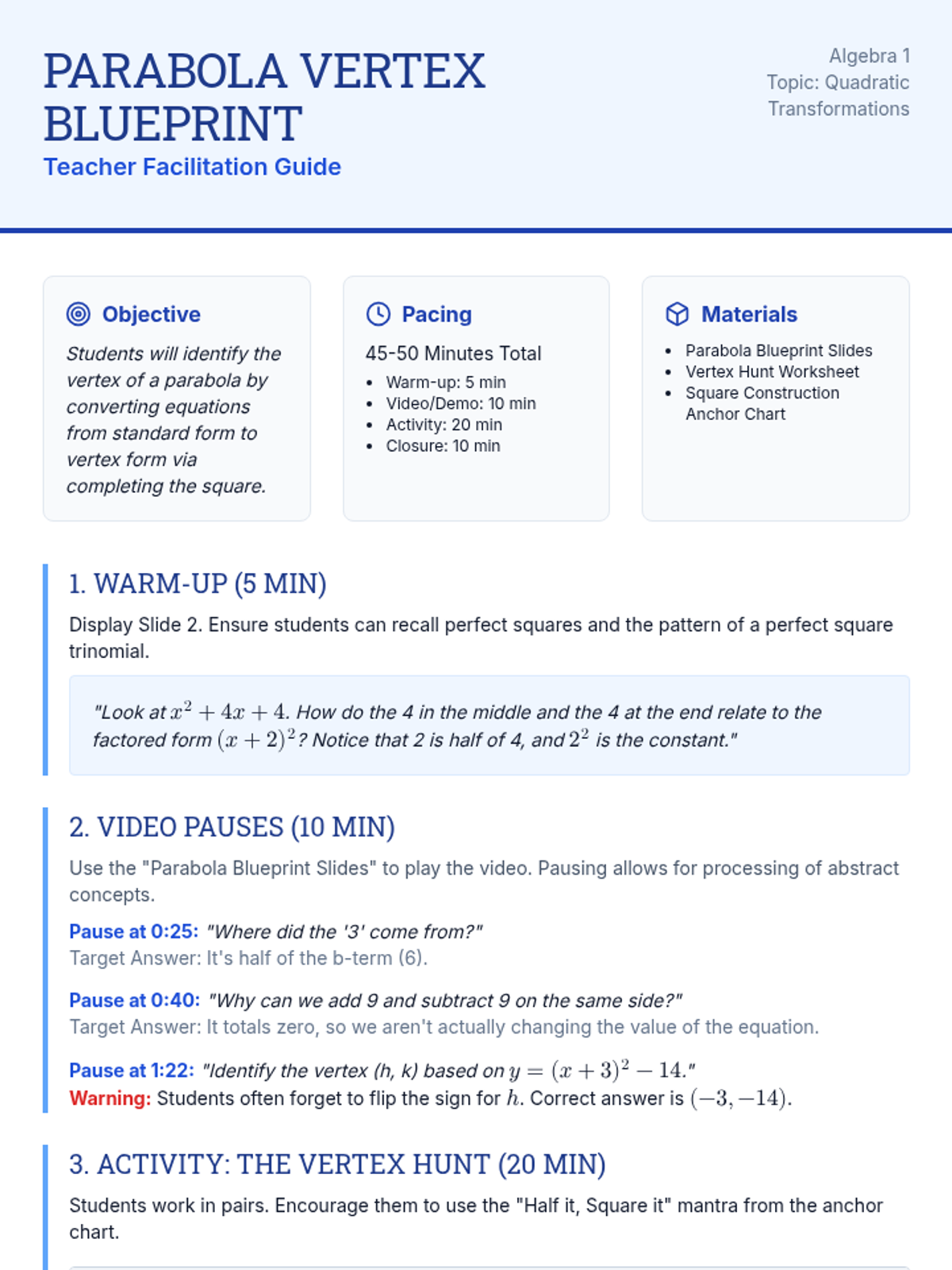 A comprehensive lesson on converting quadratic equations from standard form to vertex form using the completing the square method. Includes a slide deck with embedded video pauses, a guided student worksheet, a visual anchor chart, and a detailed teacher facilitation guide.