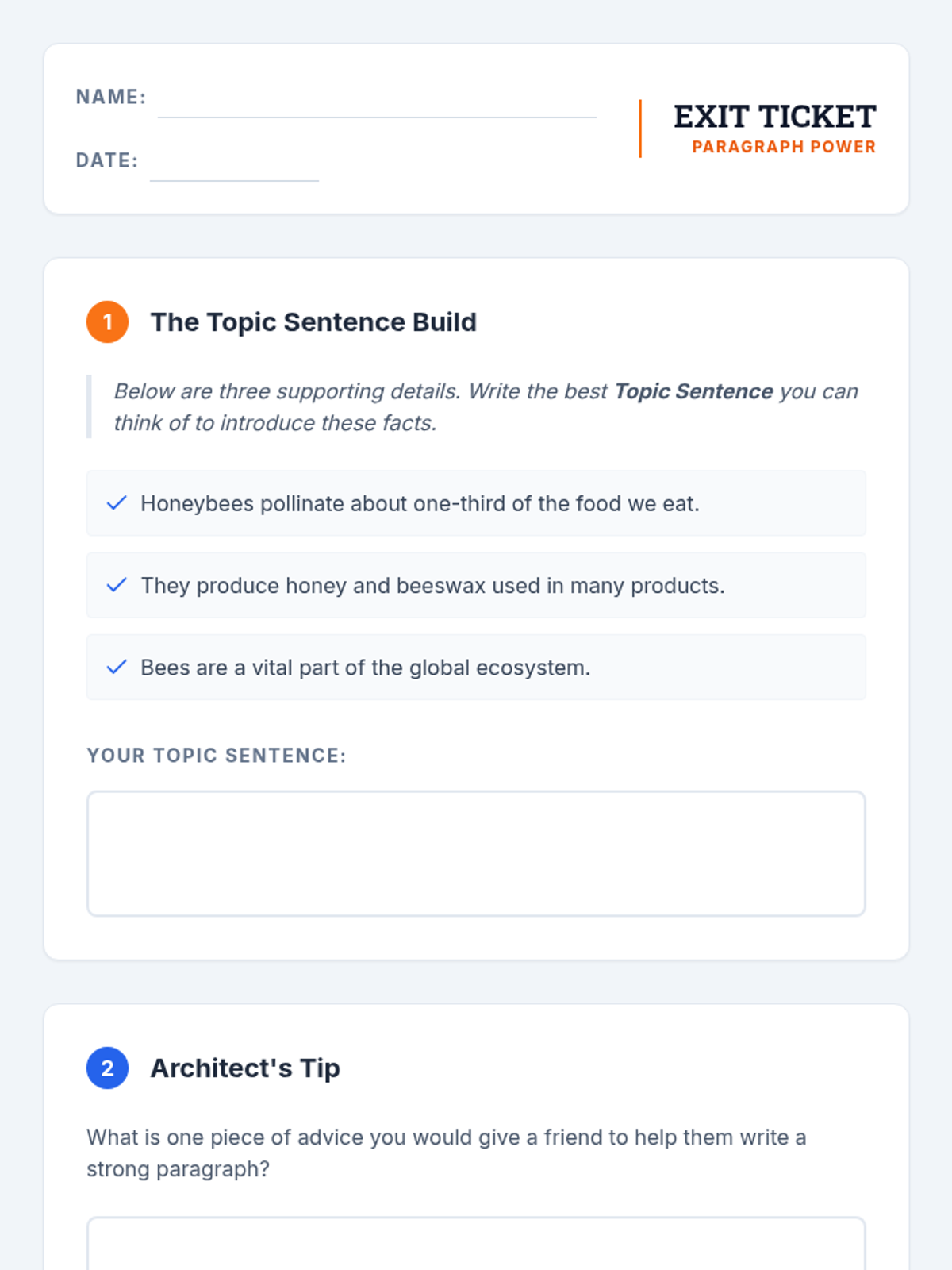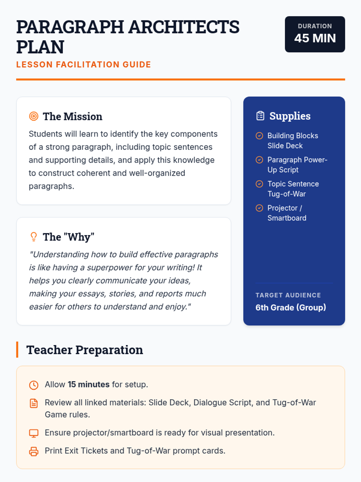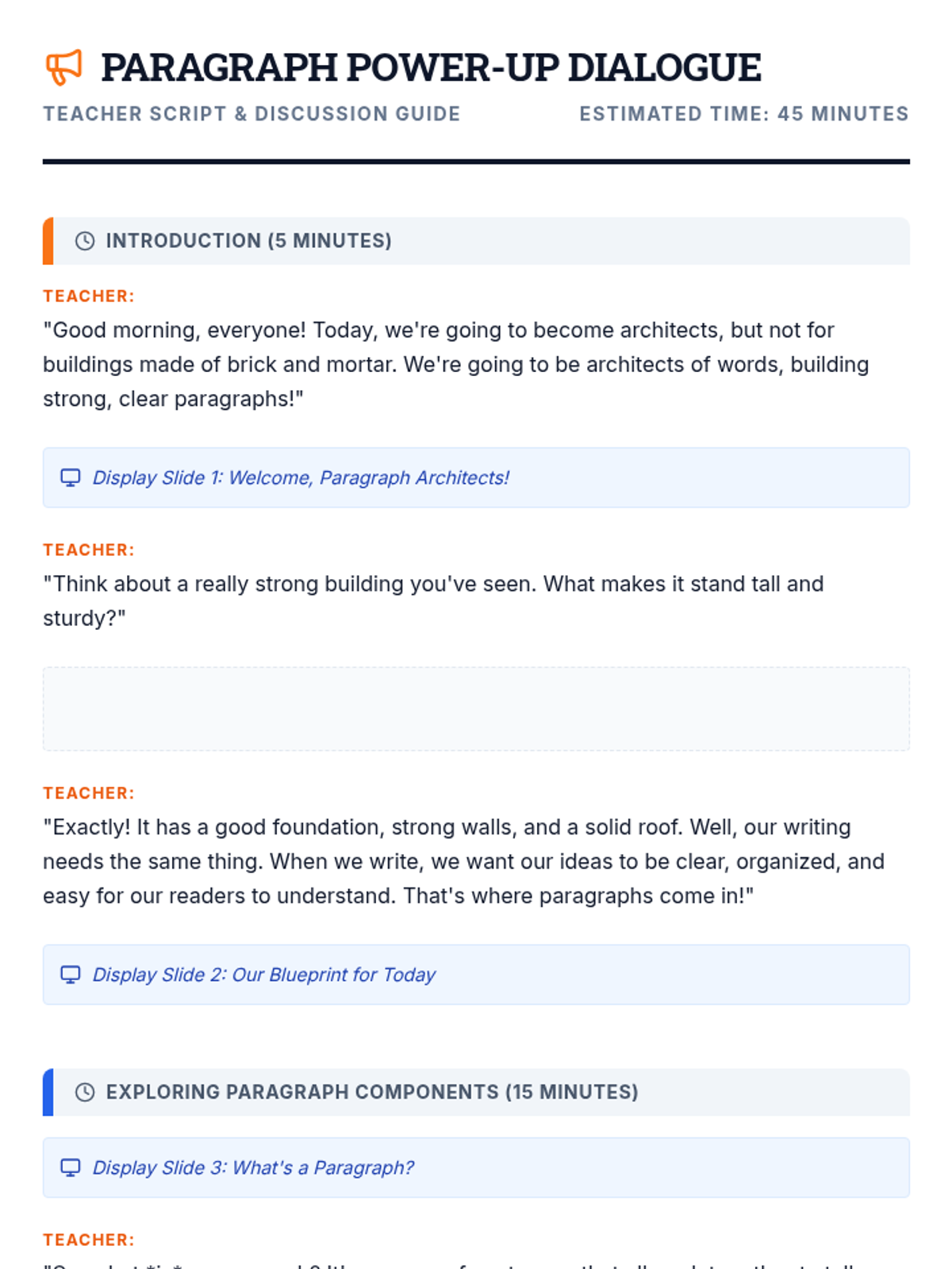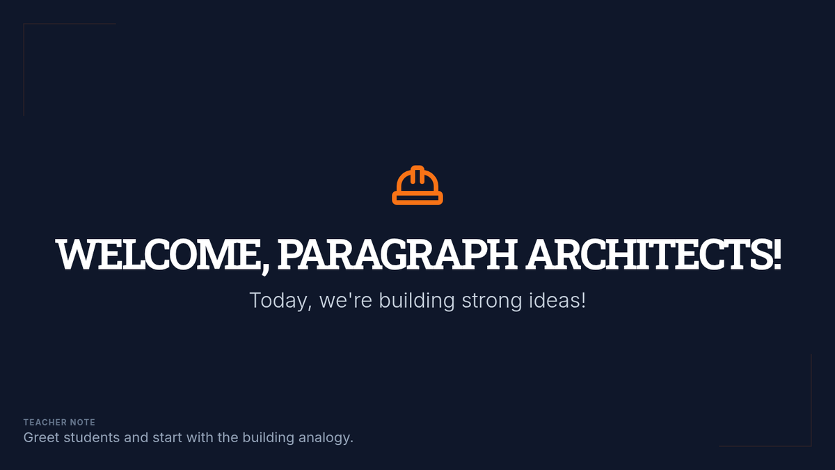 A 45-minute lesson for 6th graders to master paragraph structure through the lens of architectural design, focusing on topic sentences and supporting details.