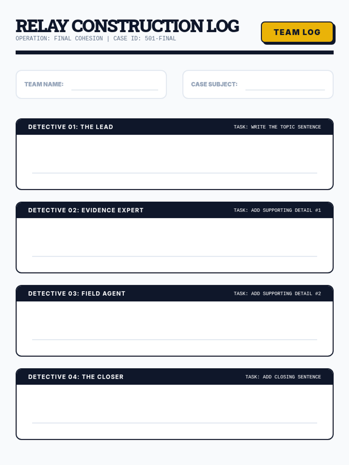 A collaborative relay activity where students build cohesive paragraphs sentence by sentence, ensuring all details align with the initial topic sentence.