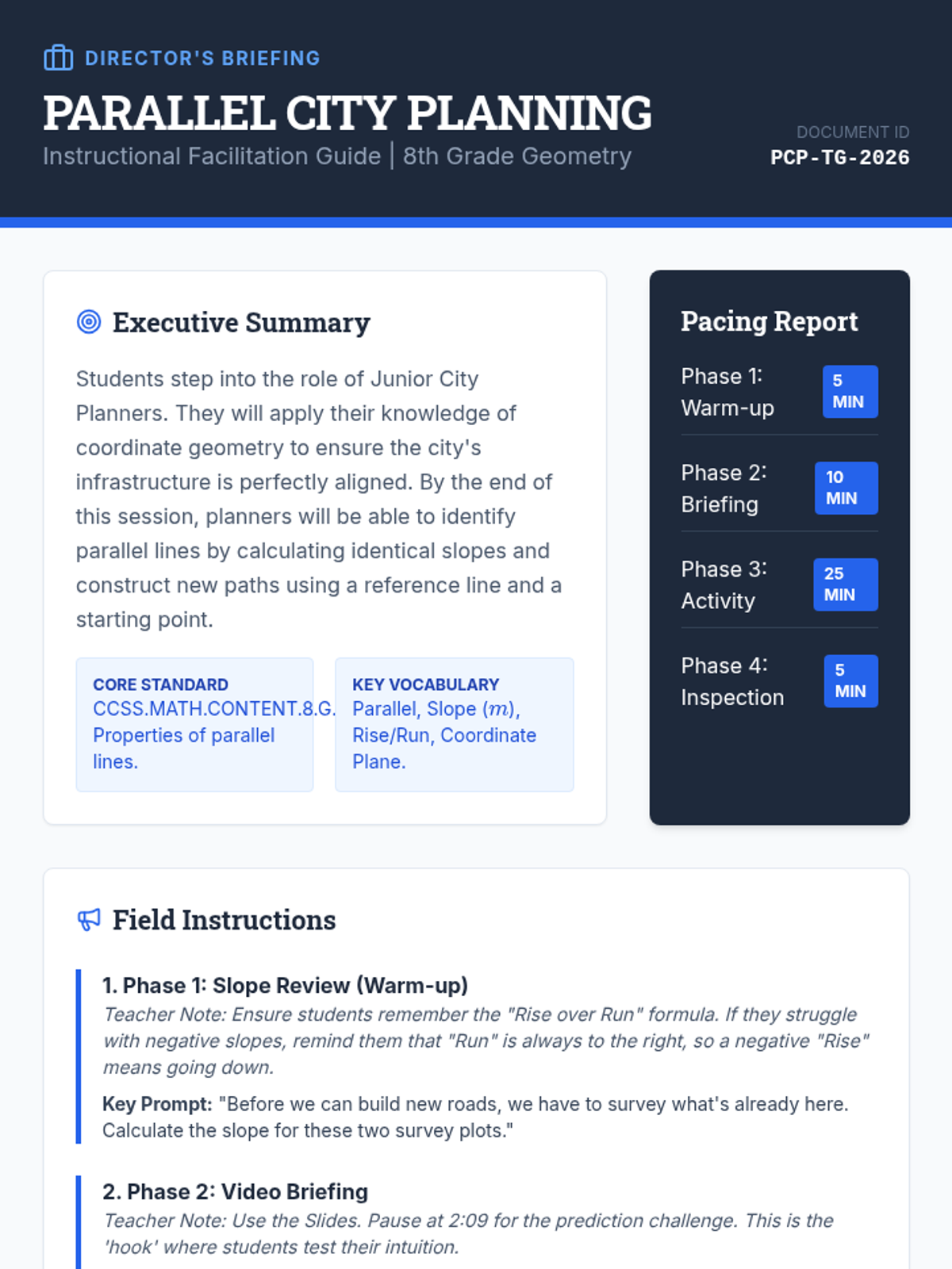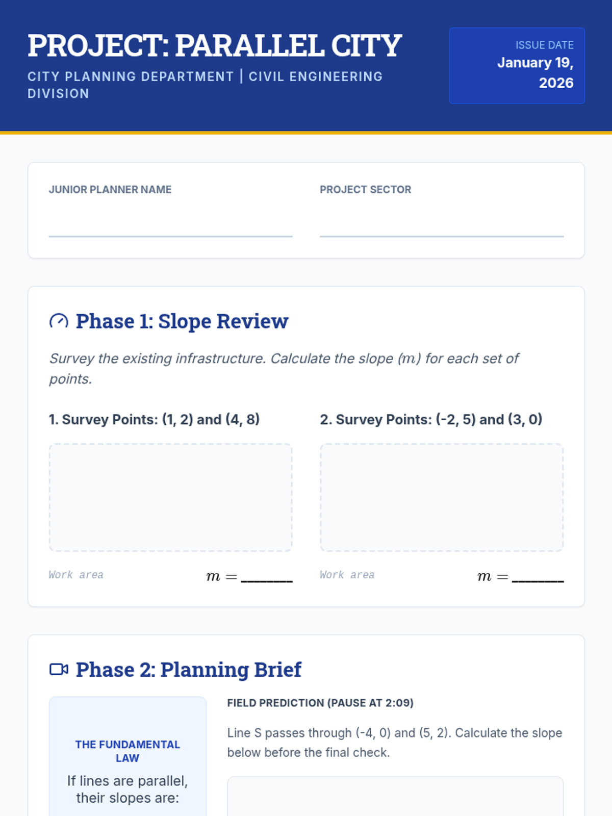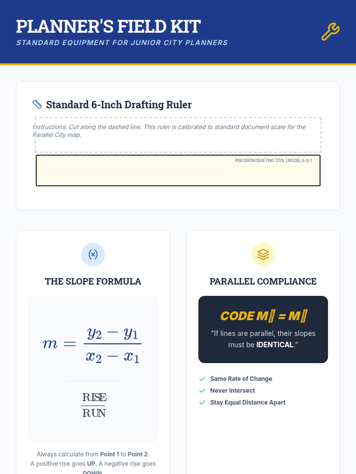 In this geometry-focused lesson, students act as city planners to explore the relationship between parallel lines and slope. Using coordinate geometry, they will calculate slopes, predict line behavior, and construct new parallel paths on a city map.