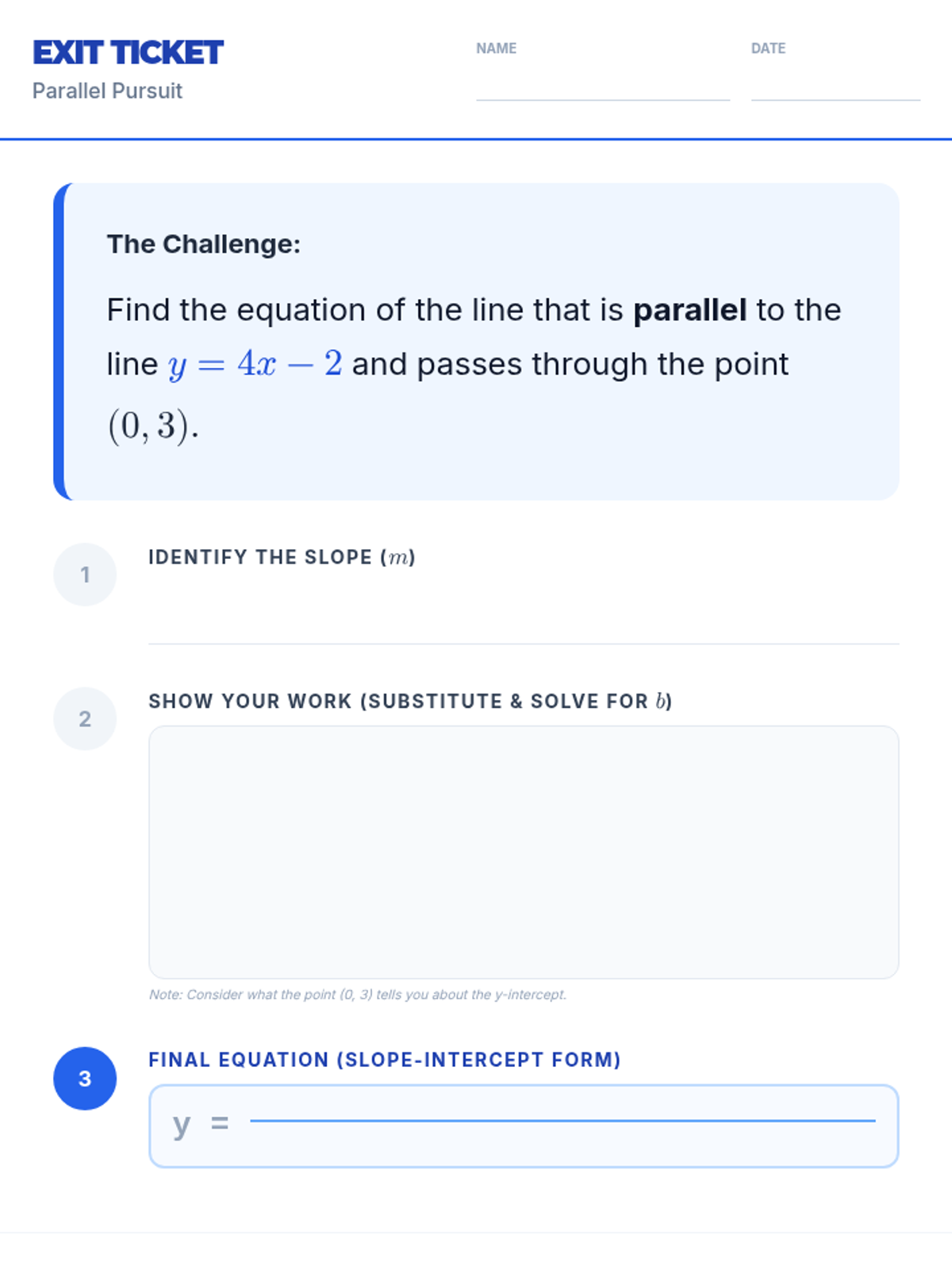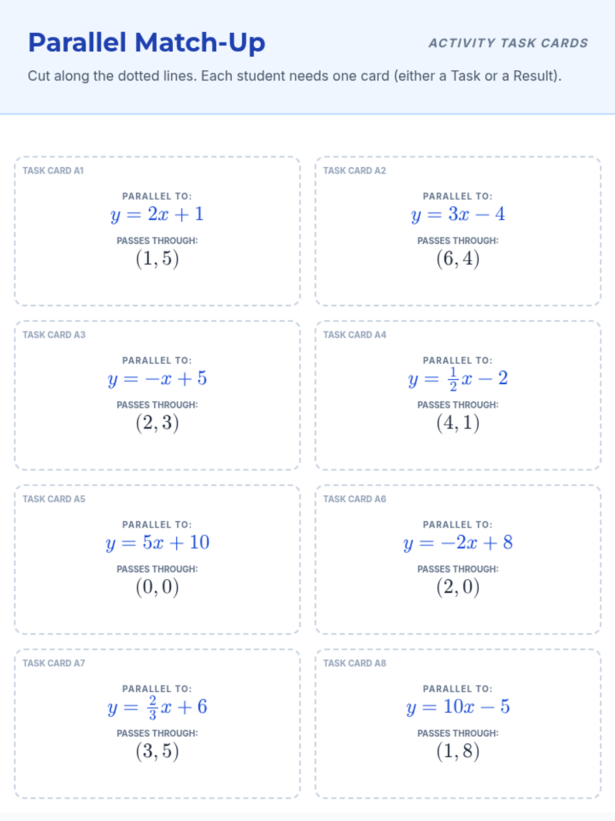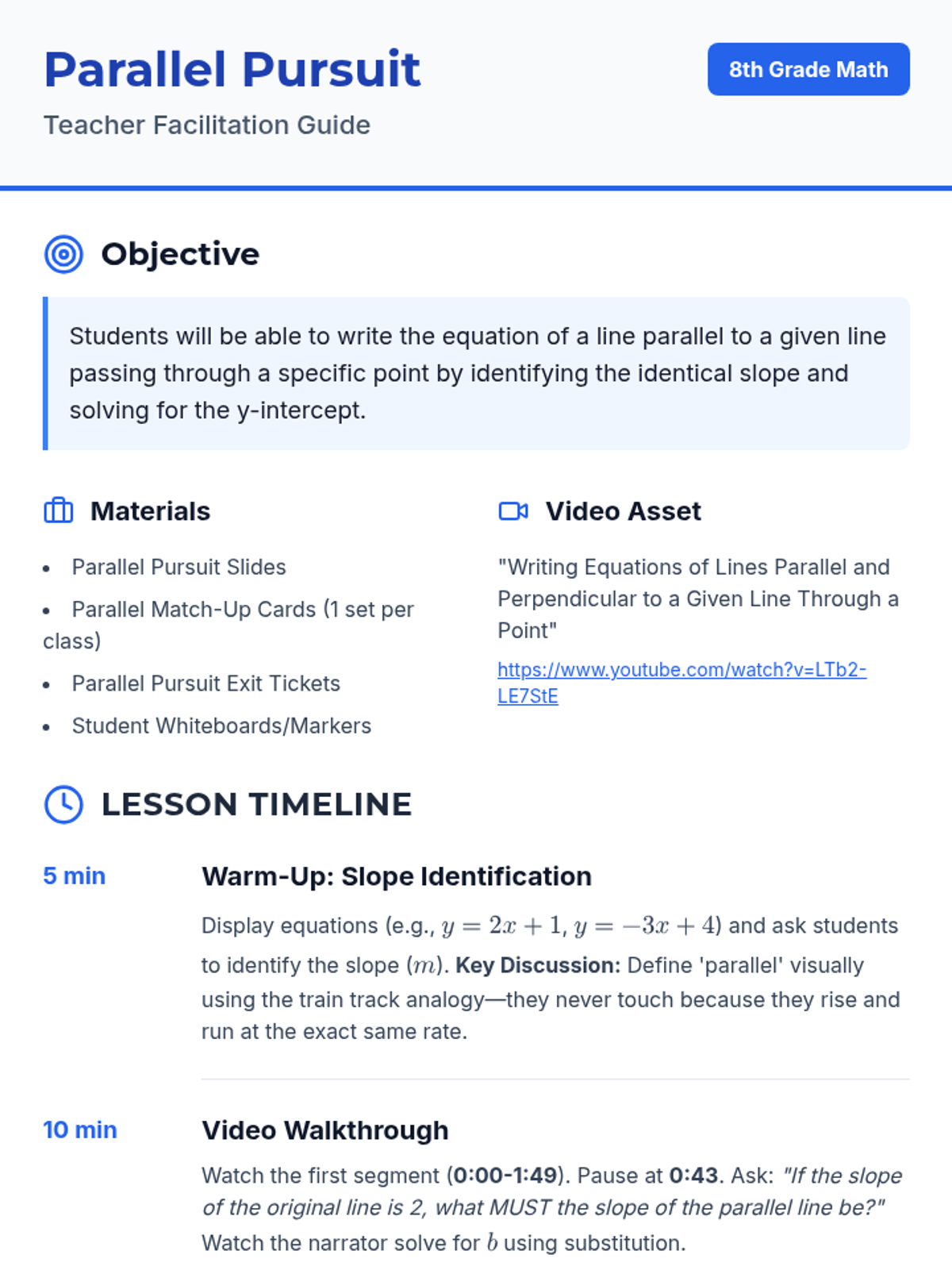A comprehensive lesson on writing linear equations for parallel lines passing through a specific point, featuring a video-based walkthrough and a 'Parallel Match-Up' collaborative activity.