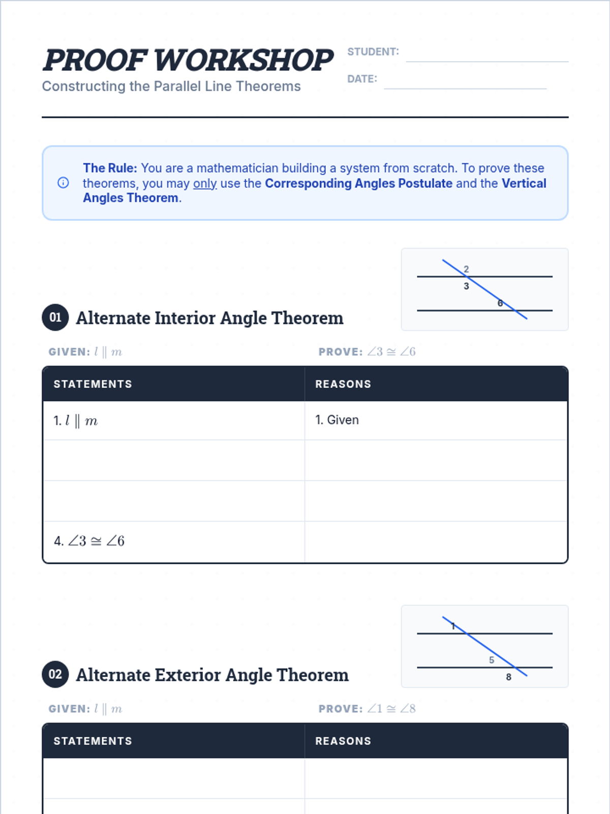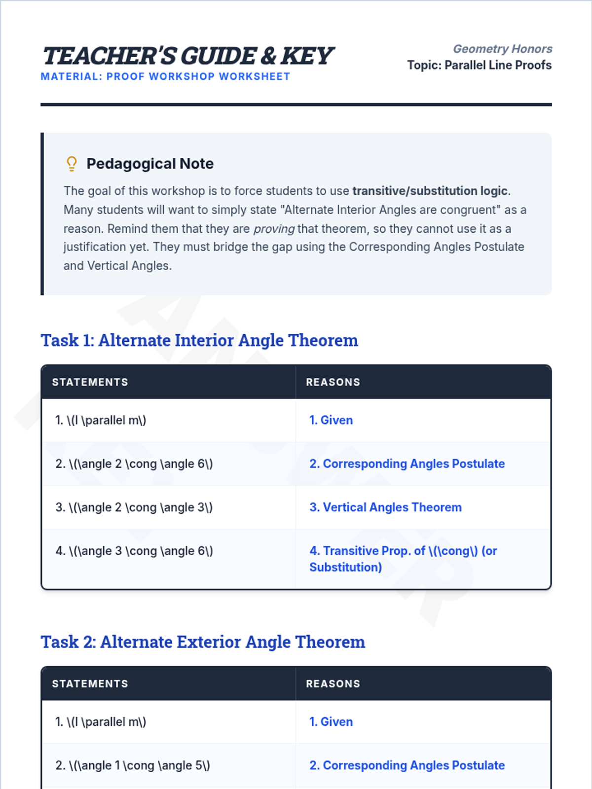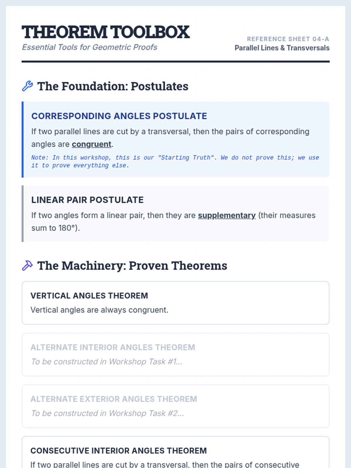 A high-school honors geometry lesson focusing on the formal construction of parallel line proofs using the Corresponding Angles Postulate as a foundation.