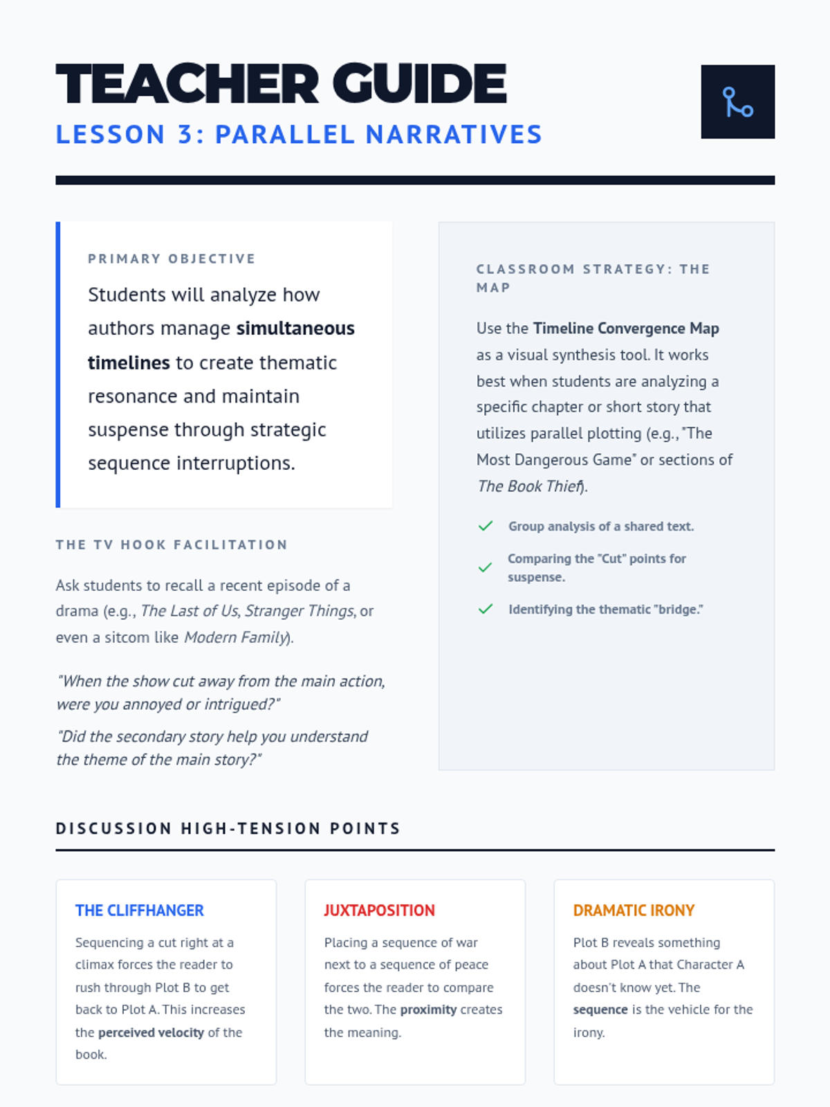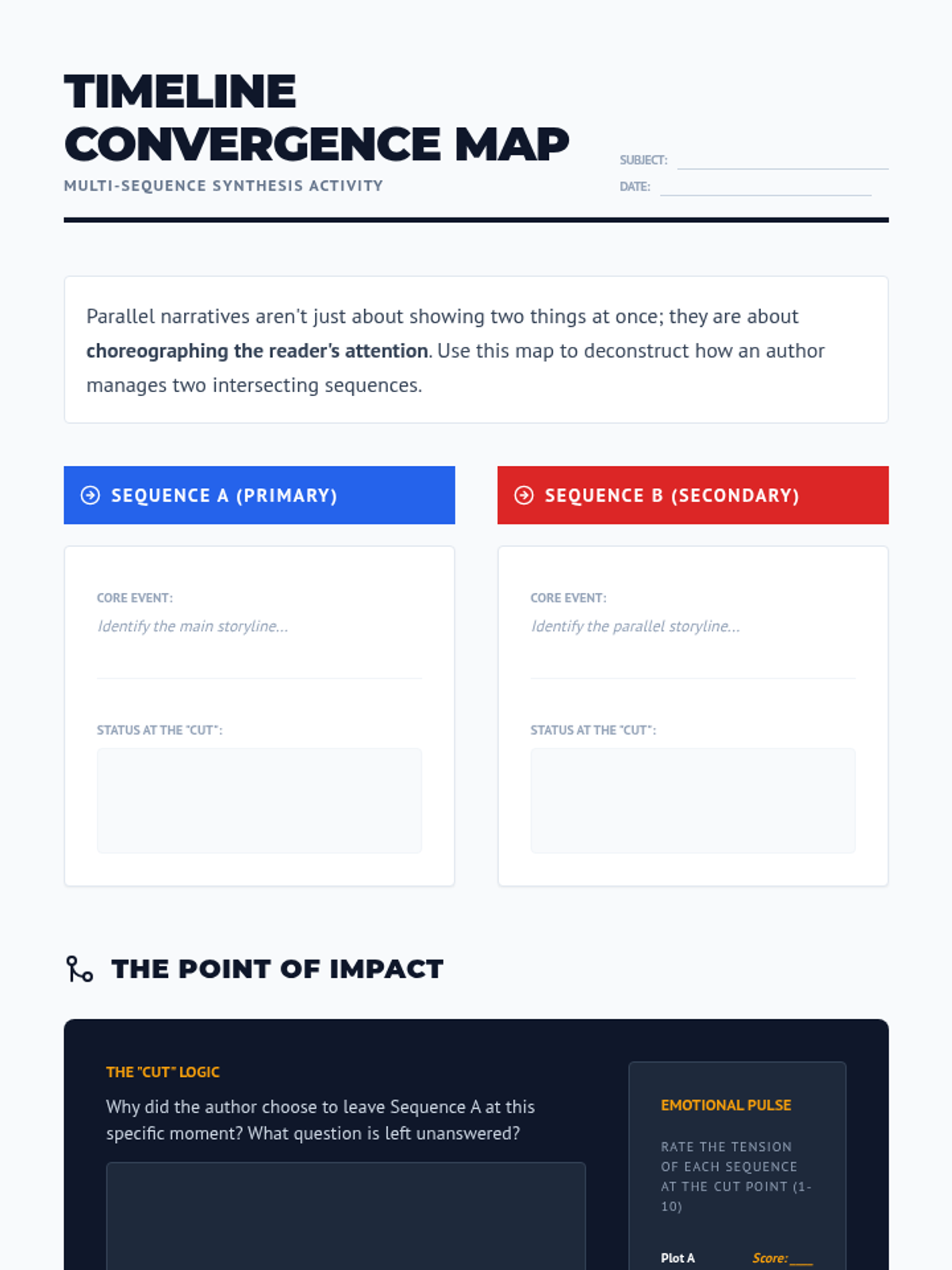 Analyze texts with multiple simultaneous sequences, focusing on how authors choose 'cut points' to maximize thematic resonance.